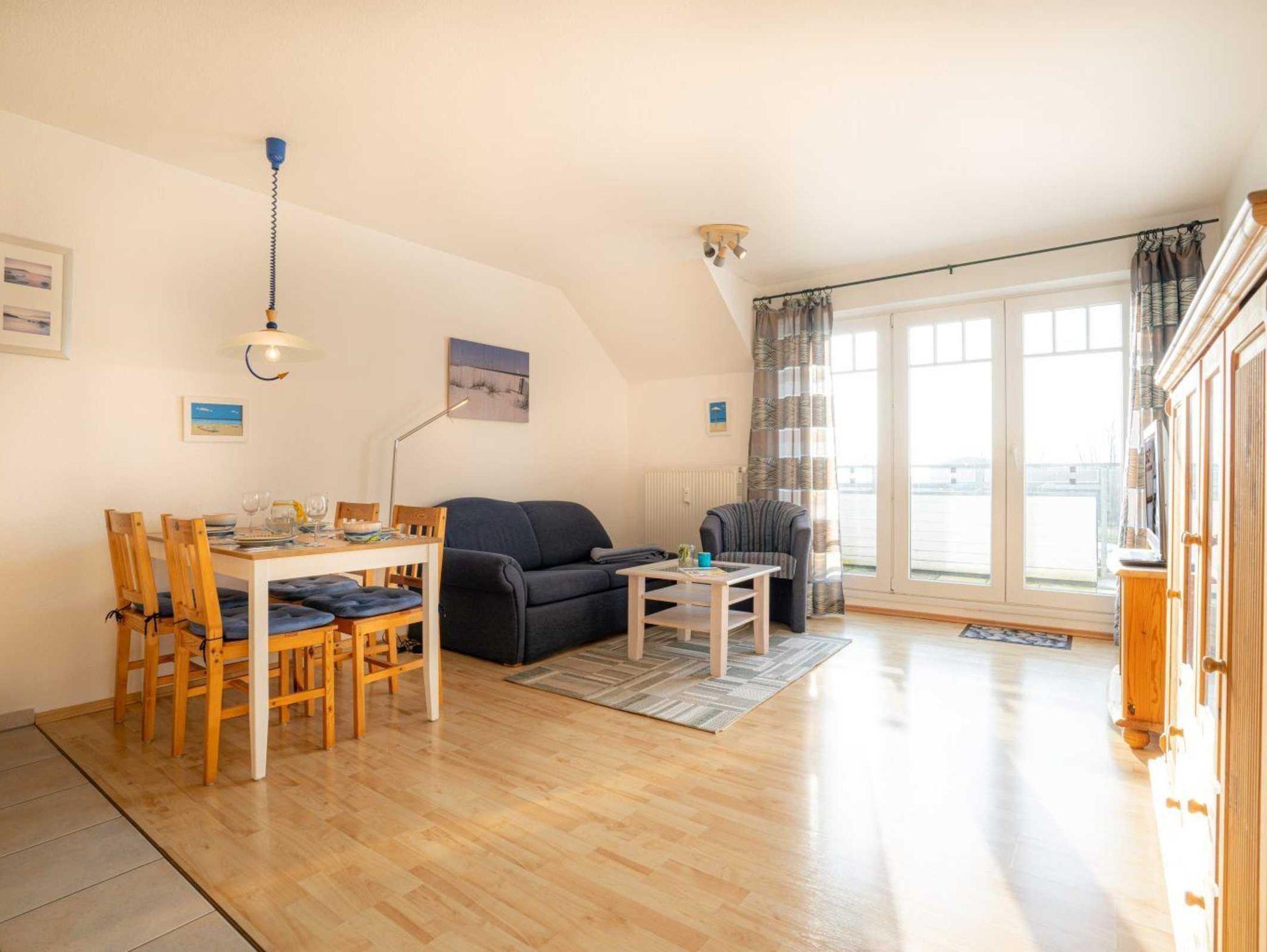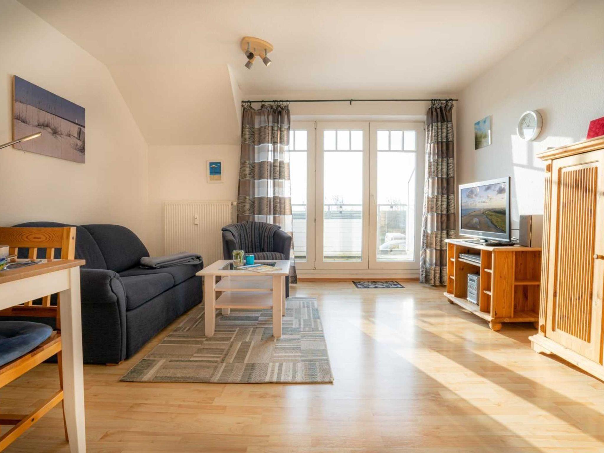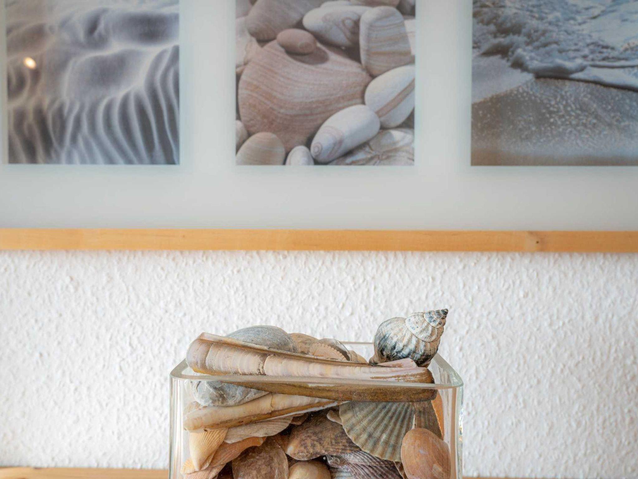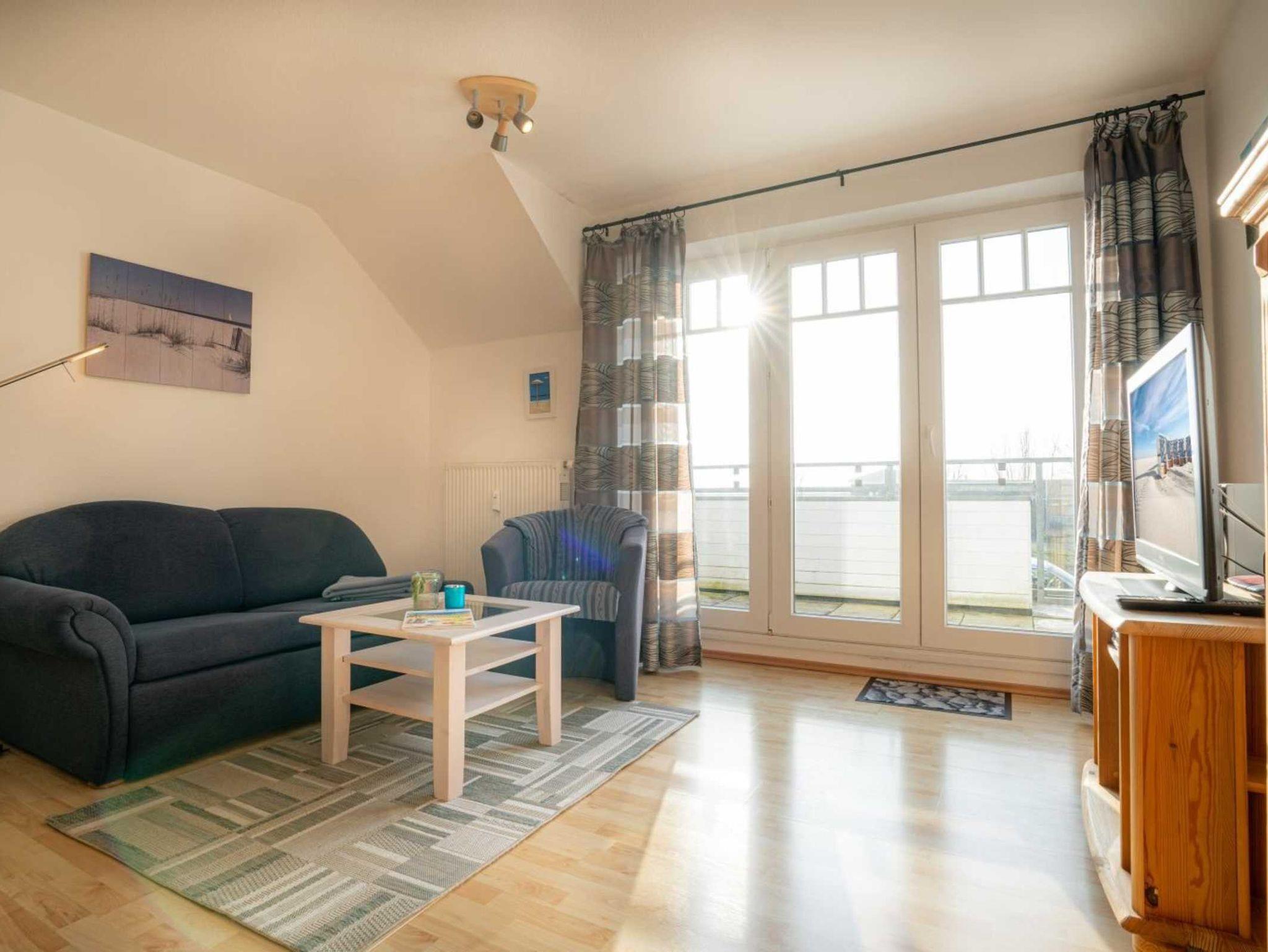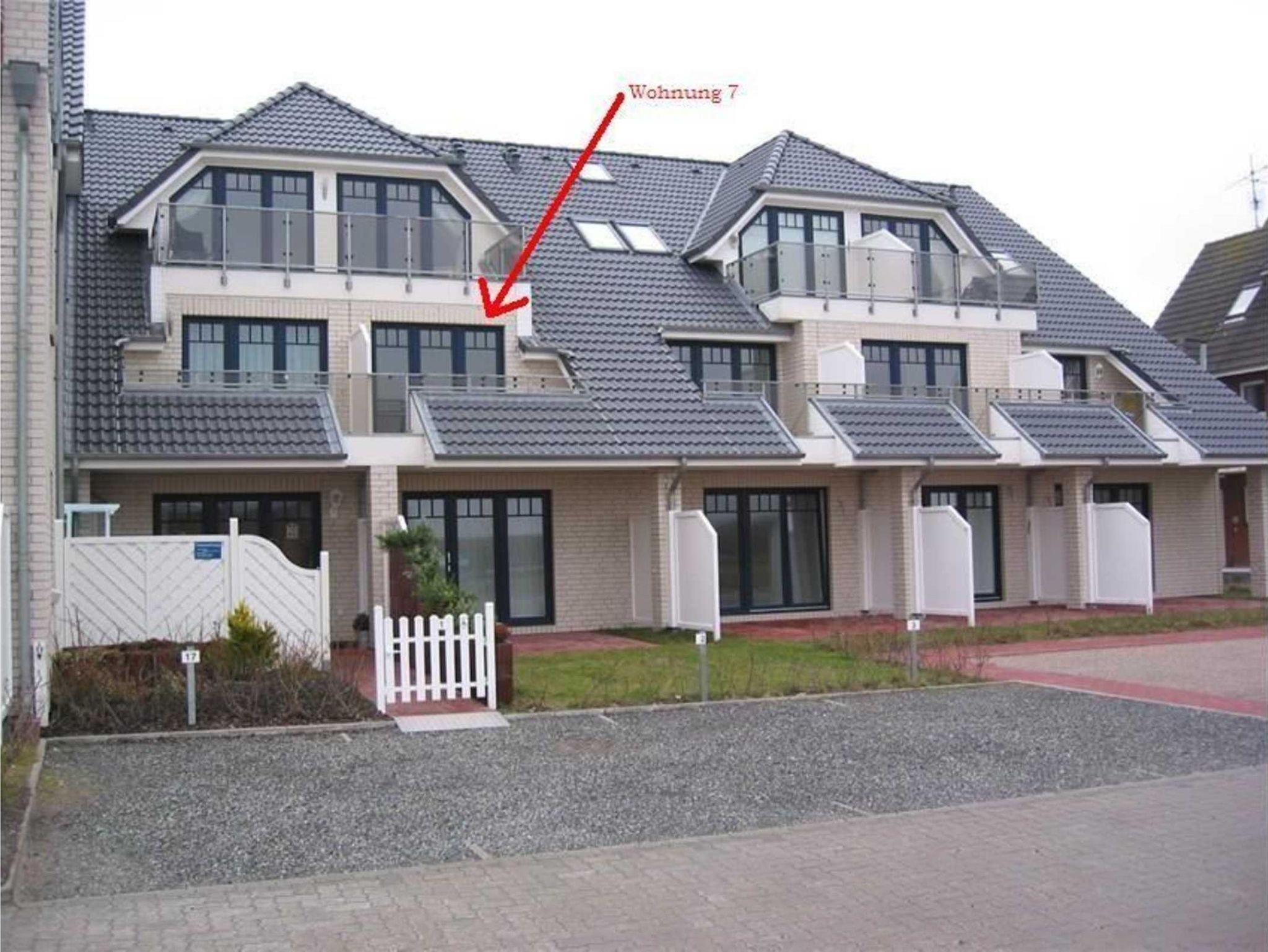 Wohnzimmer mit Sofa, Sessel, TV (Sat), DVD-Player, Stereo-Kompaktanlage mit CD-Player und Esstisch mit 4 Stühlen. Direkter Zugang zum windgeschützten, möblierten Südbalkon mit schönem Ausblick über den Deich in Richtung Meer. Offene Küche mit Backofen, Geschirrspüler und Kühlschrank mit Gefrierfach.
