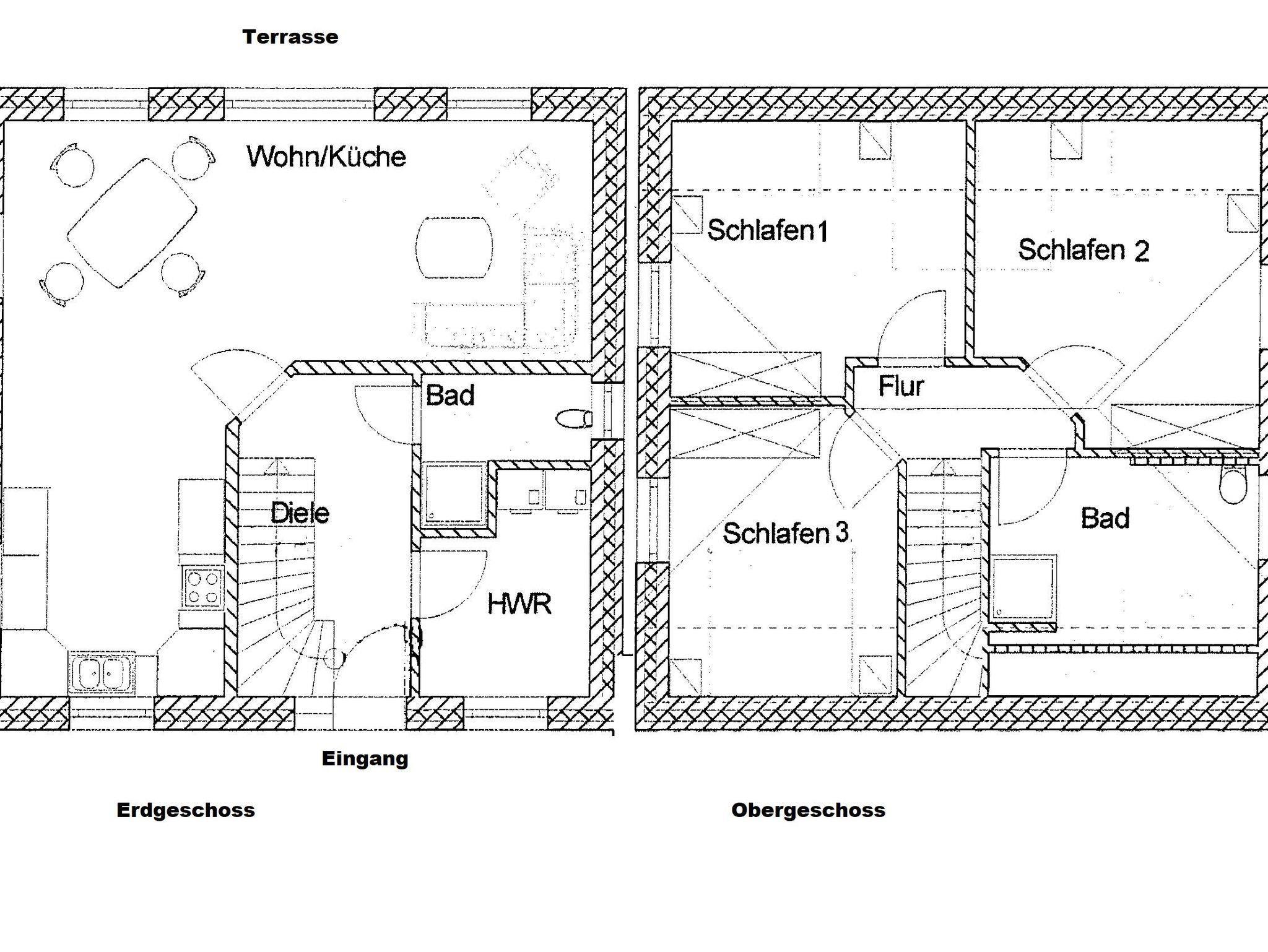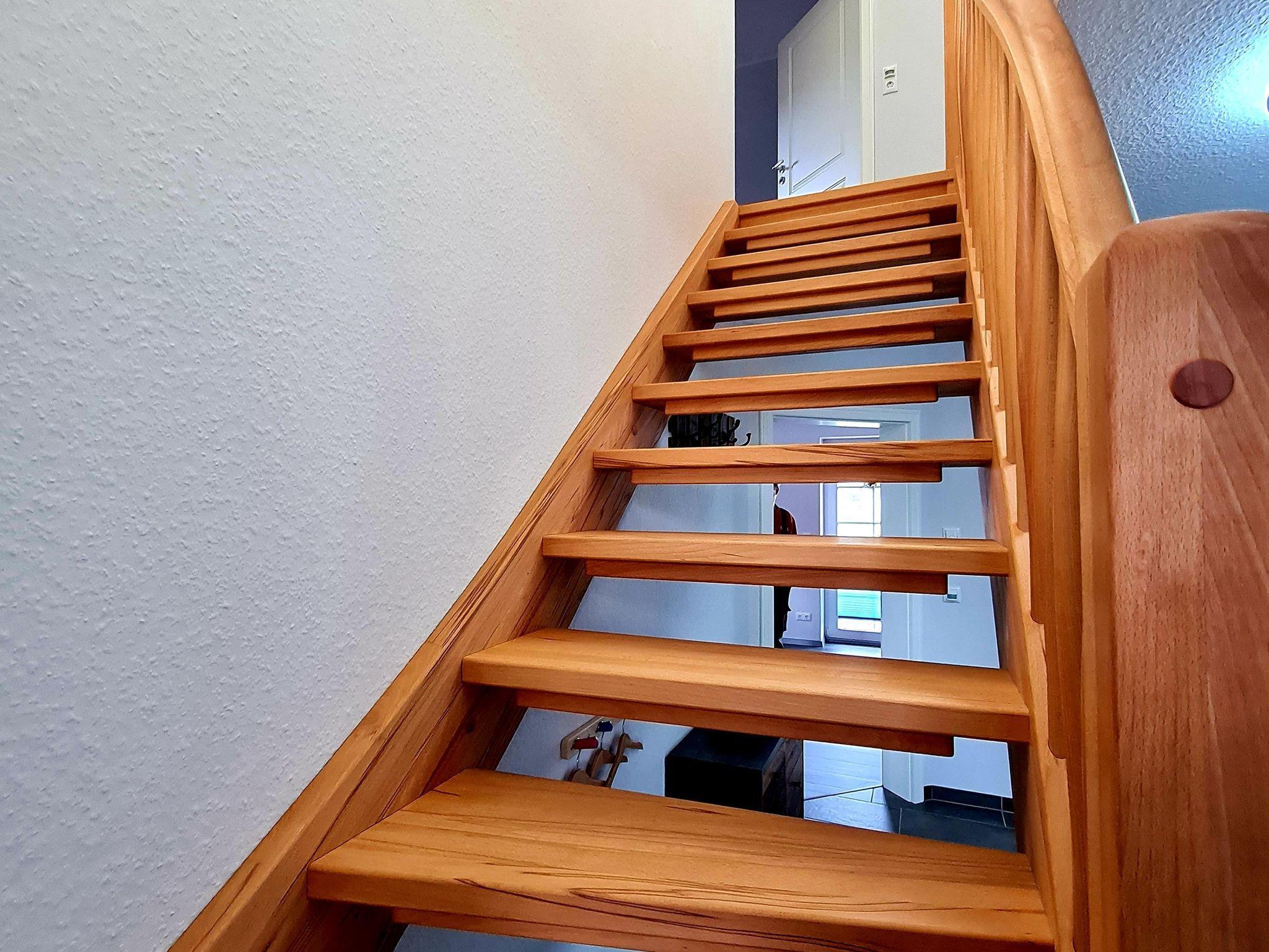 Über eine schöne Buchentreppe gelangen Sie in das Obergeschoss mit seinen drei Schlafräumen (zwei mit je zwei Einzelbetten, die zusammengestellt werden können und eines mit einem Doppelbett), die mit Nachttischen und großen Schränken ausgestattet sind.