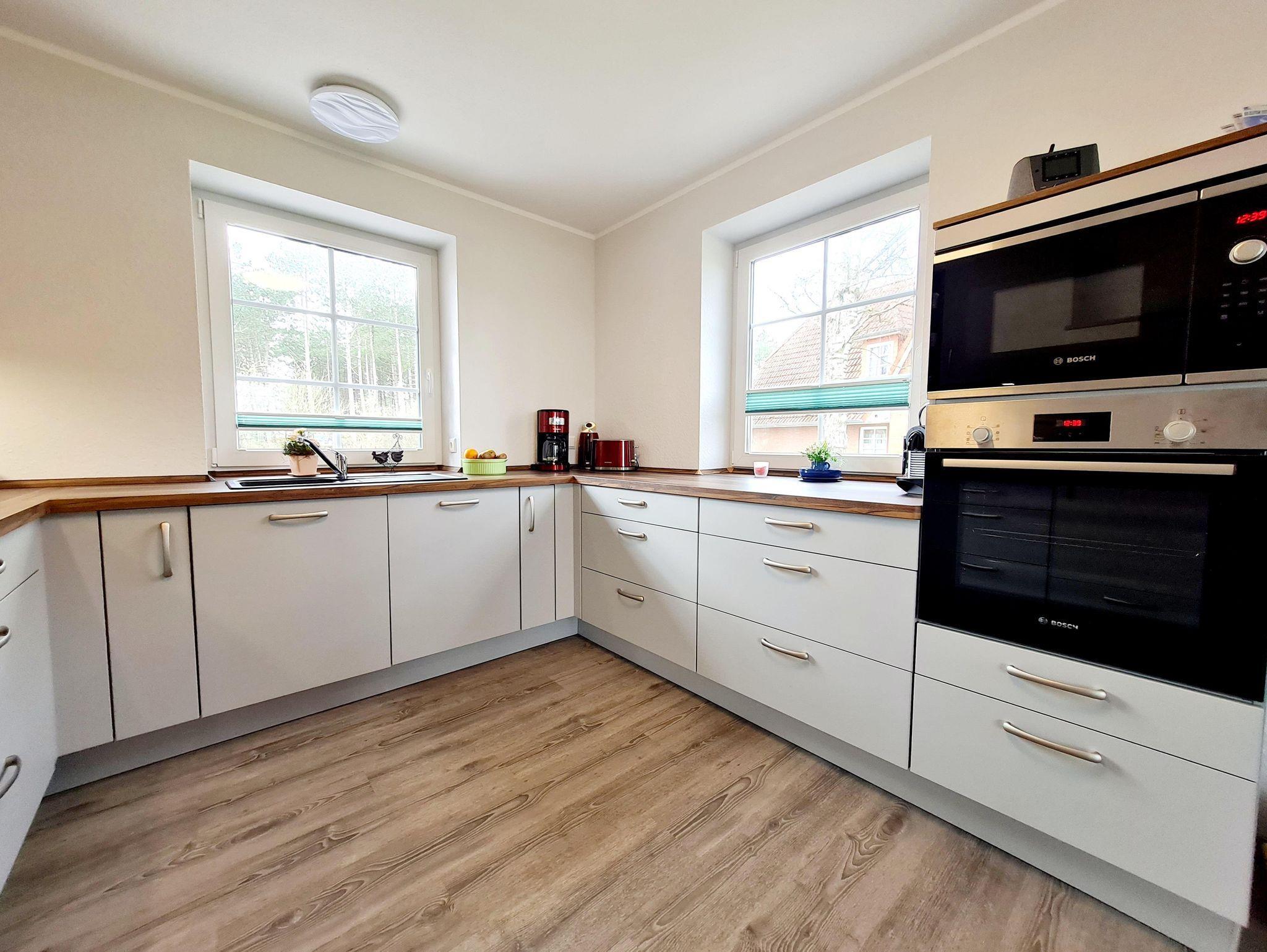 Die Küche ist komplett mit Herd (Cerankochfeld, 4 Flammen), Backofen, Mikrowelle, Geschirrspüler und Kühlschrank ausgestattet. Selbstverständlich sind Kaffeemaschine, Kaffeekapselmaschine (Nespresso), Wasserkocher und Toaster vorhanden.