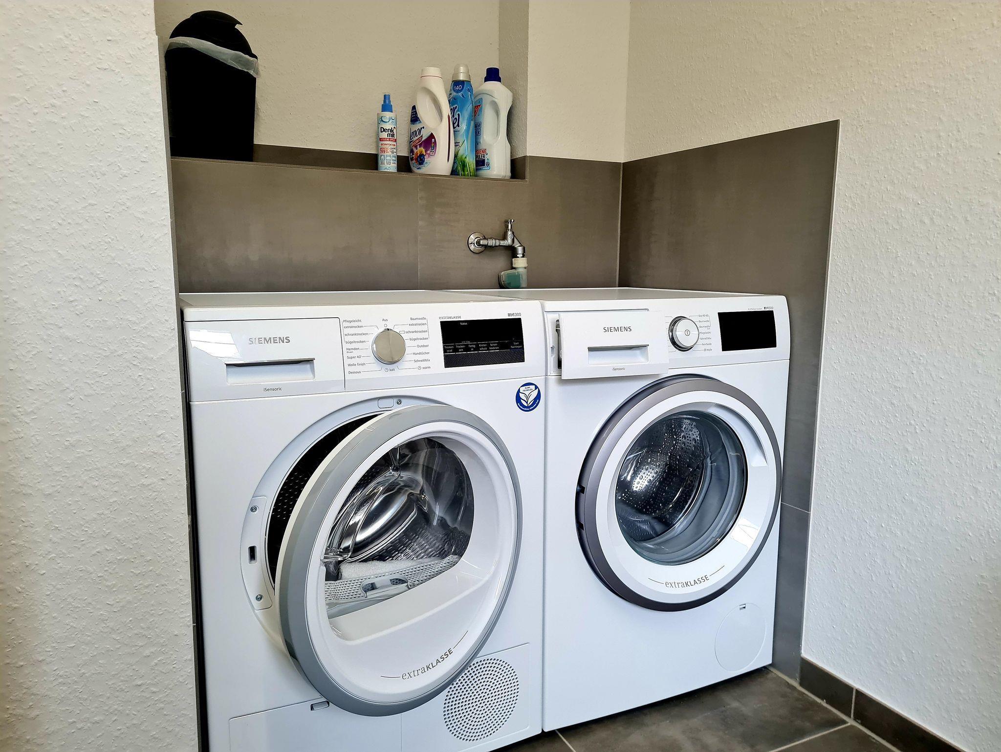 Waschmaschine und Trockner stehen im Hauswirtschaftsraum zur kostenlosen Nutzung zur Verfügung.