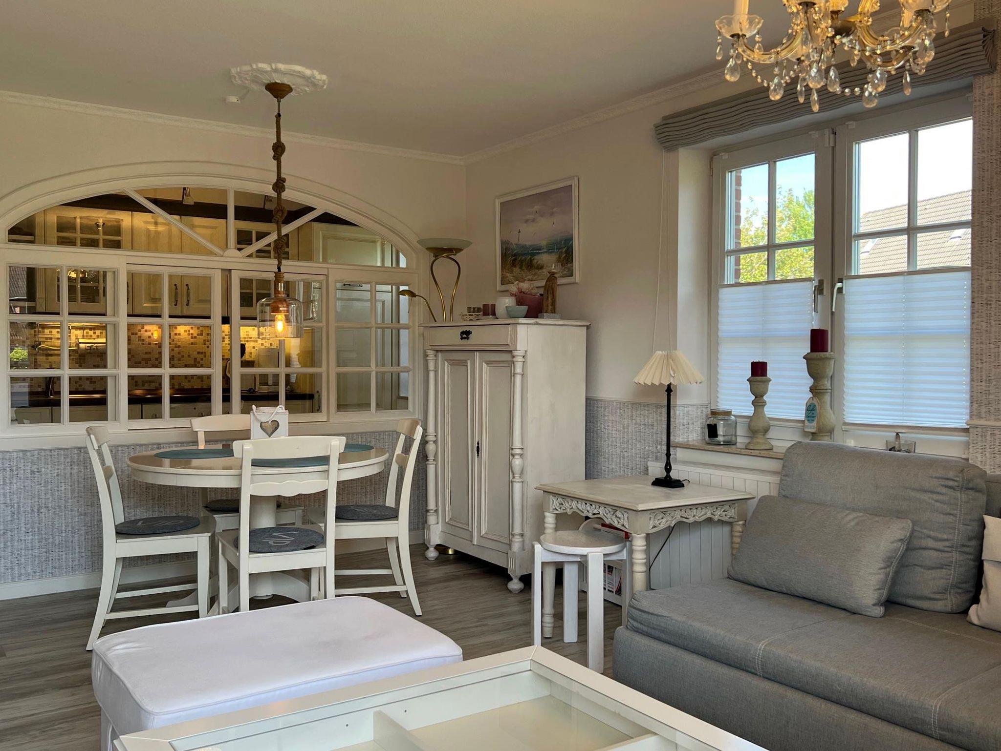 Im Wohnzimmer befinden sich 2 Sofas, eins davon ist ein Schlafsofa mit hohen Liegekomfort, ein Couchtisch, 4K-Smart-Fernseher und 4K-Blu ray DVD-Player, Mini-Stereoanlage, sowie ein gemütlicher, runder Esstisch. Auch im schönen Schlafzimmer mit Doppelbett ist für Entertainment gesorgt, mit einem Smart-Fernseher inkl. DVD. Die Küche, im Landhausstil, ist getrennt vom Wohnzimmer, aber durch viele Fenster ( mit Durchreiche ) zwischen den beiden Räumen sichtbar. Dies gibt dem Wohnraum einen besonderen Flair. Einen Clou hält das mit Fußbodenheizung ausgestattete Badezimmer bereit. Eine begehbare Dusche mit zwei Duschvorrichtungen, so können 2 Personen gleichzeitig duschen. Sehr praktisch.