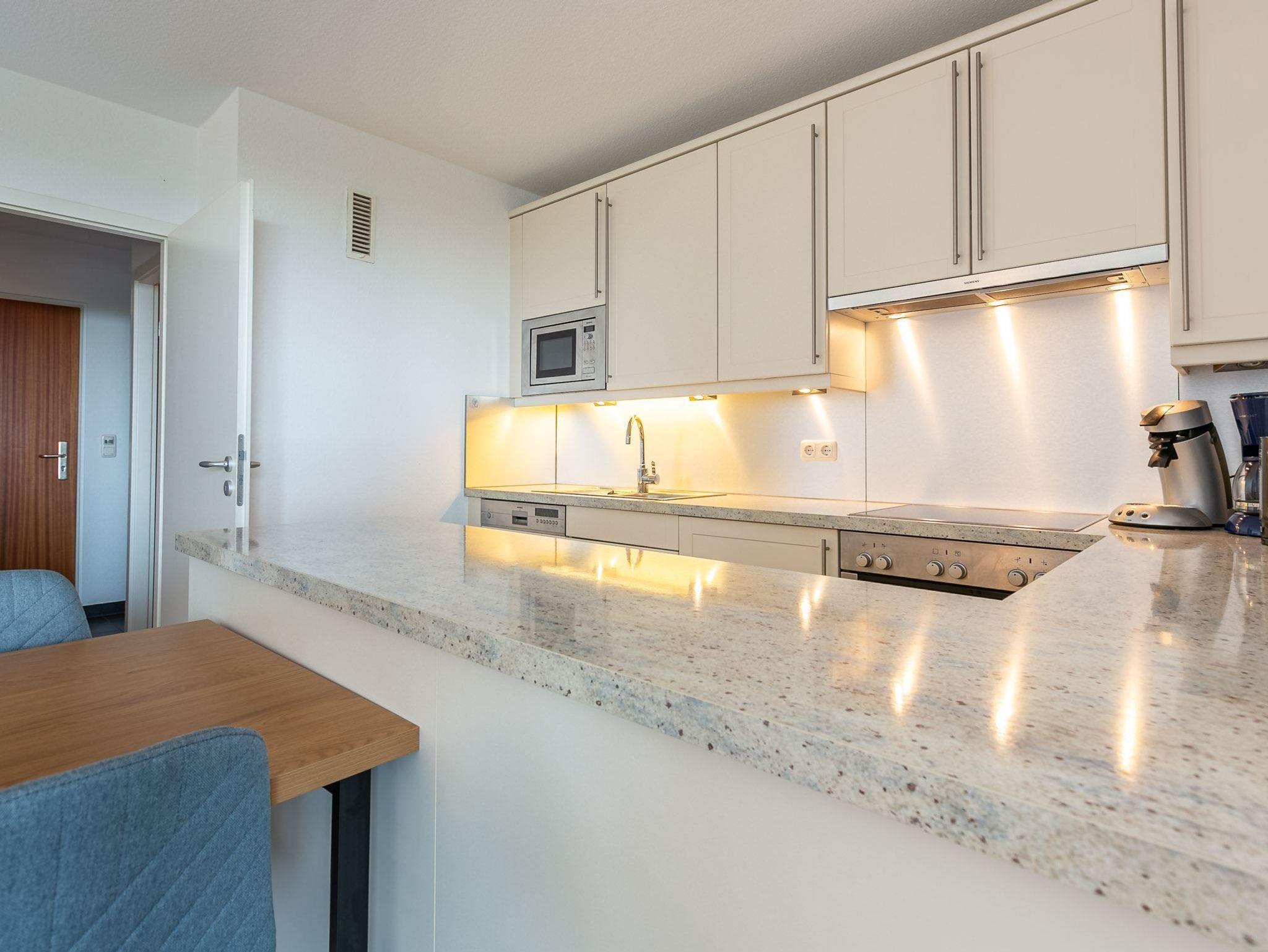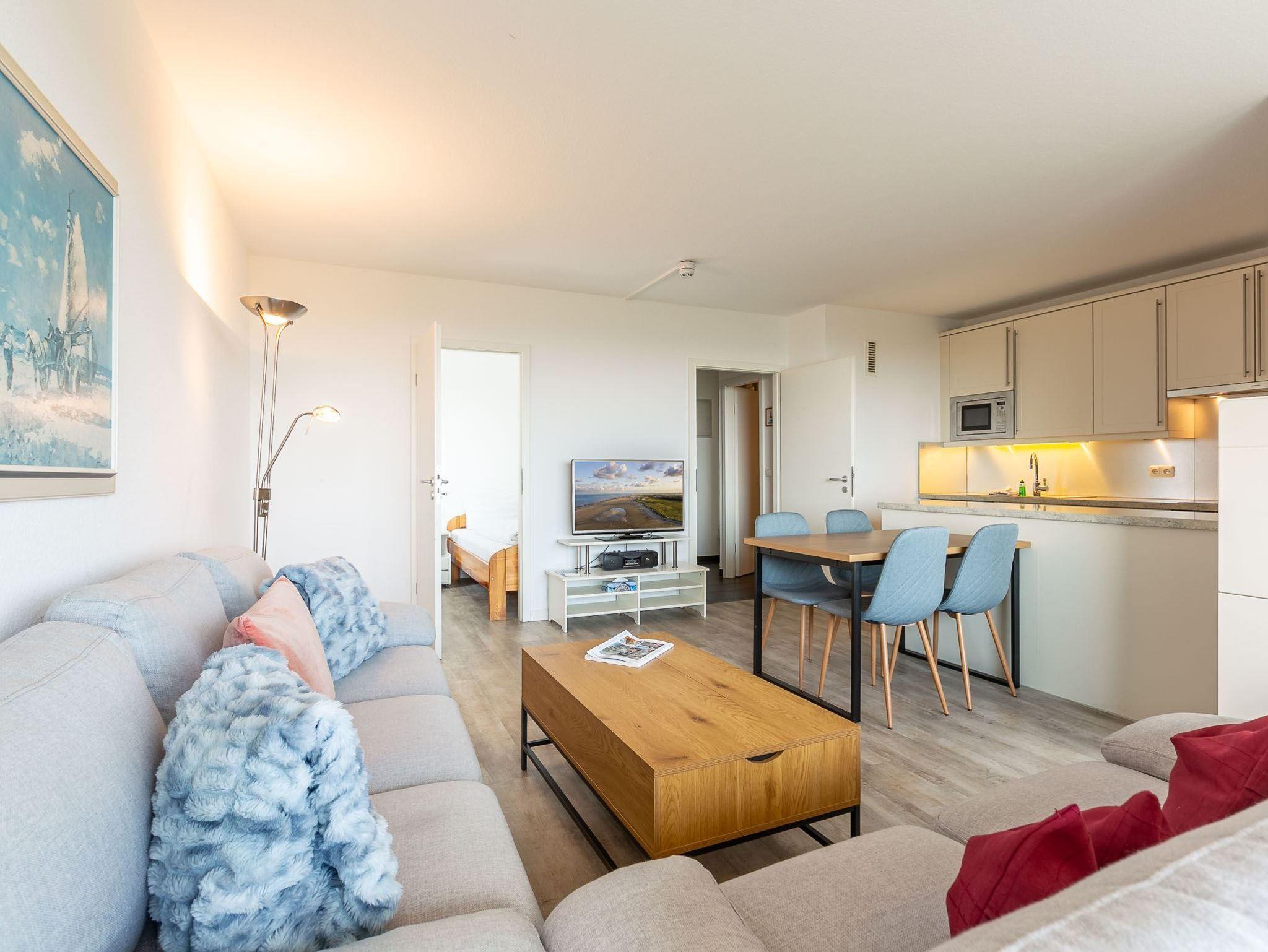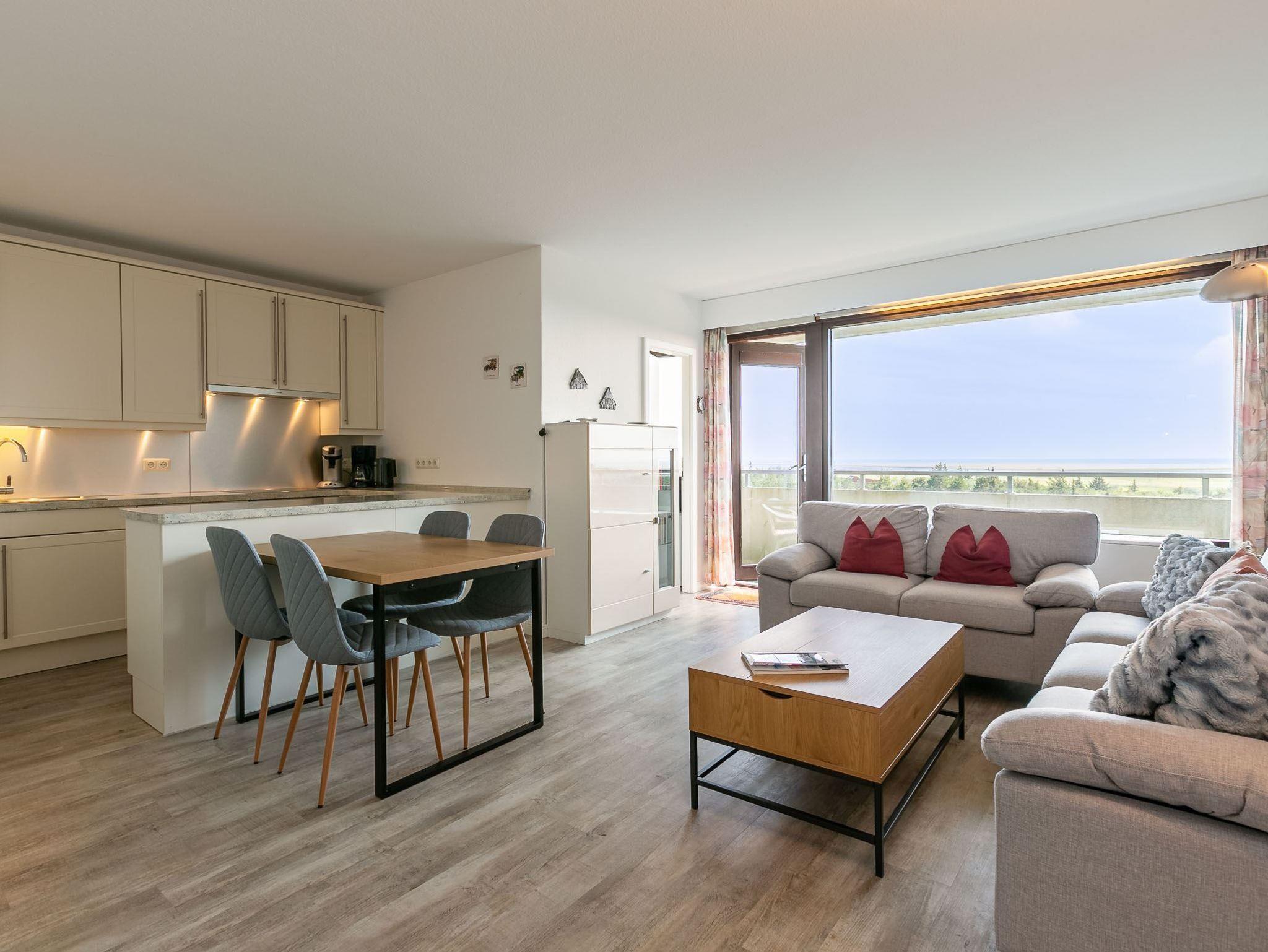 Wohnzimmer mit 2 Sofas, großem TV (Sat), Radio, Esstisch für 4 Personen und wunderschönem Meerblick. Direkter Zugang zum überdachten, möblierten Südwest-Balkon mit weitem Ausblick. Offene Küche mit Backofen, Mikrowelle, Geschirrspüler, Kühlschrank mit Gefrierfach und Philips Senseo Kaffeemaschine. Die Küche ist durch einen Tresen vom Wohnzimmer abgeteilt.