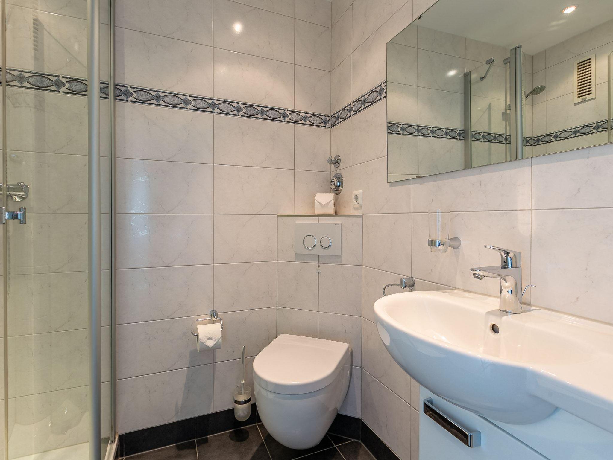 Modernes Badezimmer (Duschbad) mit Dusche mit niedrigem Eintritt (ca. 15cm), WC und Föhn.