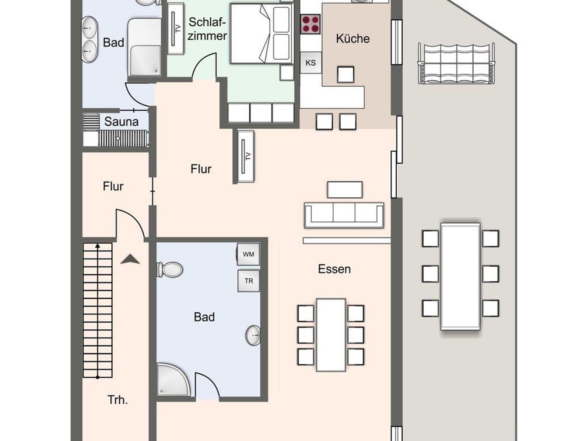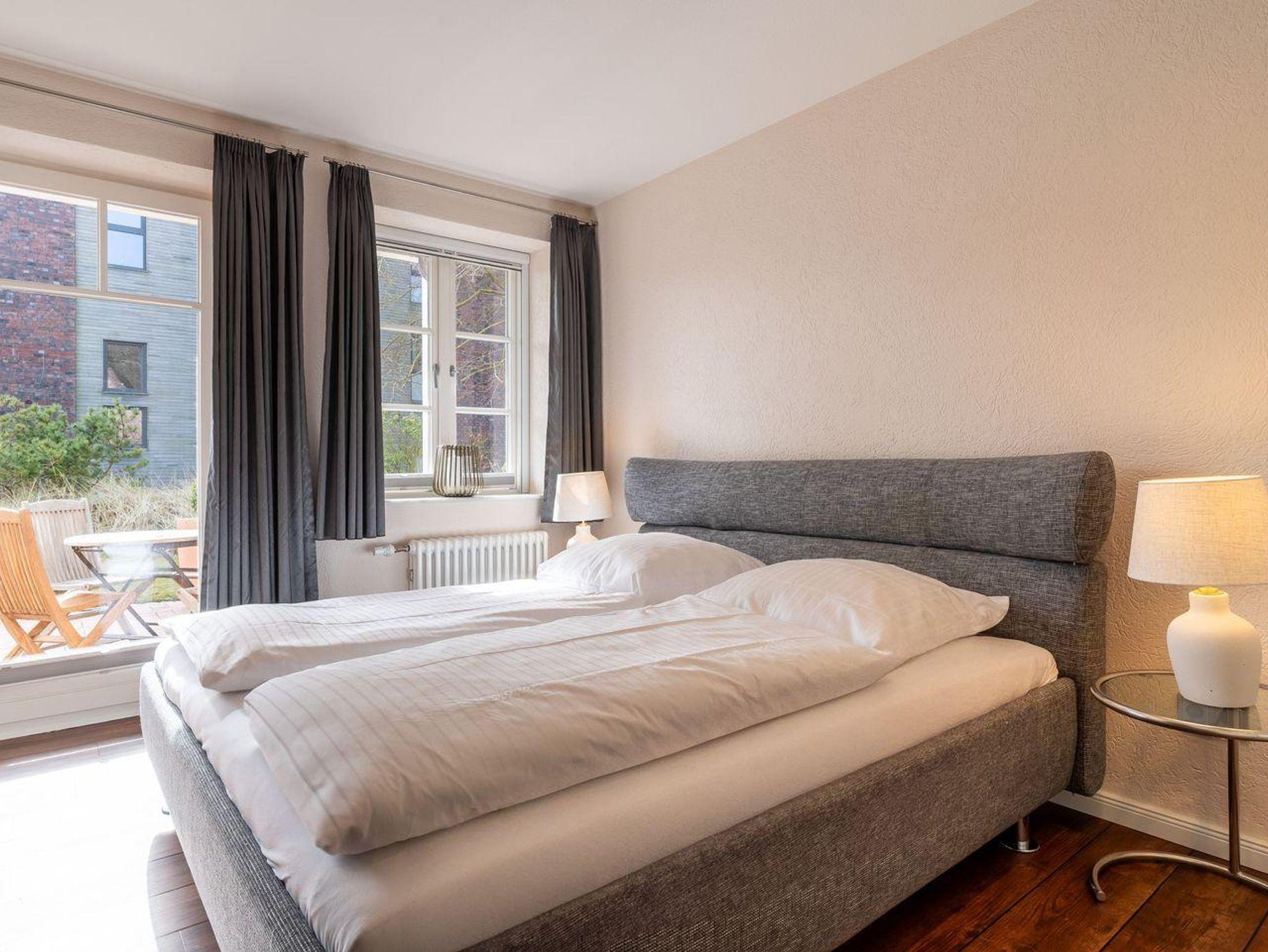 Von hier aus gelangen Sie auch auf die privaten Terrassen, wo wunderschöne Gartenmöbel und ein Strandkorb bereitstehen. Genießen Sie die frische Luft und die entspannende Atmosphäre – perfekt, um mit einem guten Buch zu entspannen und wertvolle Erinnerungen zu schaffen.