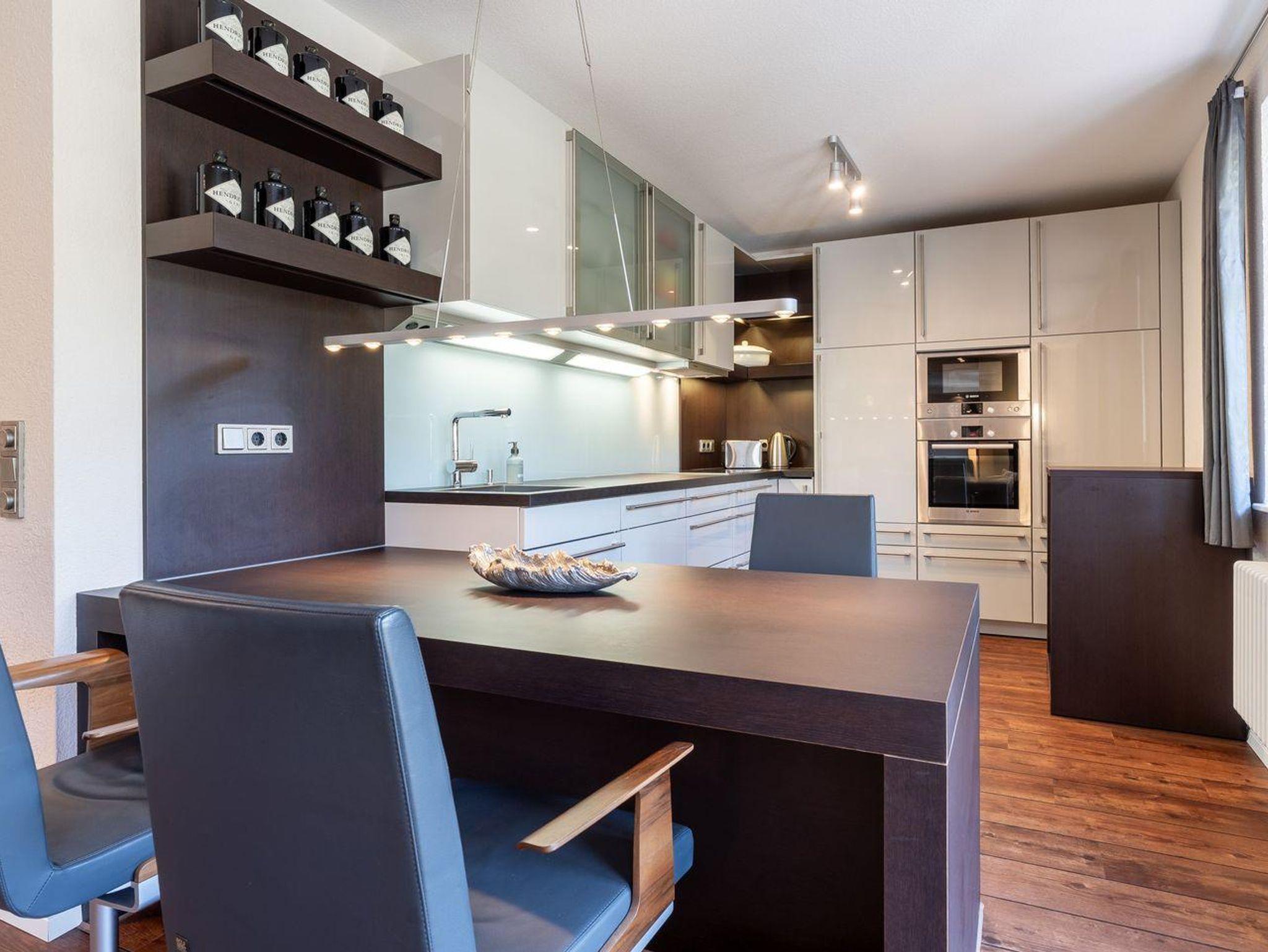 Das Herzstück der Ferienwohnung ist der offene Wohnbereich, der nahtlos in die voll ausgestattete Küche übergeht. Hier können Sie mit modernen Geräten wie einem Induktionsherd, einem Backofen und einer Spülmaschine Ihrer Kochleidenschaft nachgehen. Ein Kühlschrank mit Gefrierfach, eine Kaffeemaschine, einen Weinschrank und weitere Küchenutensilien lassen keine Wünsche offen. Egal, ob Sie ein einfaches Frühstück zubereiten oder ein festliches Dinner für Freunde und Familie kreieren möchten – alles ist möglich. Der angrenzende Essbereich bietet eine einladende Atmosphäre für gesellige Abende.