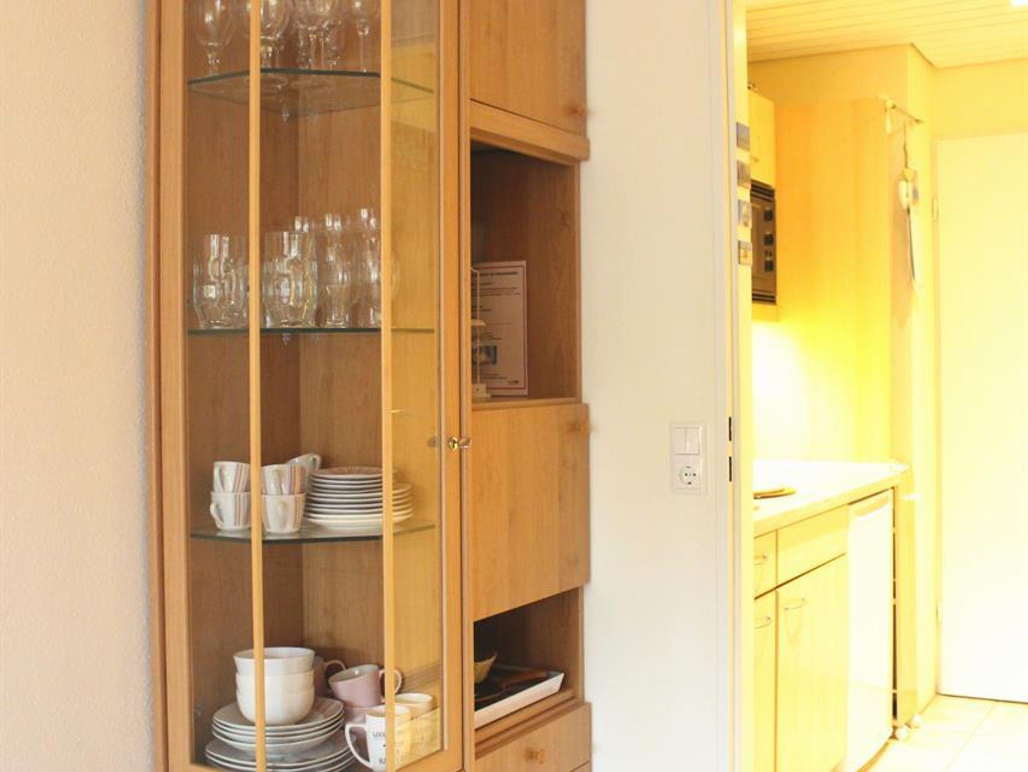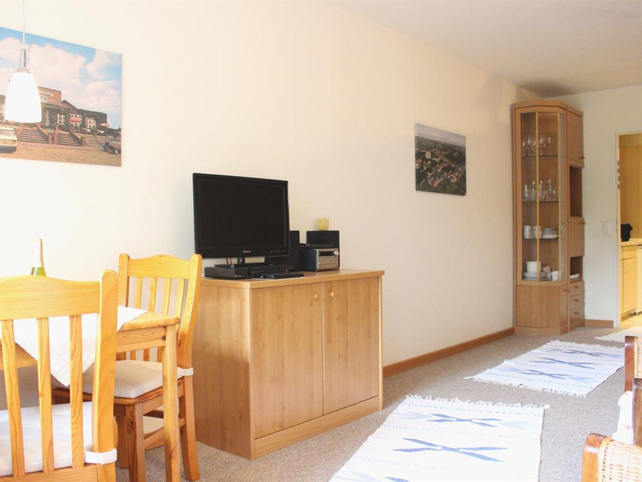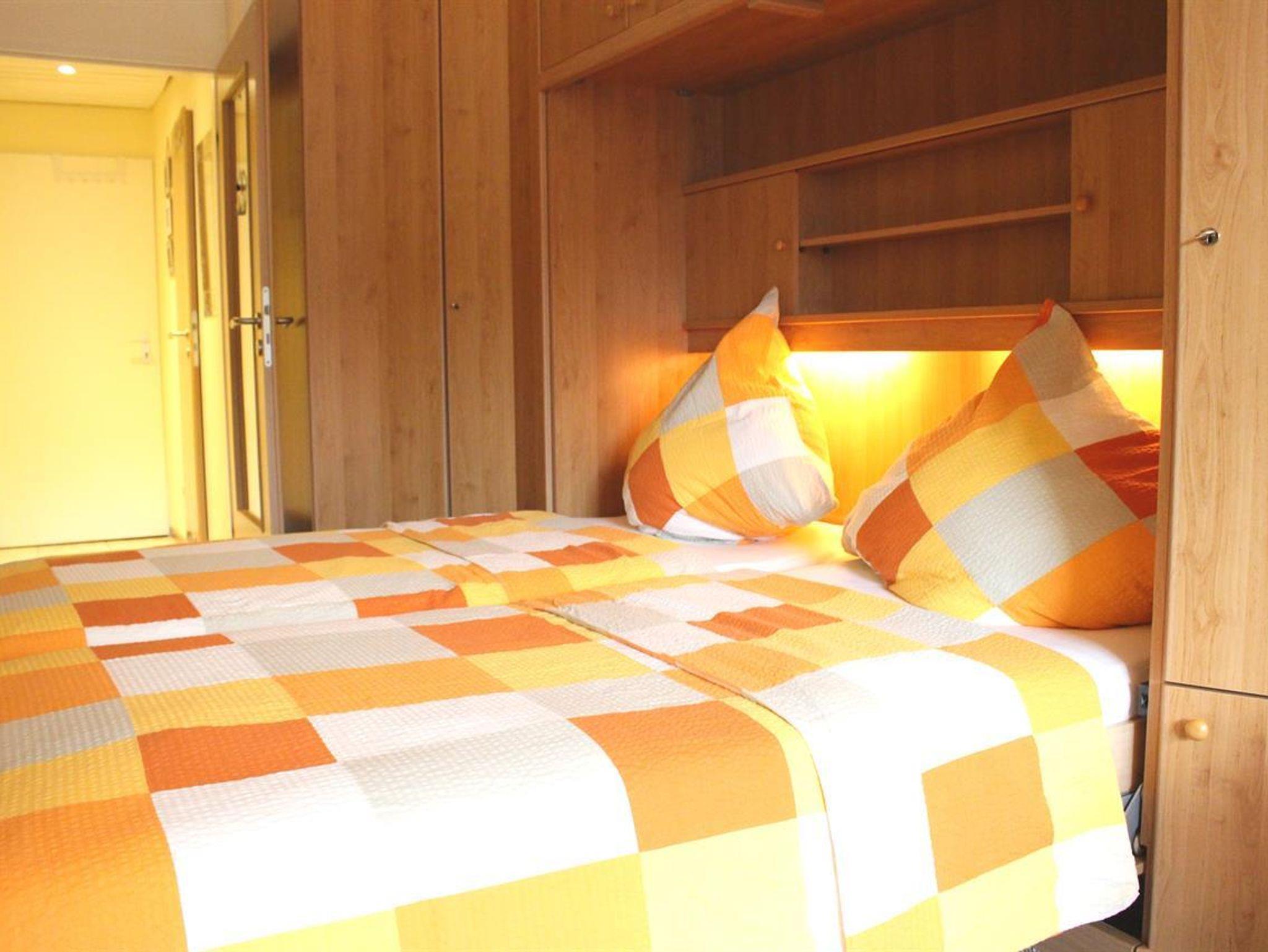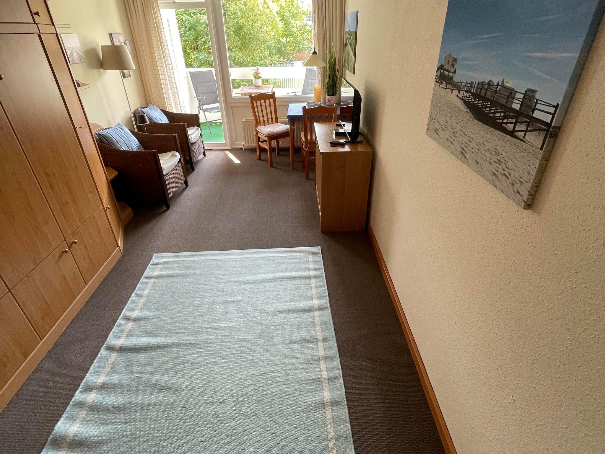 Im 1 Raum-Appartement befinden sich eine Anbauwand mit 2 Klappbetten (auch einzel ausklappbar), Kleiderschrank mit Beleuchtung und andere Einbauschränke. Eine Sitzecke mit 2 Rattan-Sesseln und 3 Beistelltischen, eine Essecke mit Tisch und 2 Stühlen.