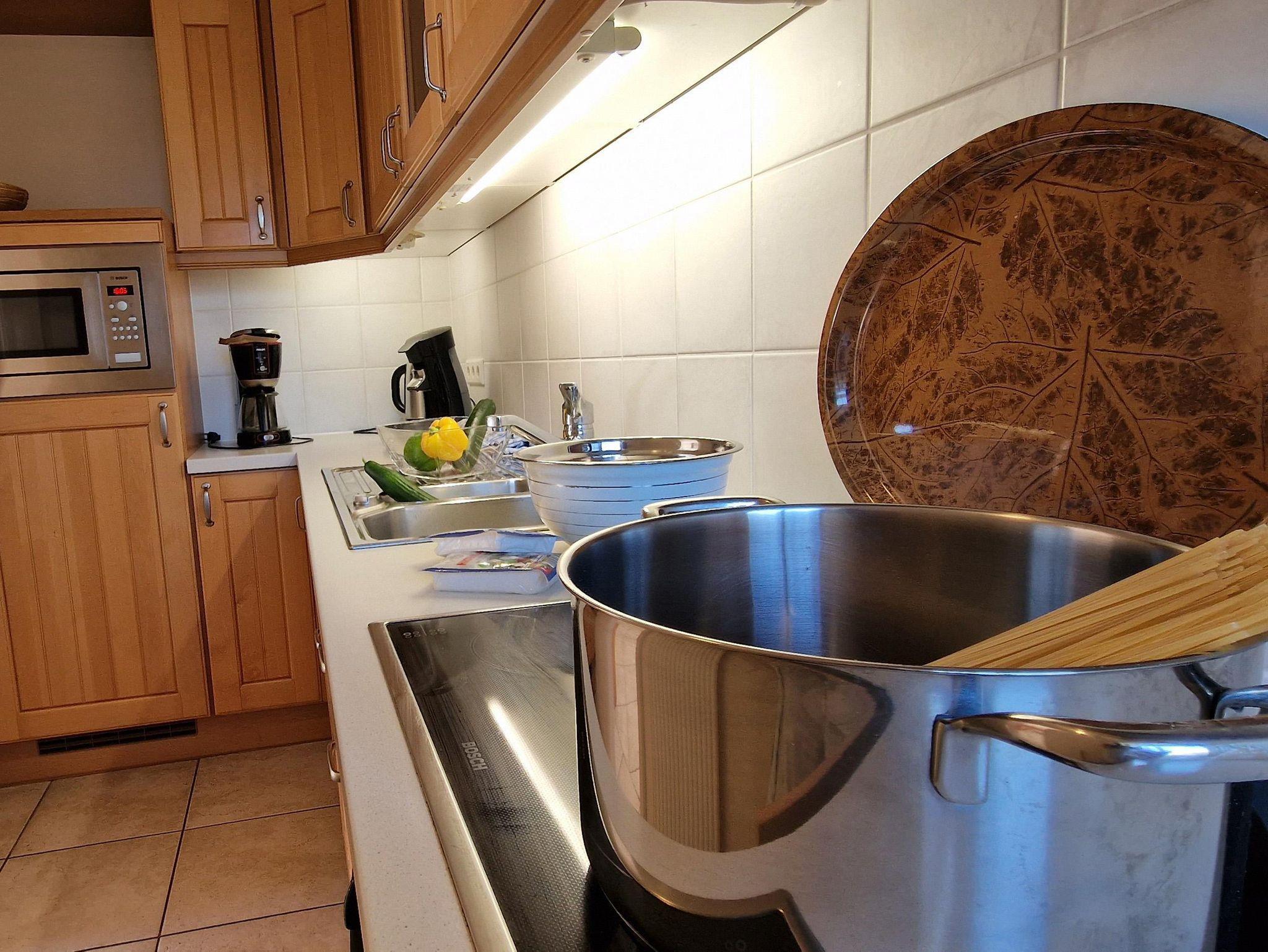 komplett eingerichtete Küche mit Ceranfeld, Mikrowelle, Backofen, Geschirrspüler, Kühlschrank mit Gefrierfach, Wasserkocher, Kaffeemaschine (Filter), Kaffeepadmaschine, Toaster.