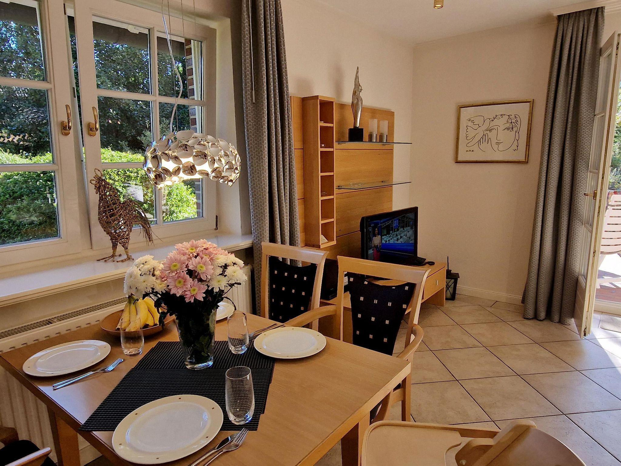 Eingangsdiele mit Garderobe, großzügiger Wohn-Essbereich mit direktem Zugang auf eine große, durch Friesenwälle und Gehölze abgeschirmte Terrasse in Westlage mit Gartenmöbeln und einem Strandkorb, zwei Schlafzimmer mit Doppelbetten, zwei Duschbäder/WC, separate Küche. Im Untergeschoss befindet sich eine Gemeinschaftssauna mit Ruheraum, verschiedenen Duschen, Fußbäder, WC. Umkleideraum, Solarium, Fitnessraum, Tischtennis. Im Außenbereich befindet sich ein Spielplatz für die Kleinsten, Stellplatz, Fahrradständer und ein wunderschön angelegtes Gartengelände umsäumt von Grünland.