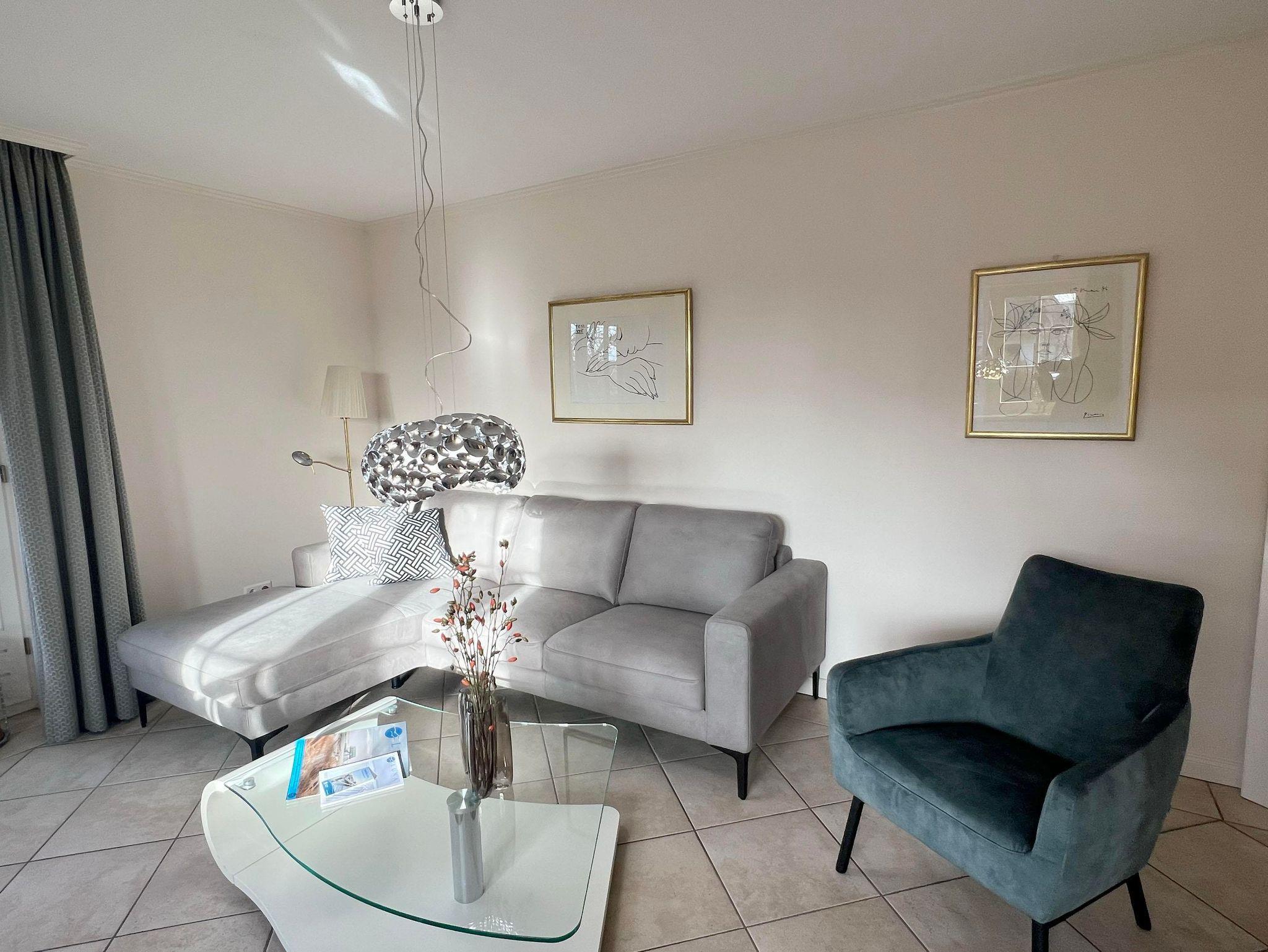 Die schöne Ferienwohnung ist für 4 Pers. geplant und teilt sich wie folgt auf: Eingangsdiele mit Garderobe, großzügiger Wohn-Essbereich mit direktem Zugang auf eine große, durch Friesenwälle und Gehölze abgeschirmte Terrasse in Westlage mit Gartenmöbeln und einem Strandkorb, zwei Schlafzimmer mit Doppelbetten, zwei Duschbäder/WC, separate Küche. Im Untergeschoss des mittleren Einganges befindet sich eine Gemeinschaftssauna mit Ruheraum, verschiedenen Duschen, Fußbäder, WC. Umkleideraum, Solarium, Fitnessraum, Tischtennis. Im Außenbereich befindet sich ein Spielplatz für die Kleinsten, Stellplatz, Fahrradständer und ein wunderschön angelegtes Gartengelände umsäumt von Grünland.