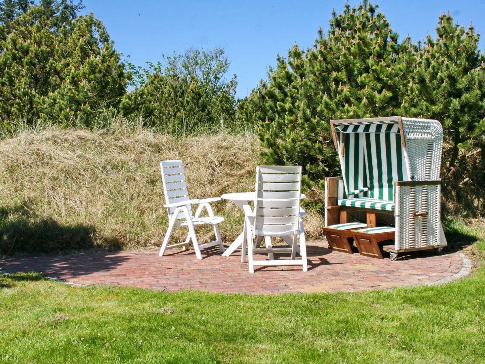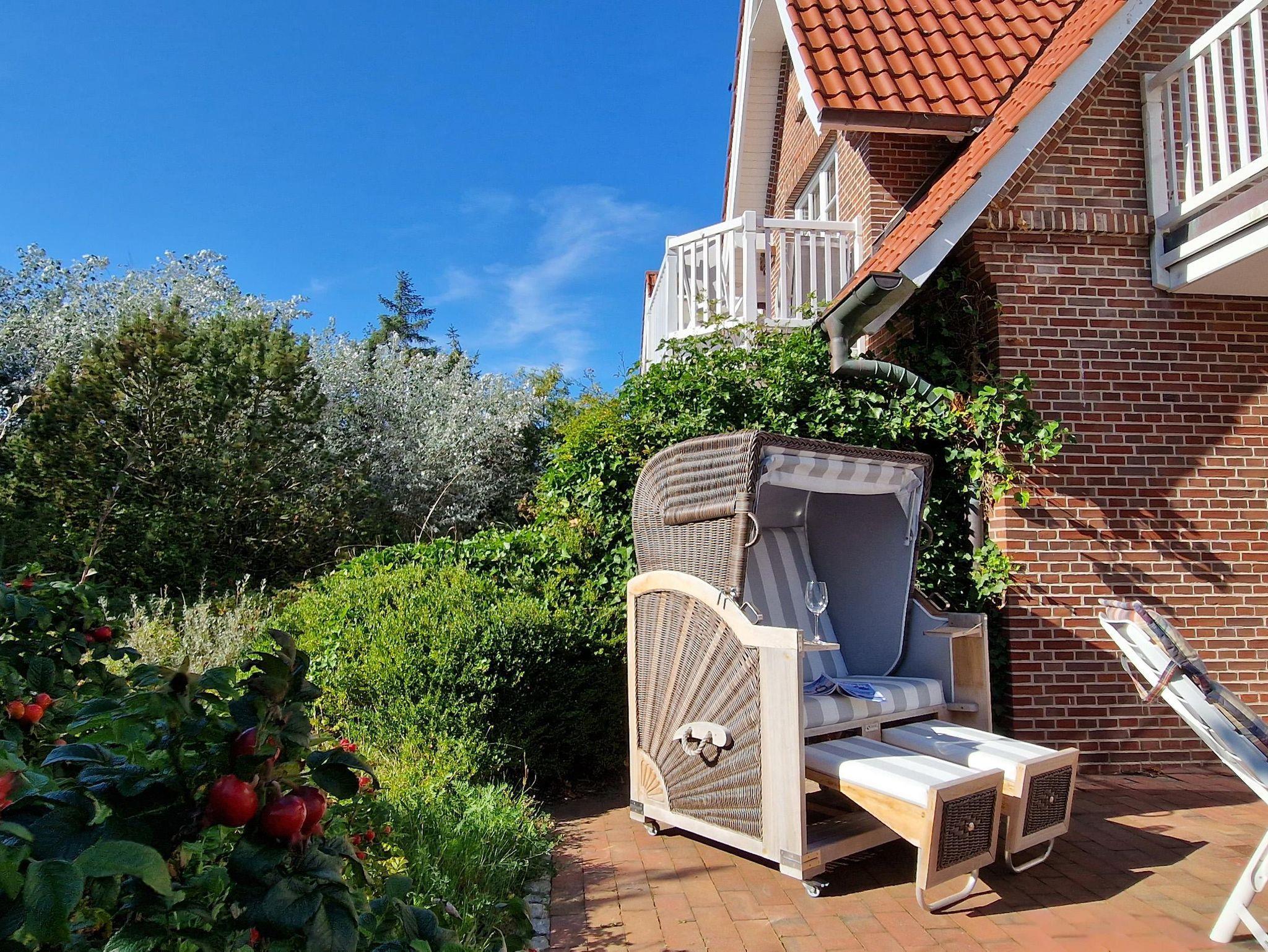 • Terrasse mit Gartenmöbeln und Strandkorb