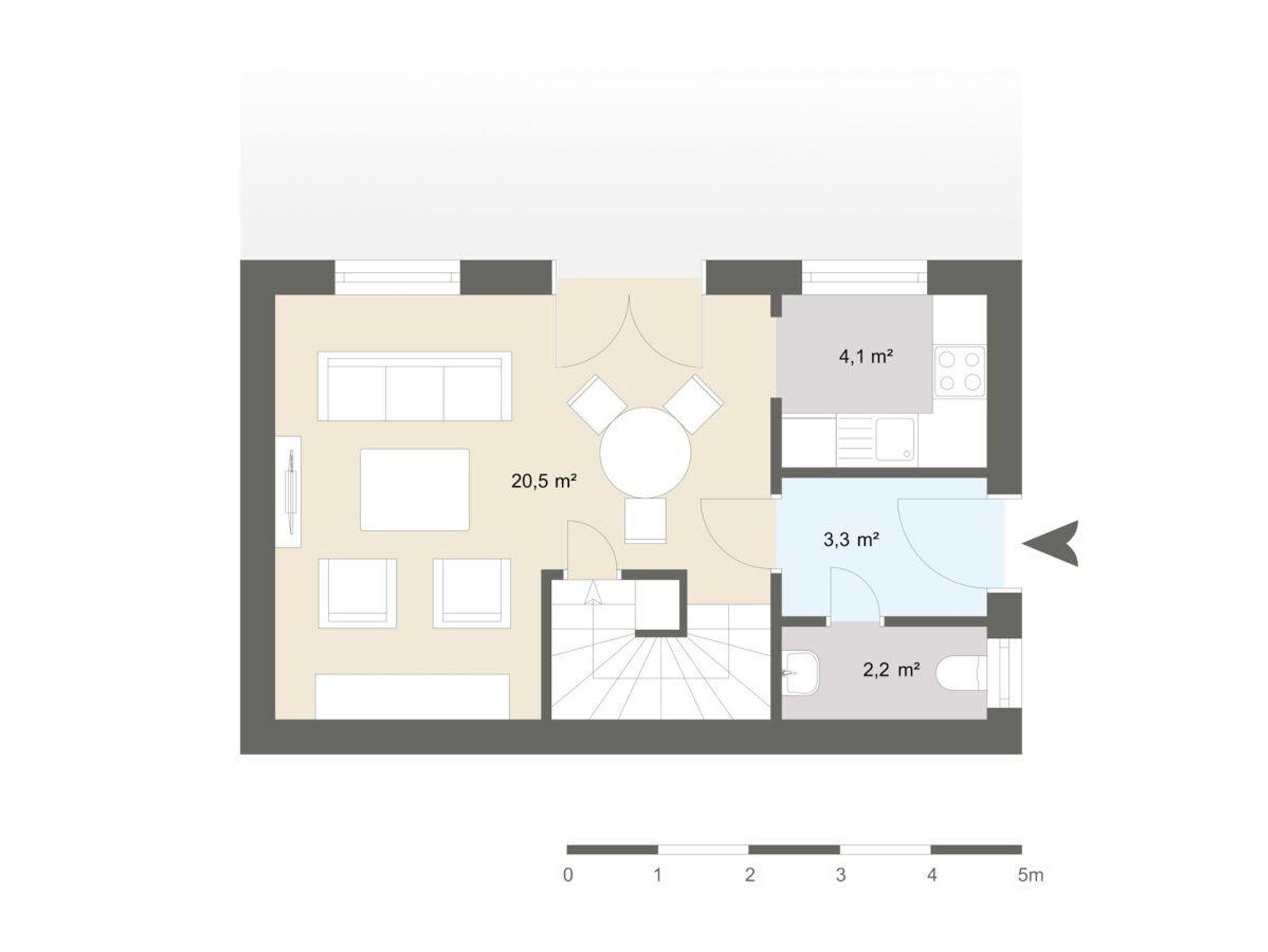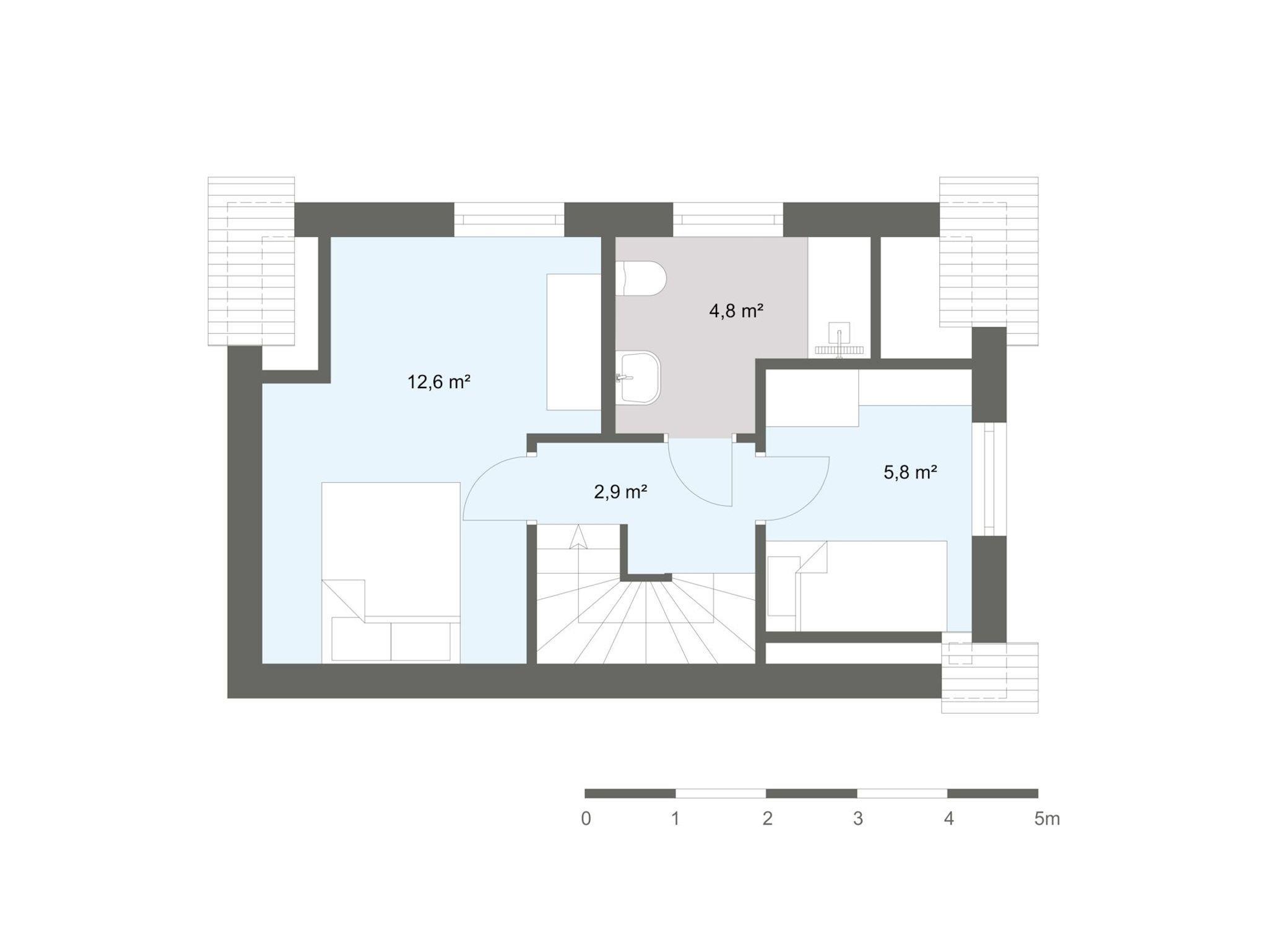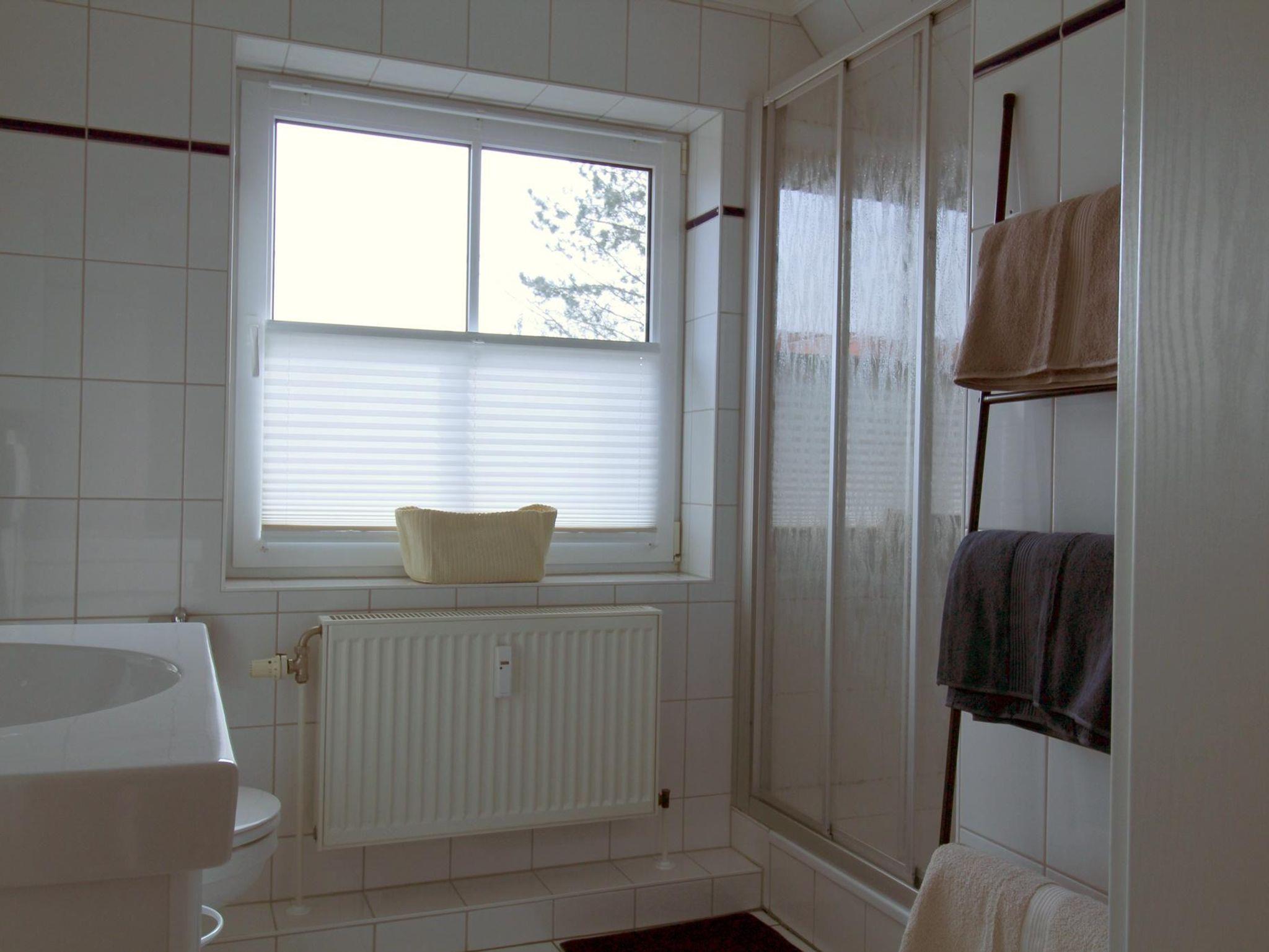Die Wohnung verfügt über zwei Schlafzimmer in der oberen Etage (ein Doppel- und ein Einzelbett). Dazwischen finden Sie das Bad mit Dusche und Waschmaschine.