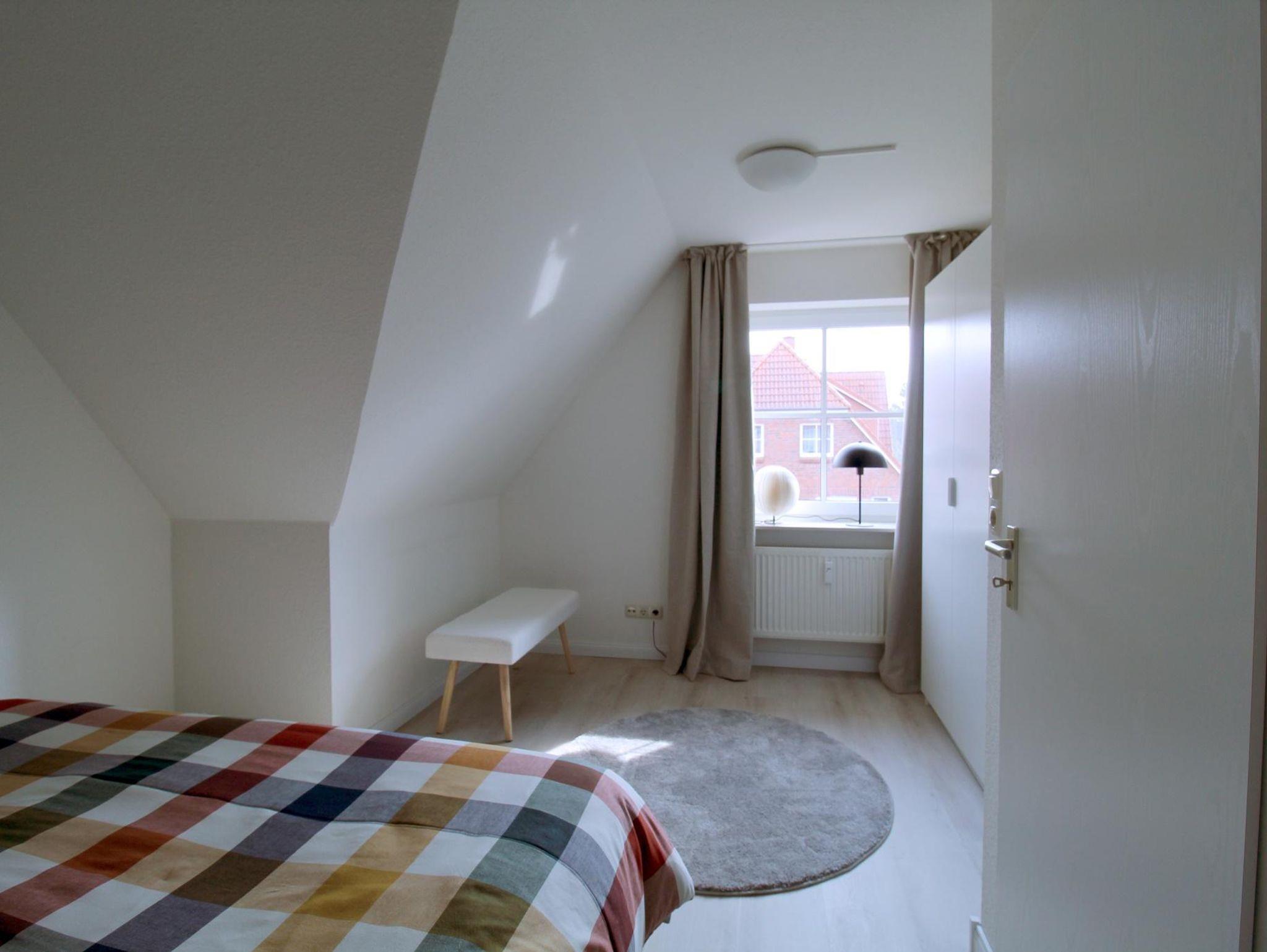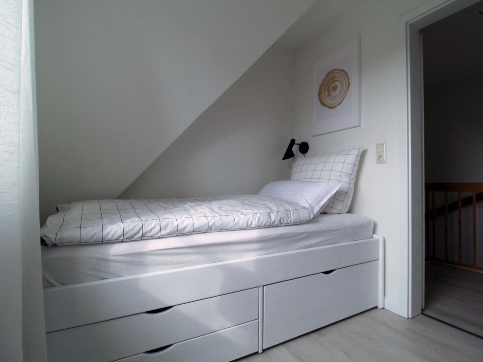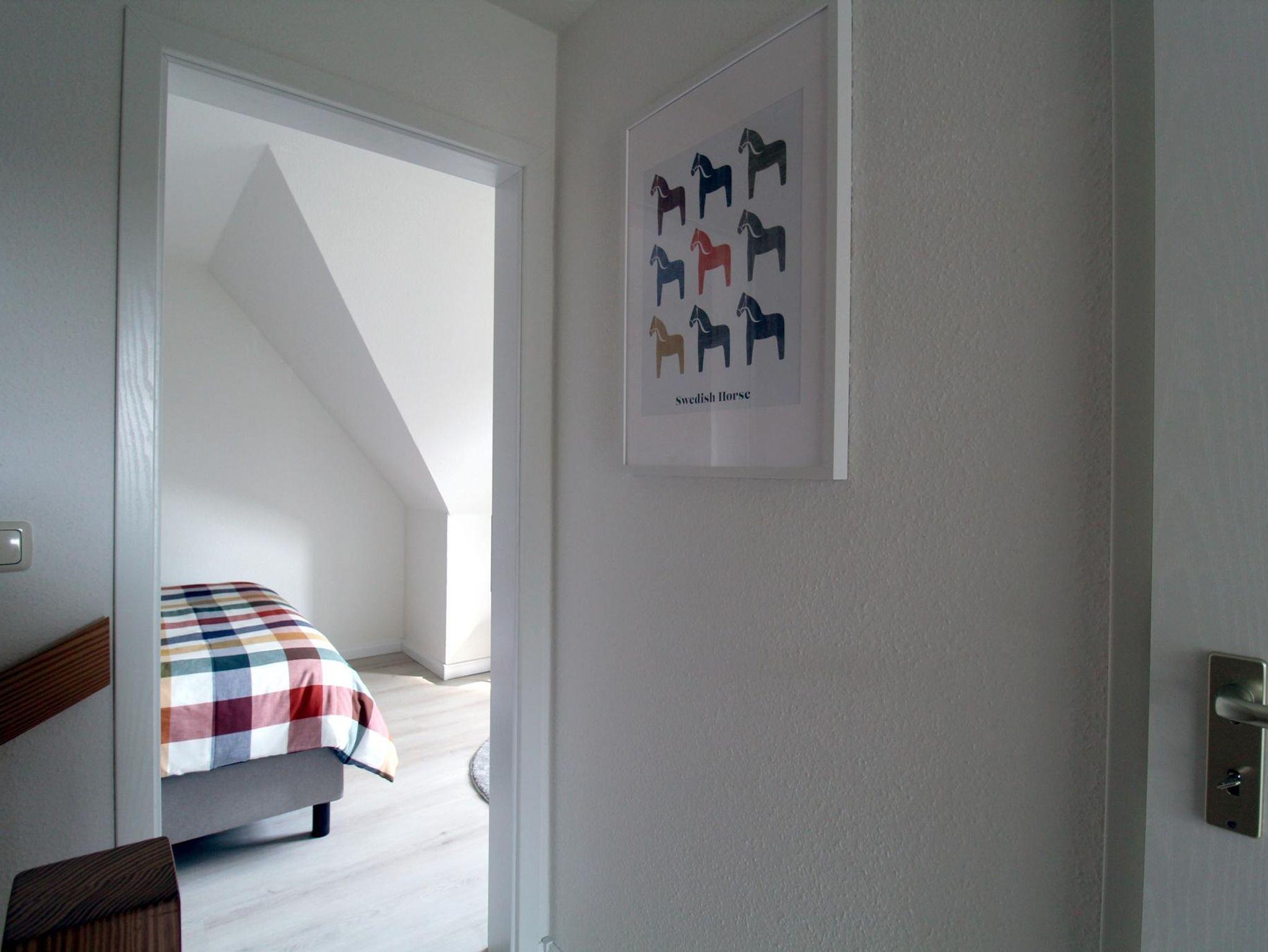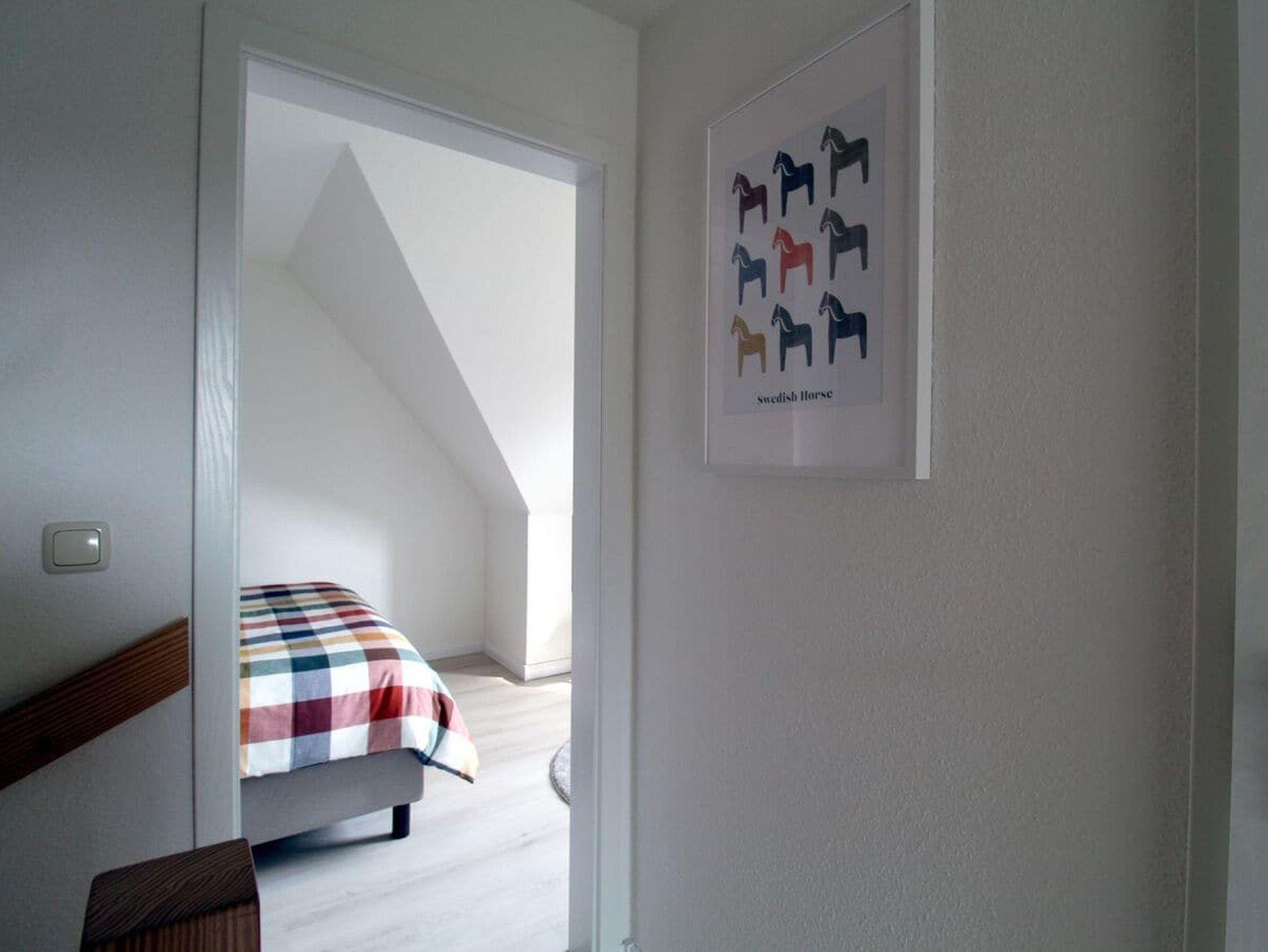 Die Wohnung verfügt über zwei Schlafzimmer in der oberen Etage. Das größere Zimmer hat ein Boxspringbett (160 x 200), das kleinere ein Einzelbett (90 x 200). Dazwischen finden Sie das Bad mit Dusche und Waschmaschine.