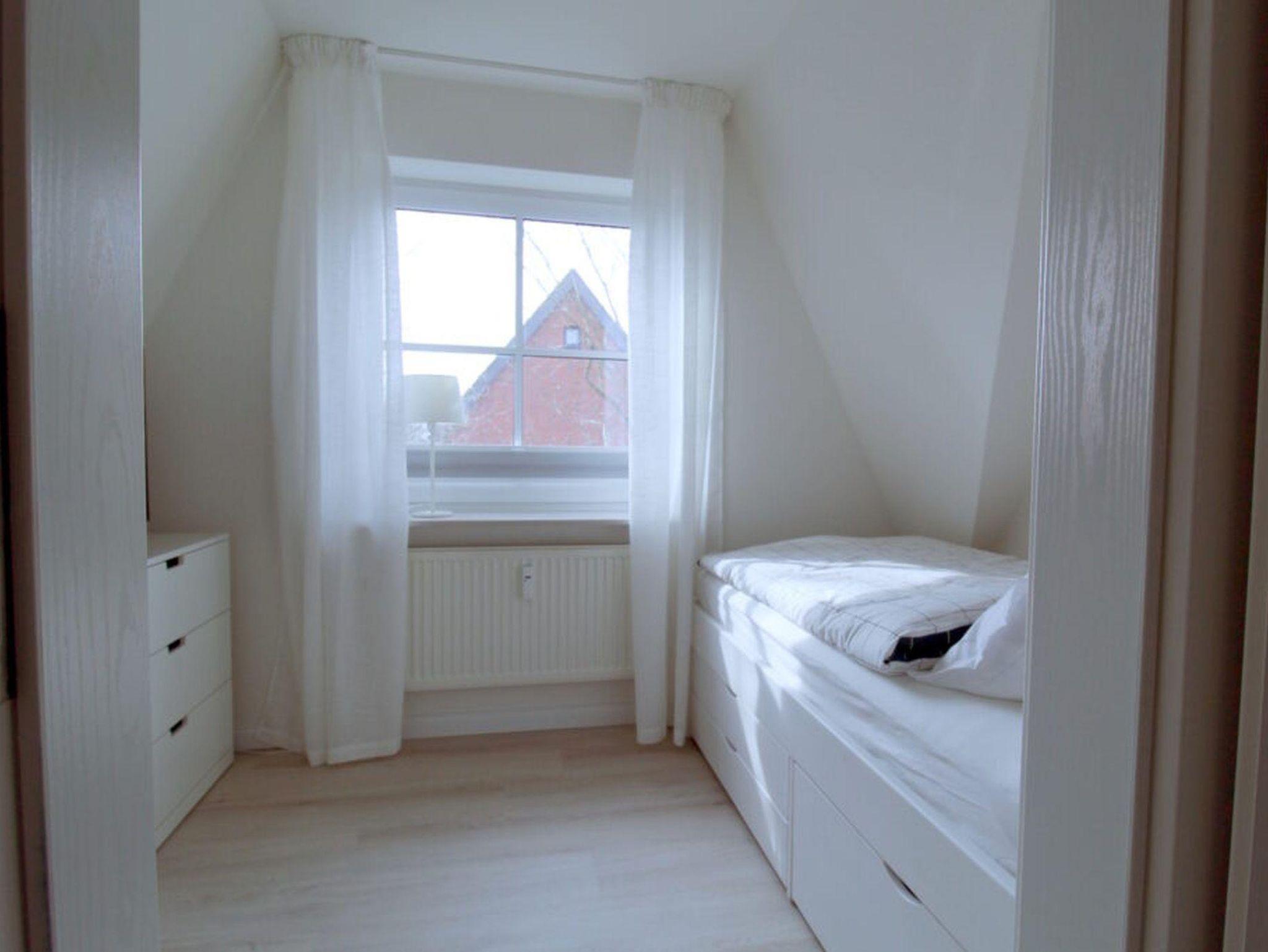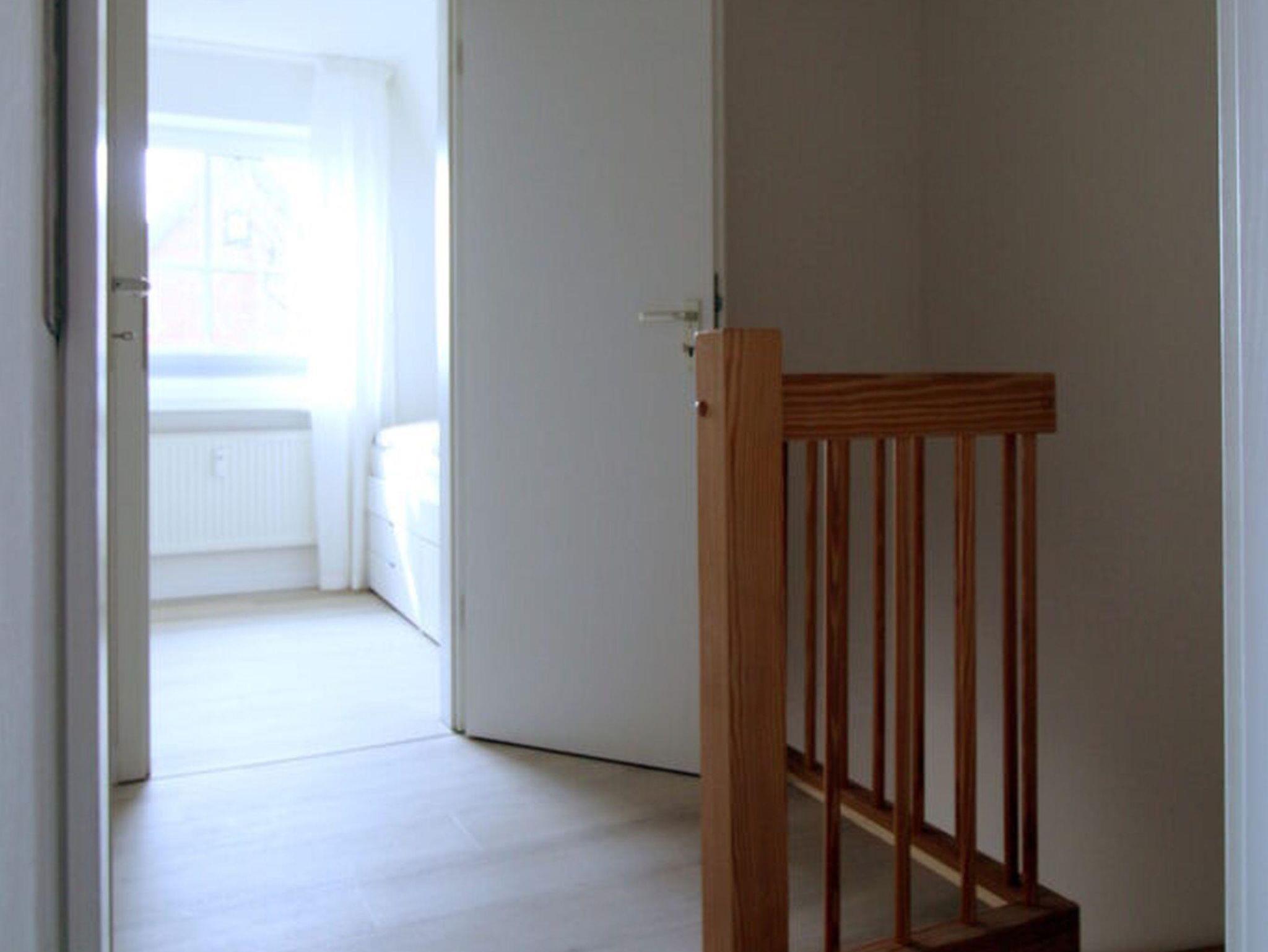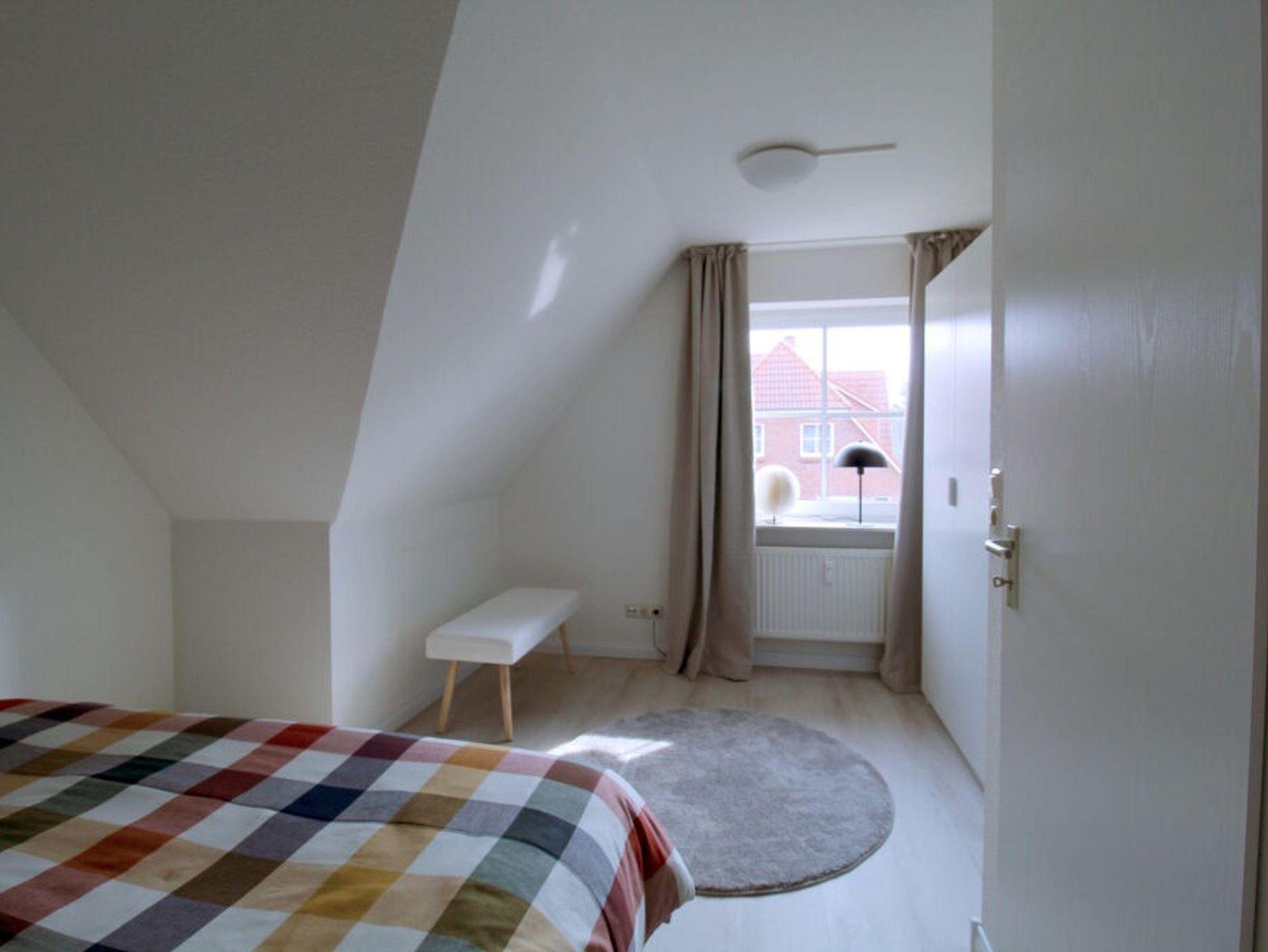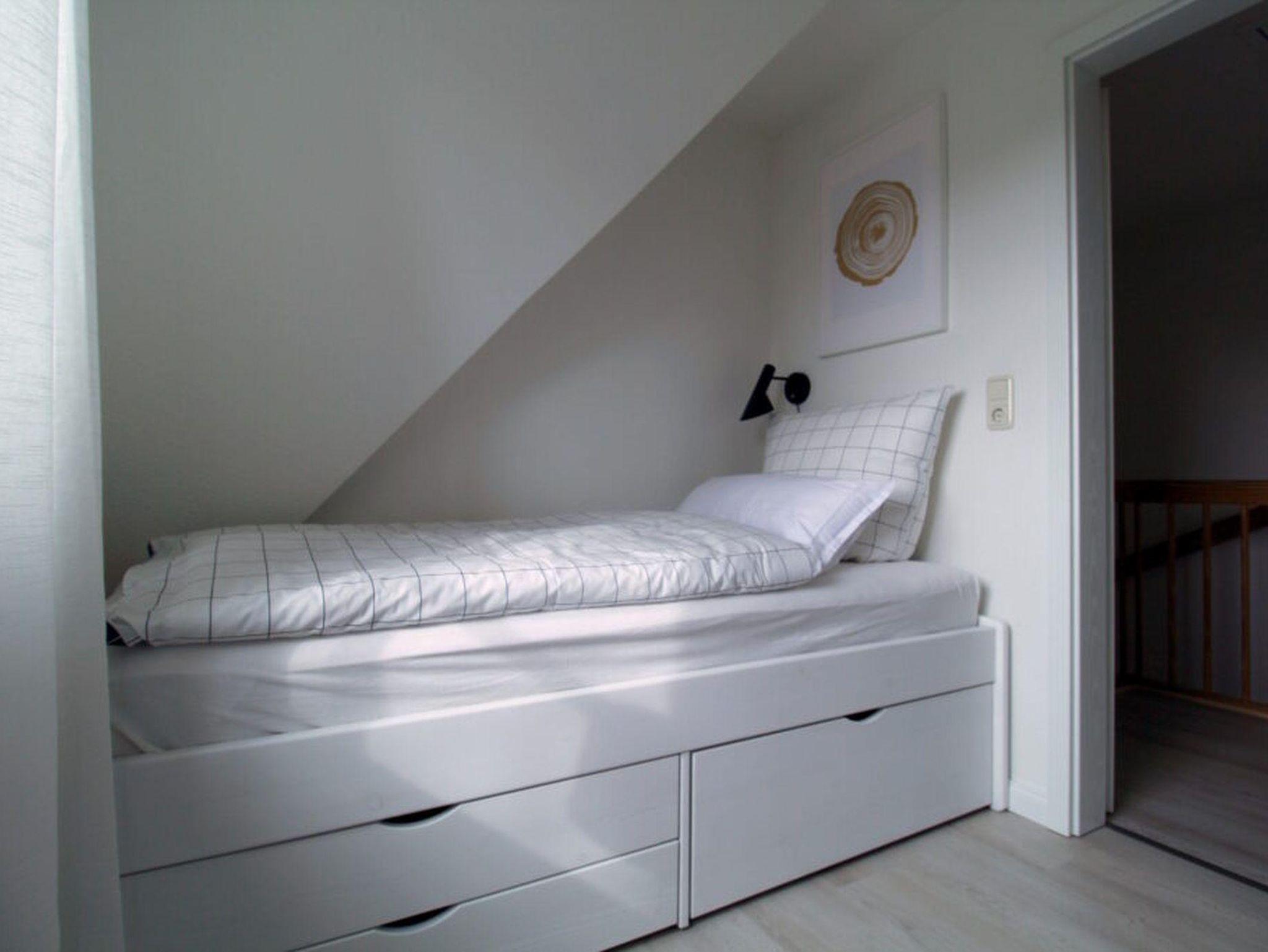 Die Wohnung verfügt über zwei Schlafzimmer in der oberen Etage. Das größere Zimmer hat ein Boxspringbett (160 x 200), das kleinere ein Einzelbett (90 x 200). Dazwischen finden Sie das Bad mit Dusche und Waschmaschine.
