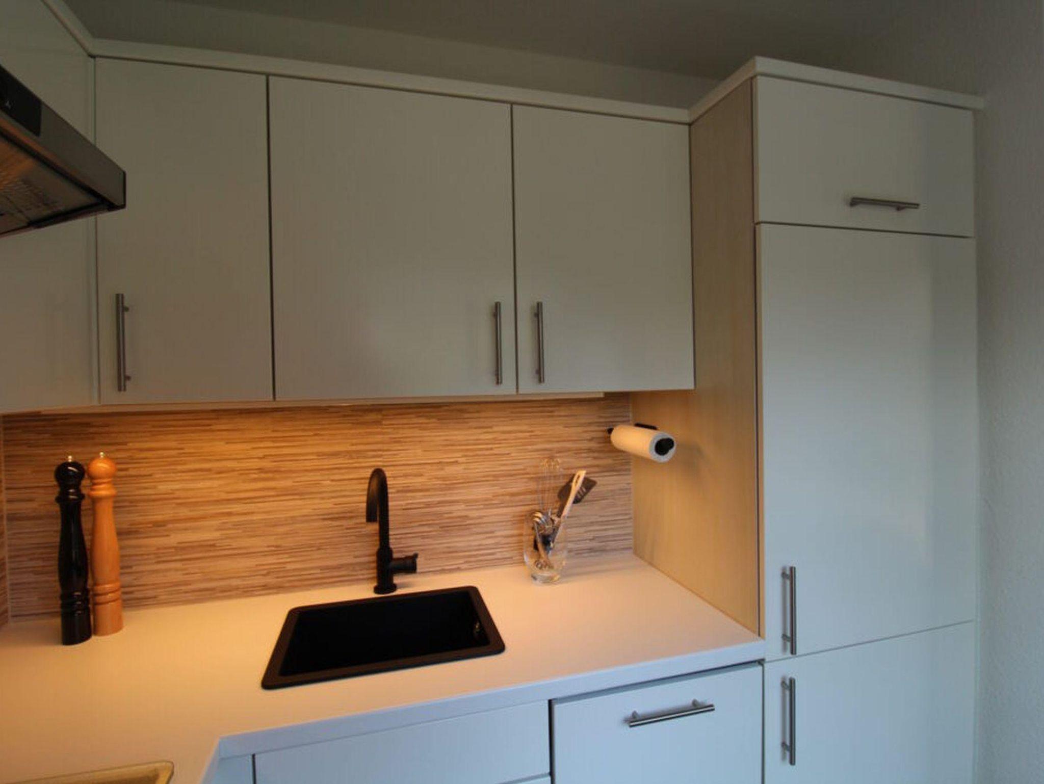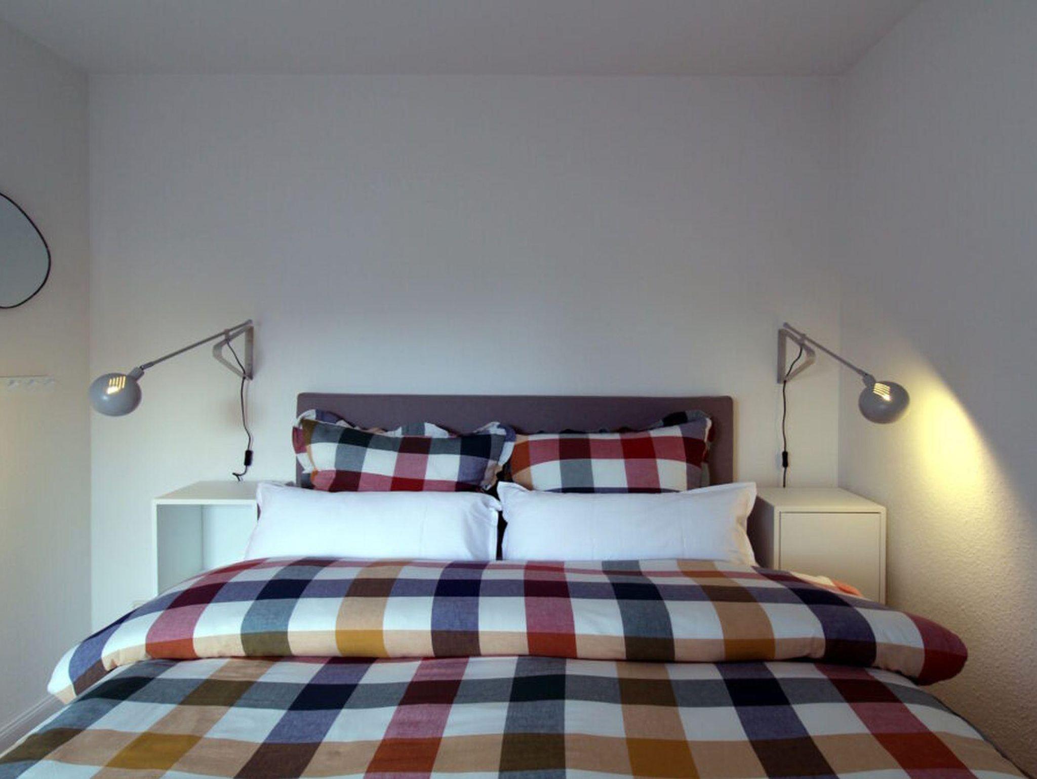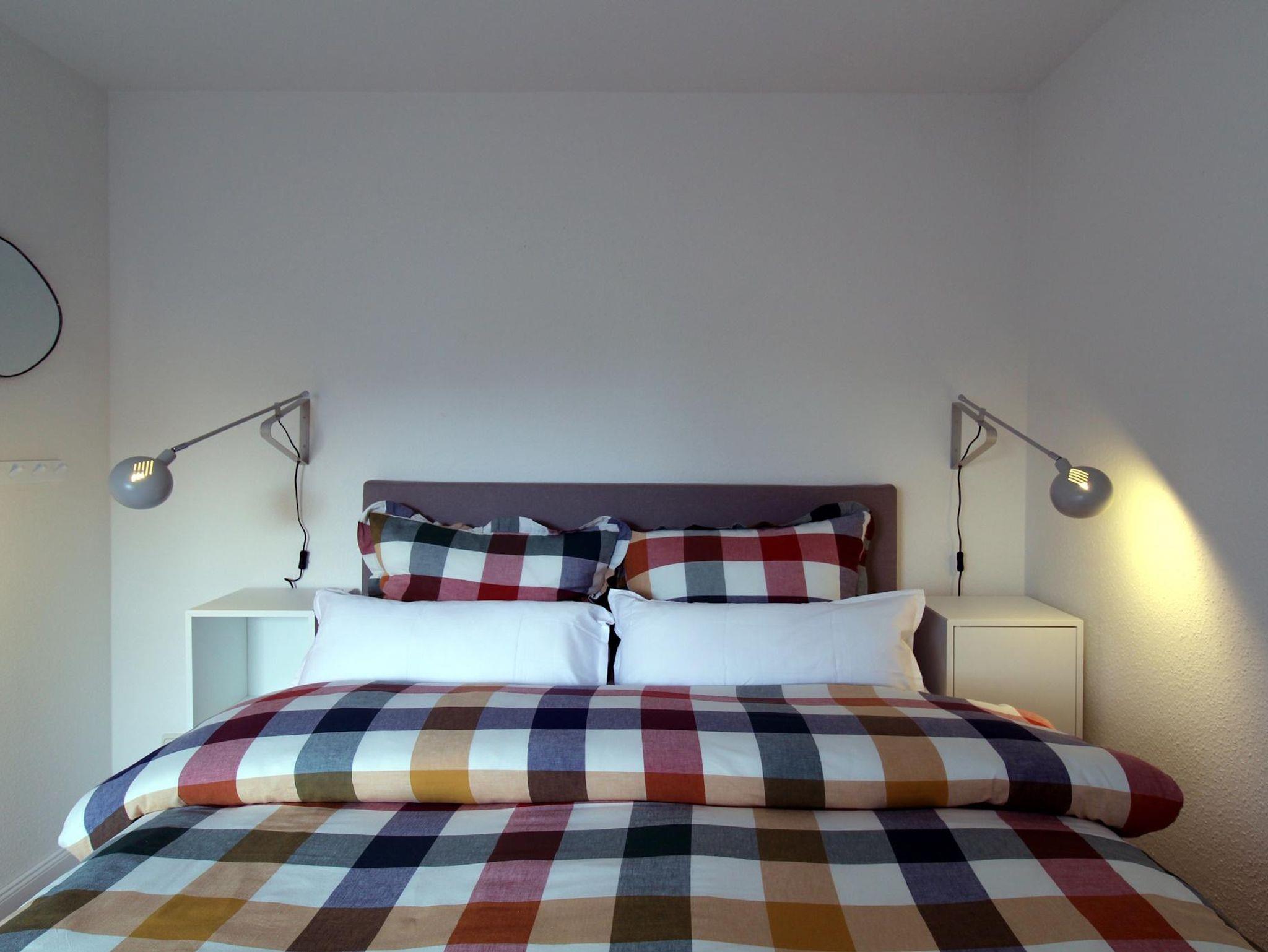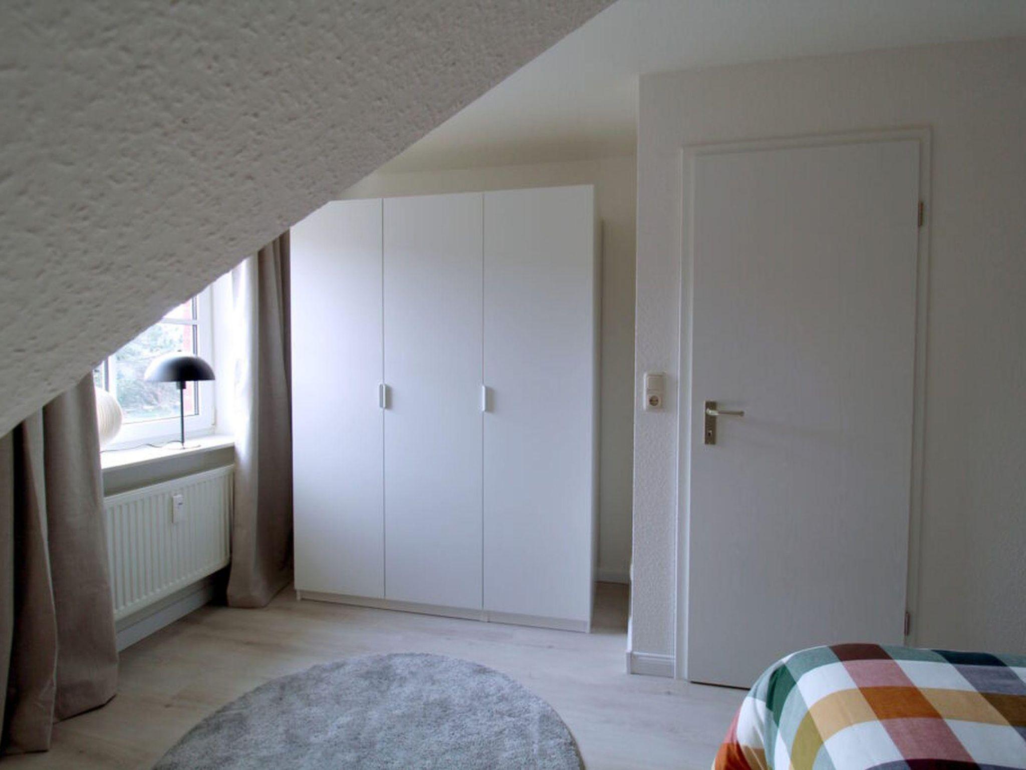 Die Wohnung verfügt über zwei Schlafzimmer in der oberen Etage. Das größere Zimmer hat ein Boxspringbett (160 x 200), das kleinere ein Einzelbett (90 x 200). Dazwischen finden Sie das Bad mit Dusche und Waschmaschine.