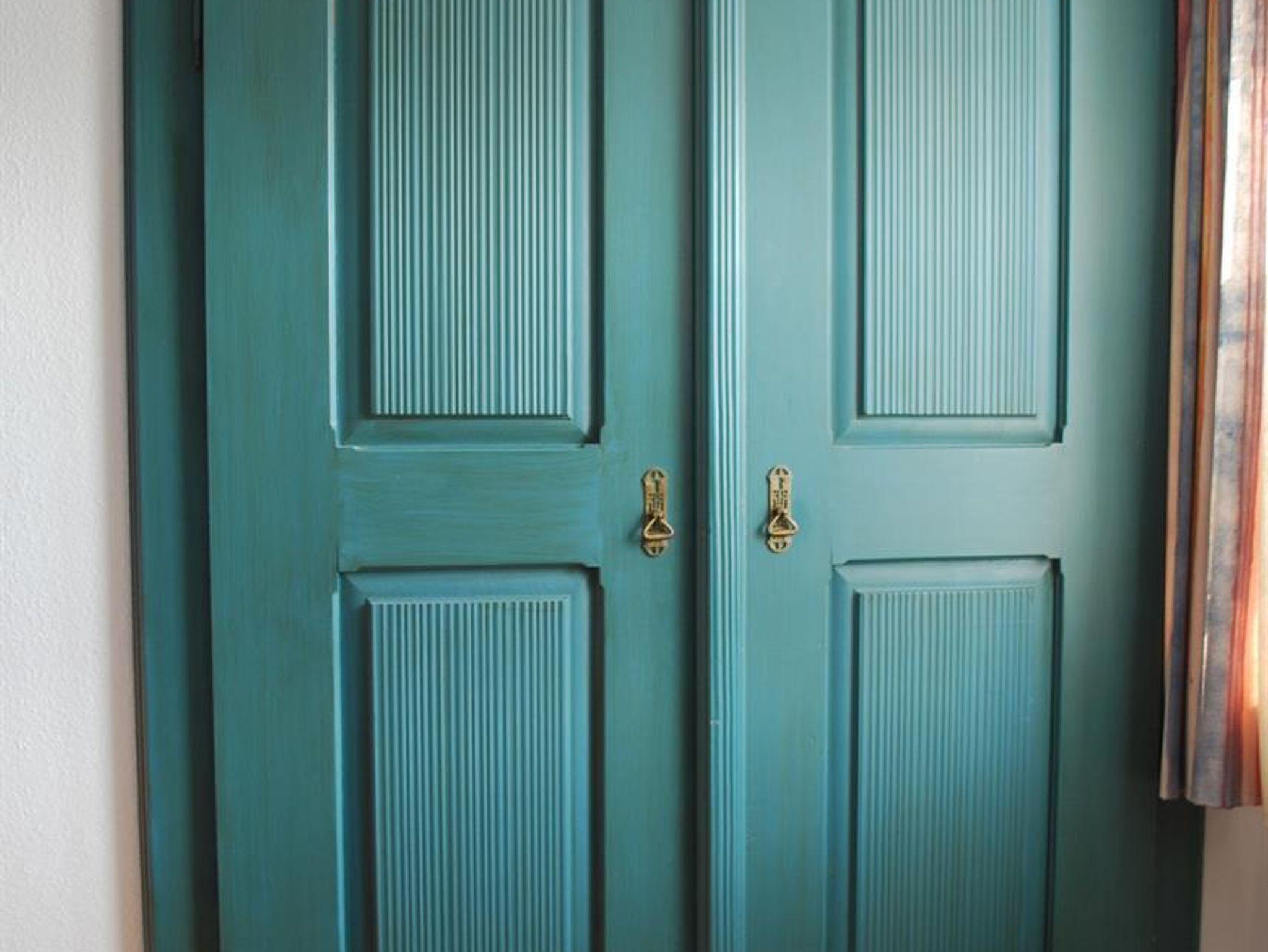 Weitere Details: Sideboard und Vitrine aus massiver blau lasierter Kiefer und antiker Kleiderschrank (Nussbaum).