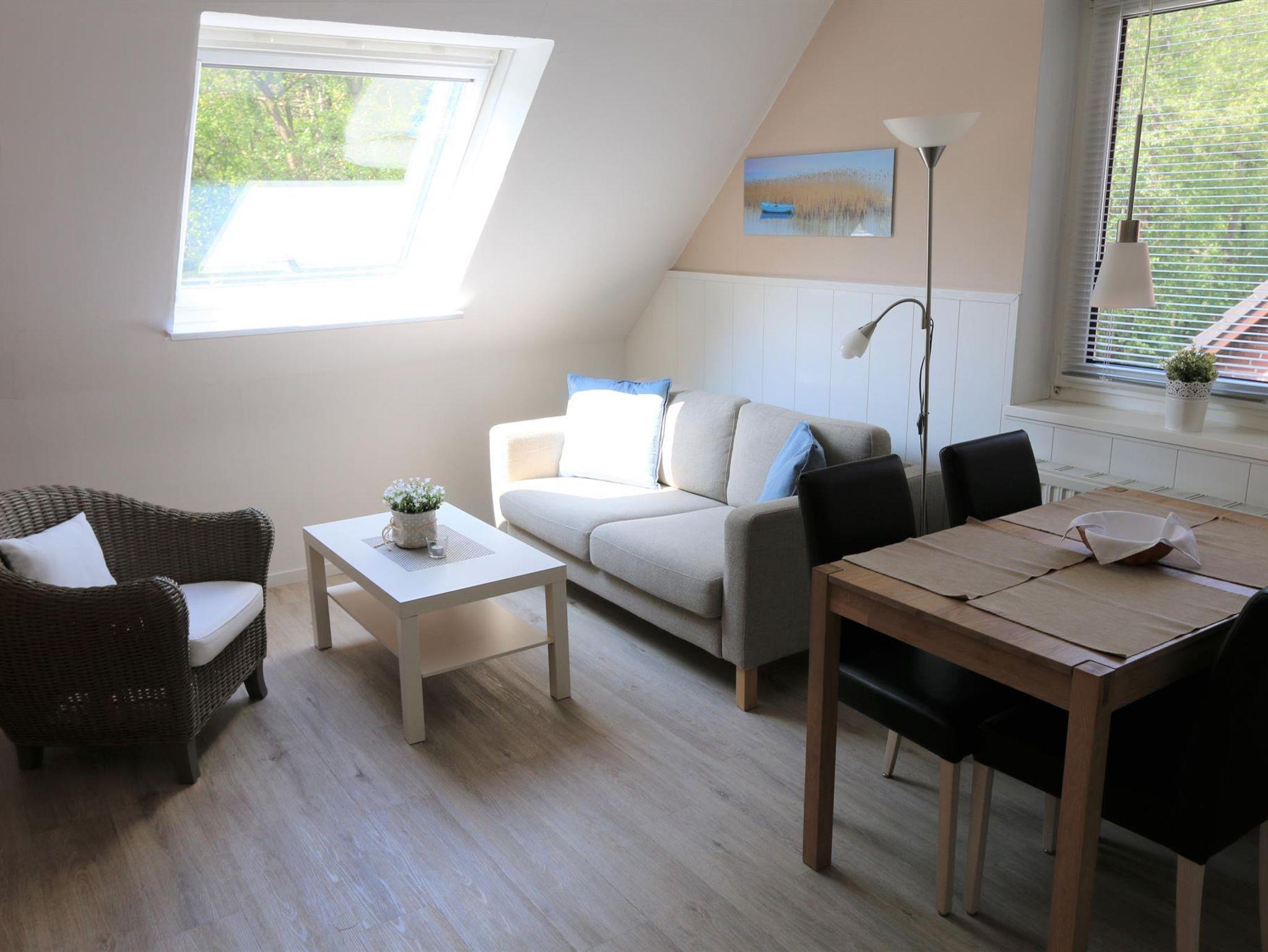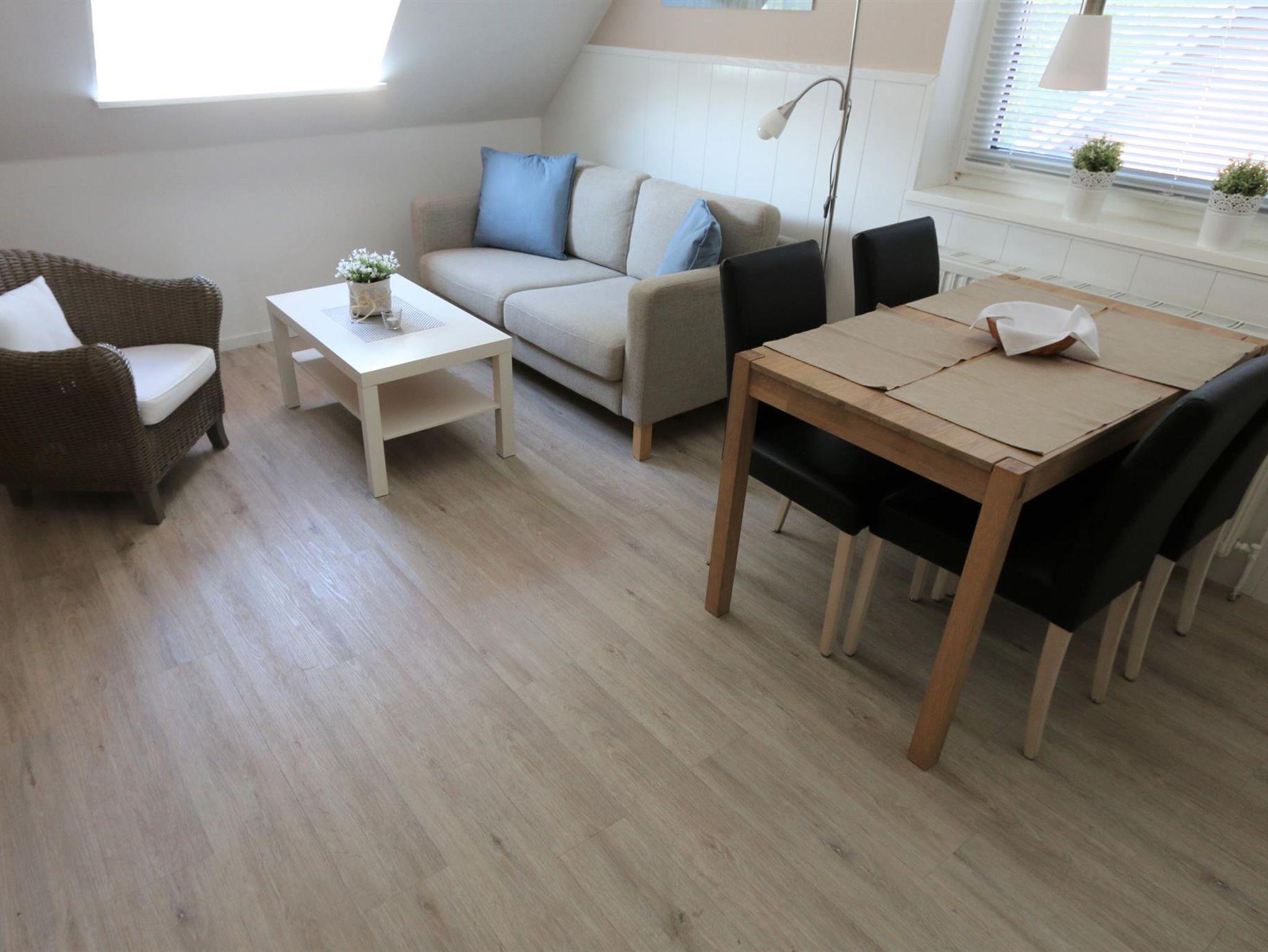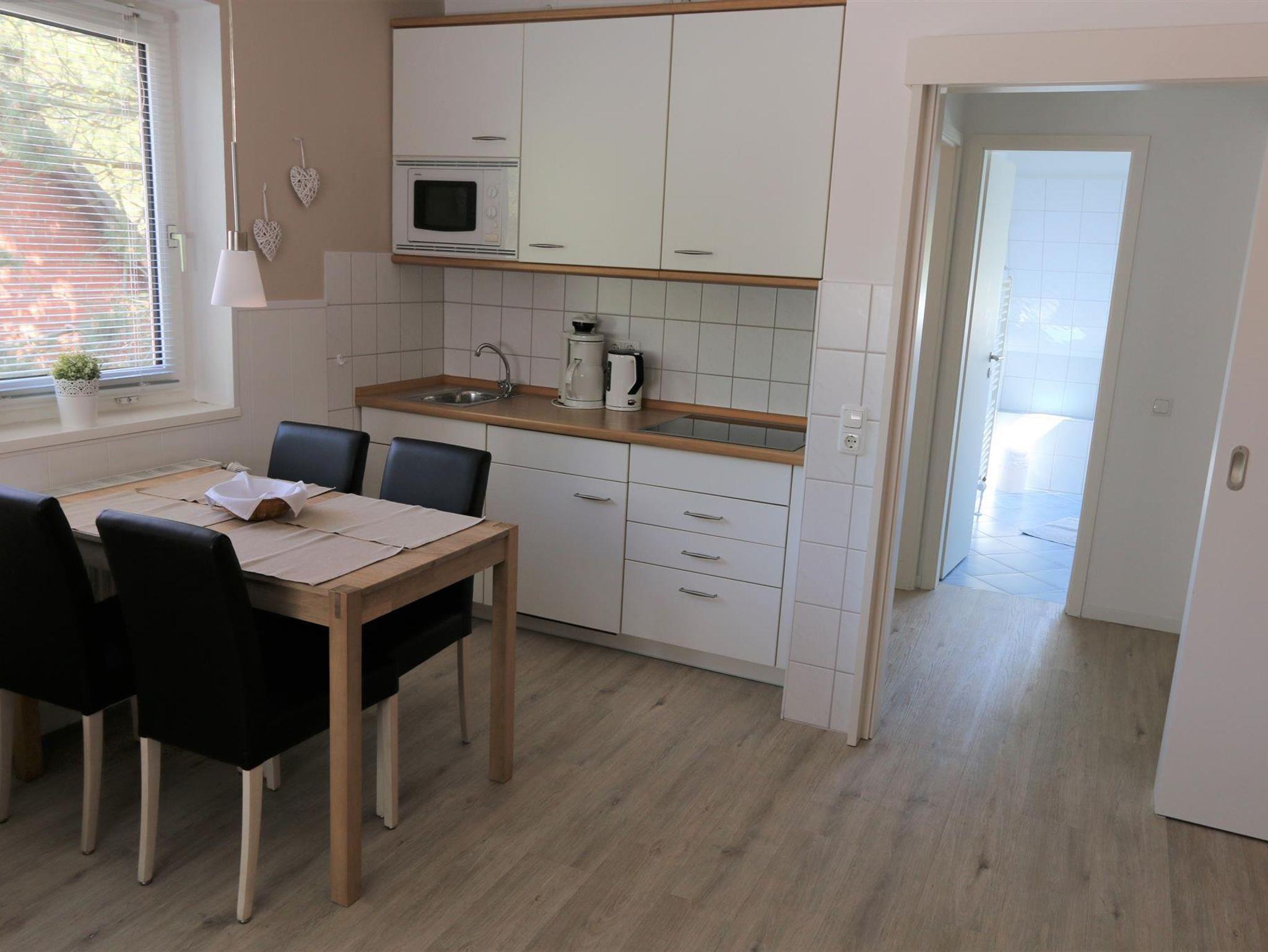 Die moderne und helle Ferienwohnung für 2 - 4 Personen befindet sich im ersten Stock und bietet Ihnen einen separaten Schlafraum mit einem Einzelbett (Auszugsmöglichkeit zum Doppelbett), Flur, Duschbad, sowie einen kombinierten Wohn- Schlafraum (Doppelbett als Schrankbett) mit Küchenzeile.
