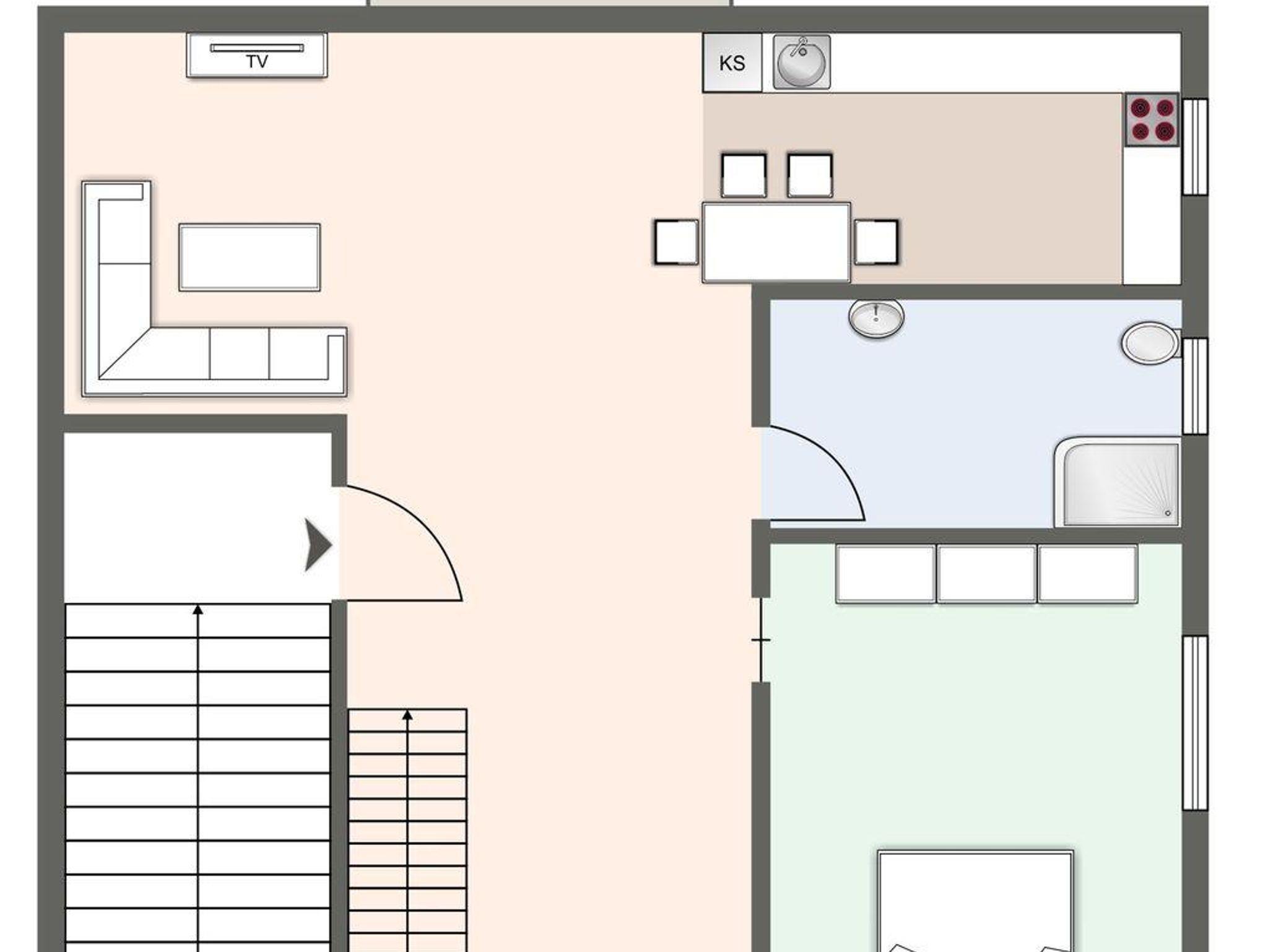 Im Hauptgeschoss erwarten Sie ein gemütlicher Wohnbereich mit Sofa, ein Elternschlafzimmer mit komfortablem Boxspringbett, die voll ausgestattete Küche mit Esstisch für vier Personen, Spülmaschine, Kaffeemaschine und Backofen sowie das moderne Bad mit Dusche und WC. Der Balkon lädt zum Entspannen ein.