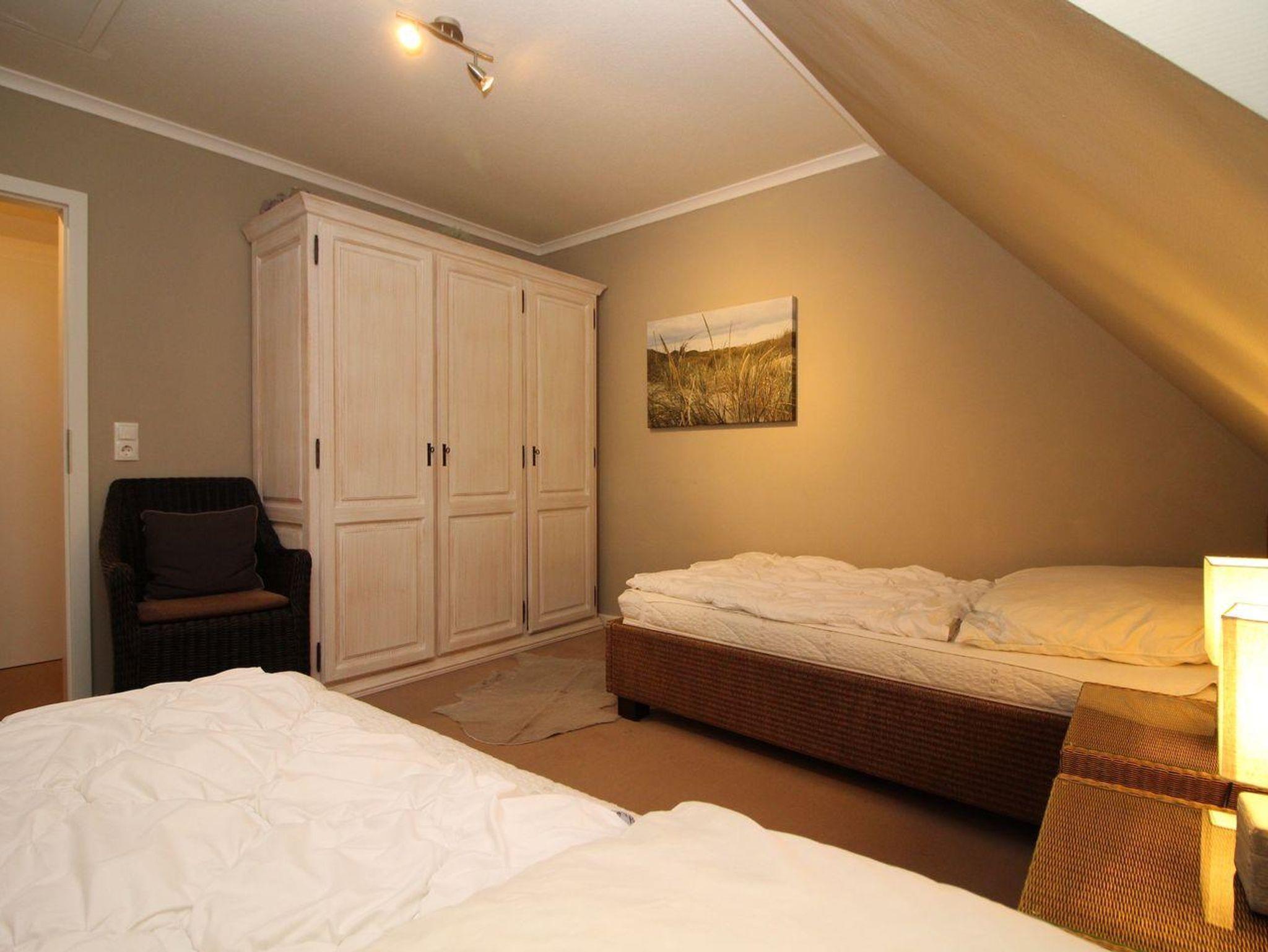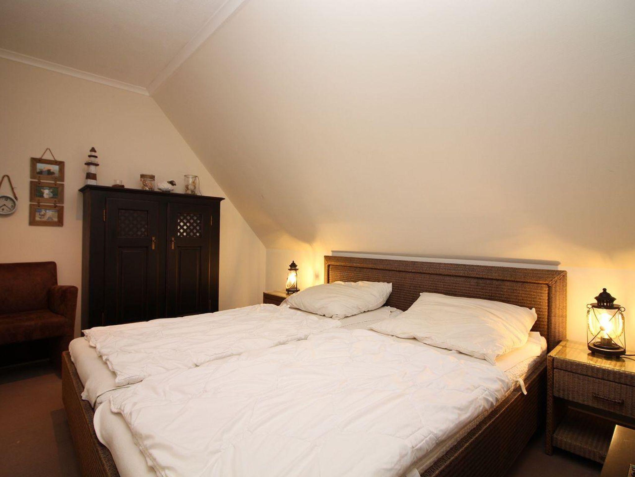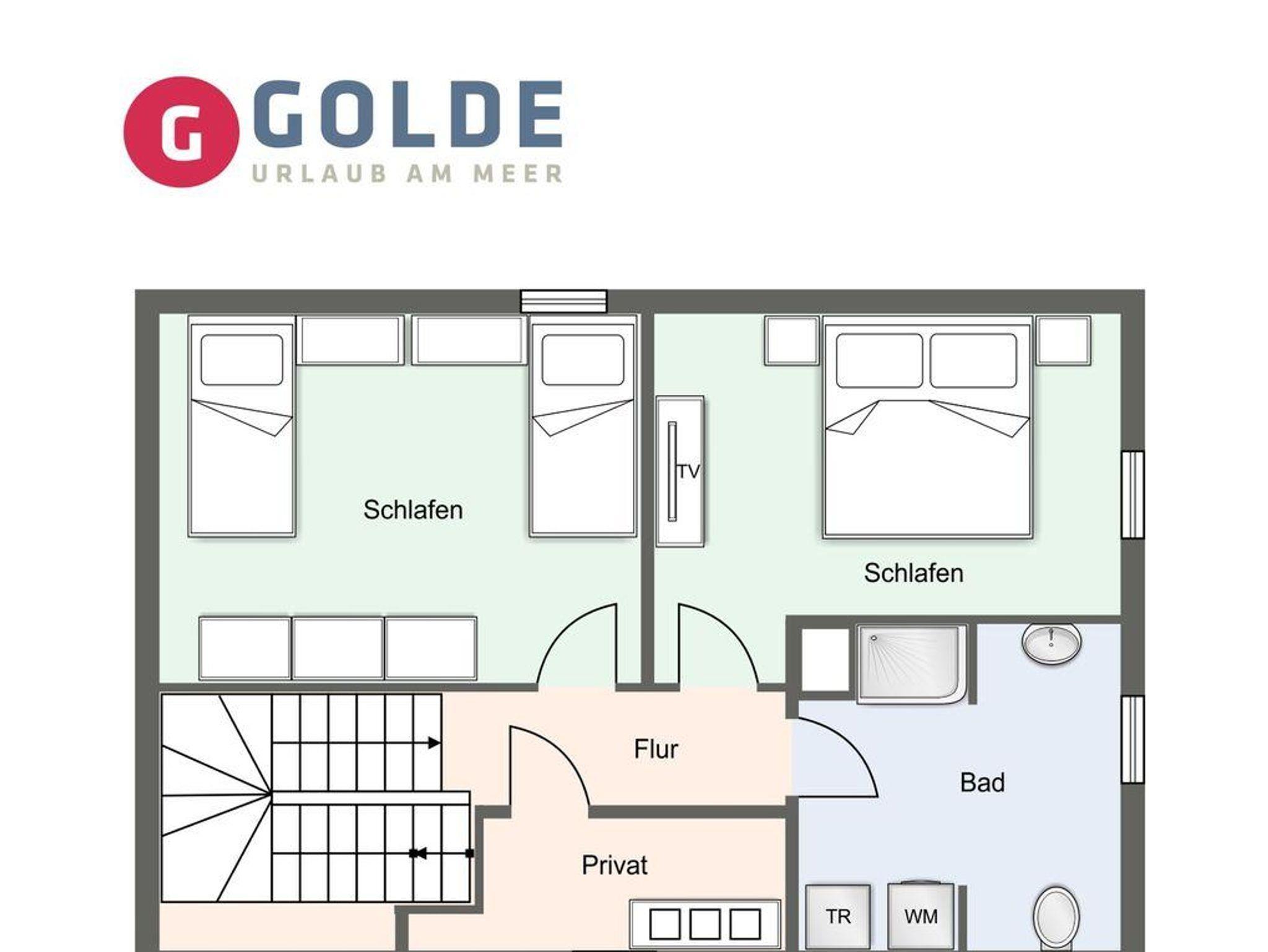 Über eine Holztreppe im Flur gelangt man in das Obergeschoss mit zwei Schlafzimmern. Eines verfügt über ein 180er Bett mit TV und das andere über 2 x 90er Einzelbetten. Außerdem ist im Obergeschoss ein Duschbad.