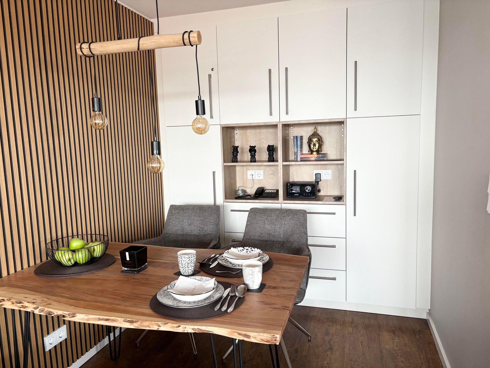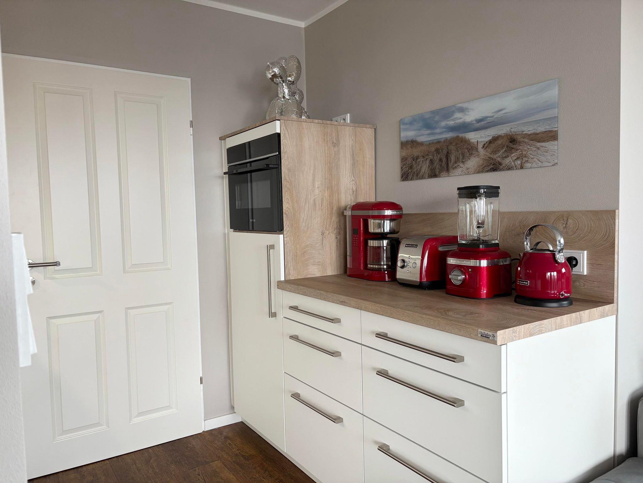 Einraumappartement mit Boxspringbett 1,60 x 2,00 m und Schlafcouch, PVC-Fußboden, Sitzecke, Essecke, Küchenzeile mit Mikrowelle, Geschirrspüler, Durchwahltelefon, Dusche/WC, Kabel-TV, Balkon, PKW-Platz-Nr. 54, Aufzug und Fahrradkeller.