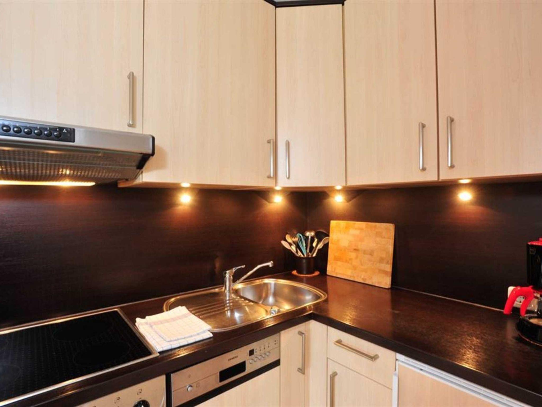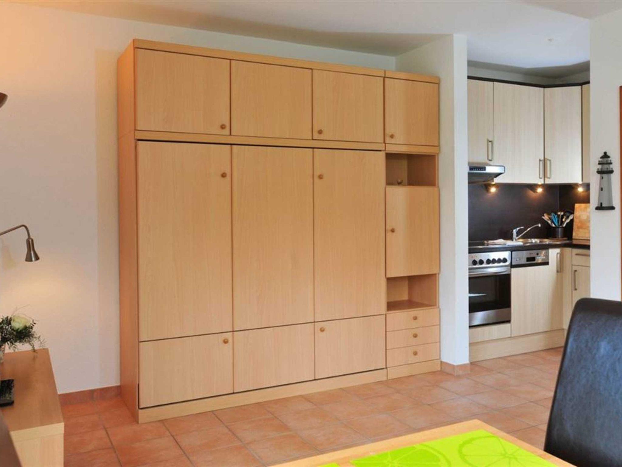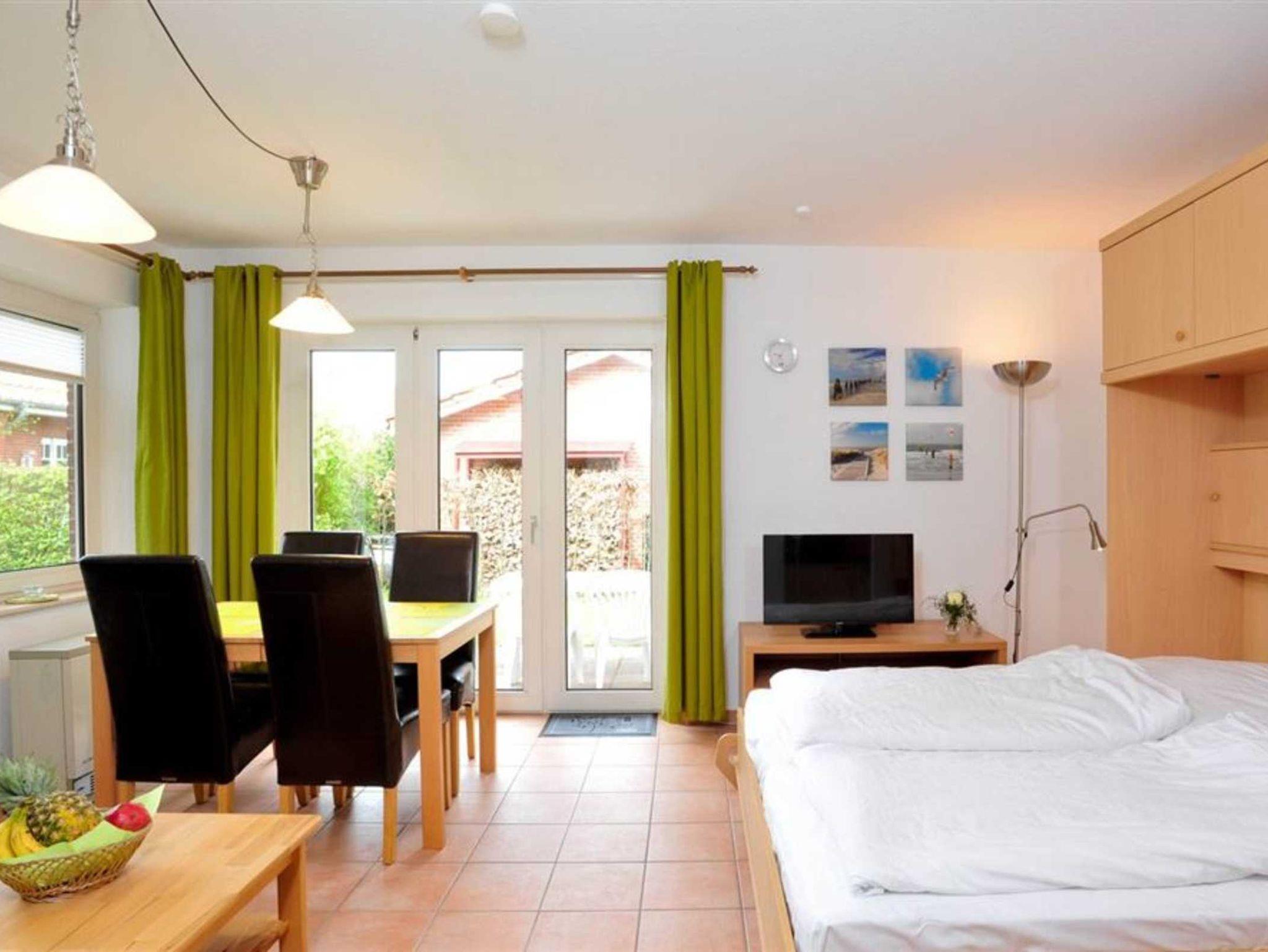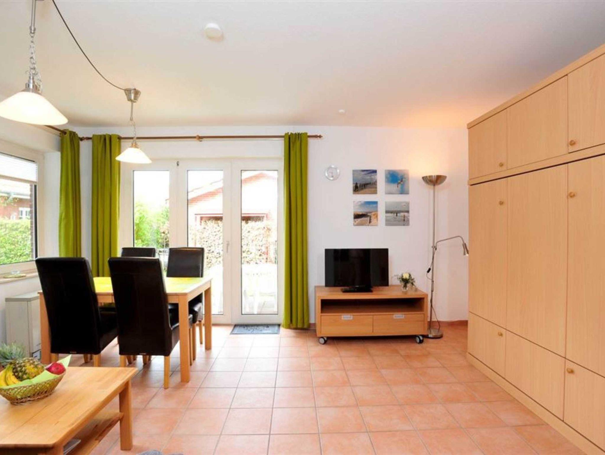 Wohnzimmer mit ausklappbarem Schrank-Doppelbett (2x 90x200cm), gemütlicher Sitz- und Essecke mit 4 Stühlen, TV (Sat), Radio und CD-Player. Direkter Zugang zur möblierten Terrasse nach Südwesten. Offene Küche mit Backofen, Geschirrspüler und Kühlschrank mit Eisfach.