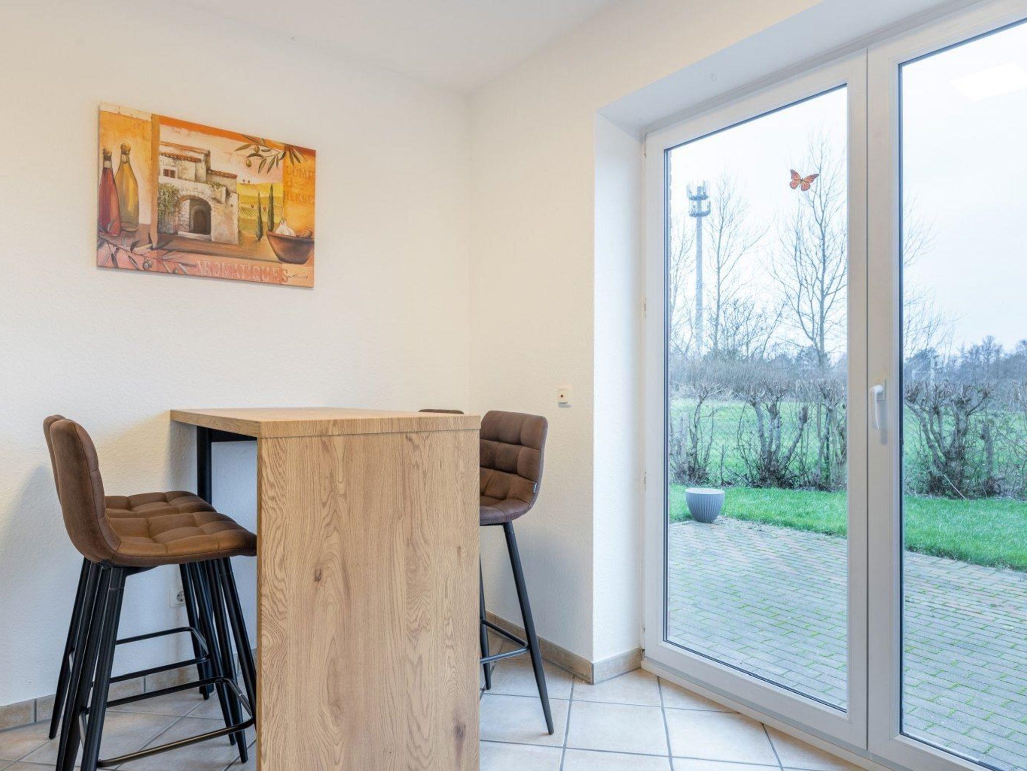 Separate Küche mit Backofen, Mikrowelle, Geschirrspüler, Kühlschrank (ohne Gefrierfach) und Hochtisch mit 4 Barstühlen. Direkter Zugang zur möblierten Gartenterrasse nach Westen.