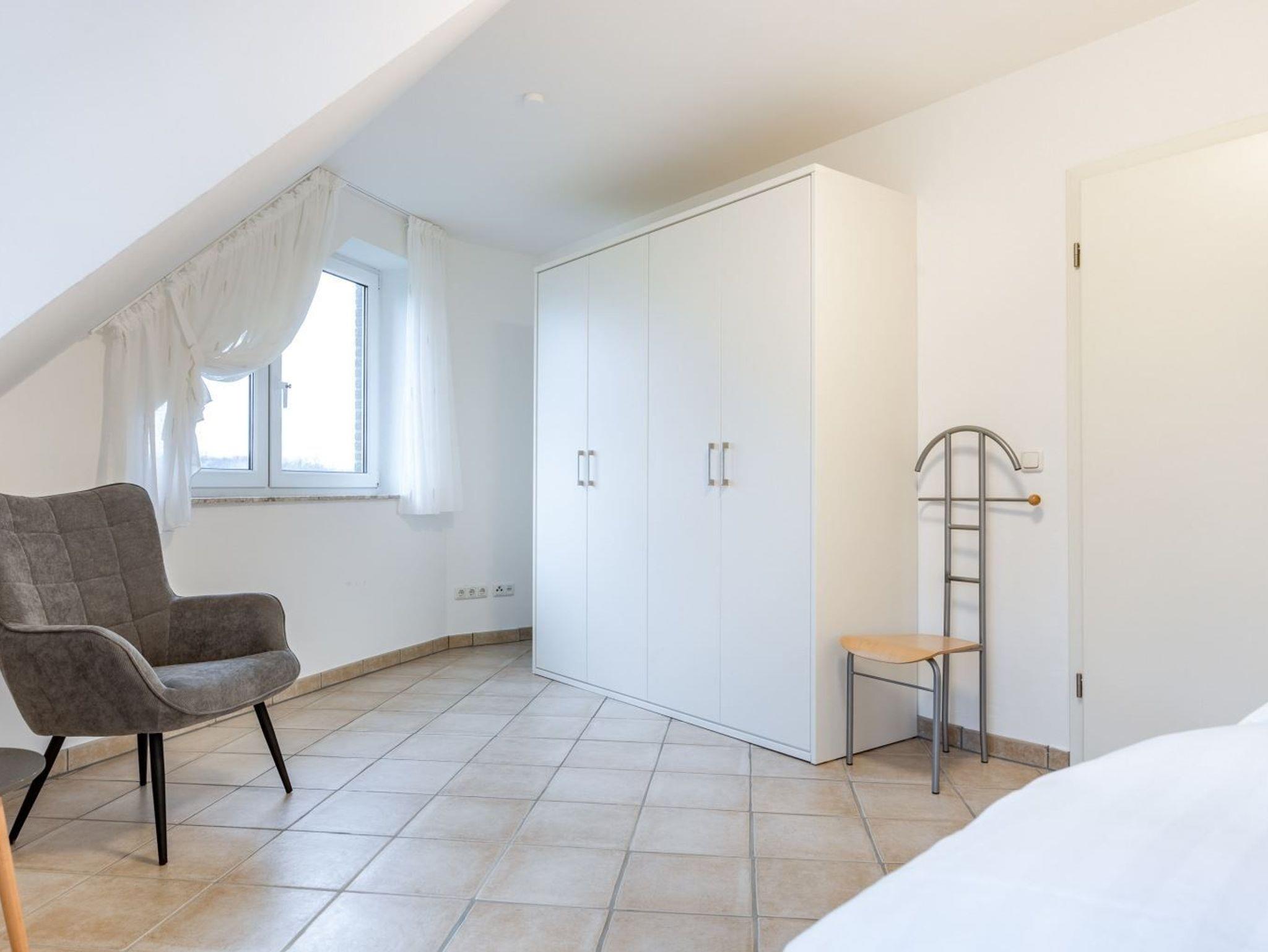 1. Schlafzimmer mit Doppelbett (2x 90x200cm), Stuhl mit Herrendiener, Sessel, Kleiderschrank und Zugang zum Balkon nach Süden.