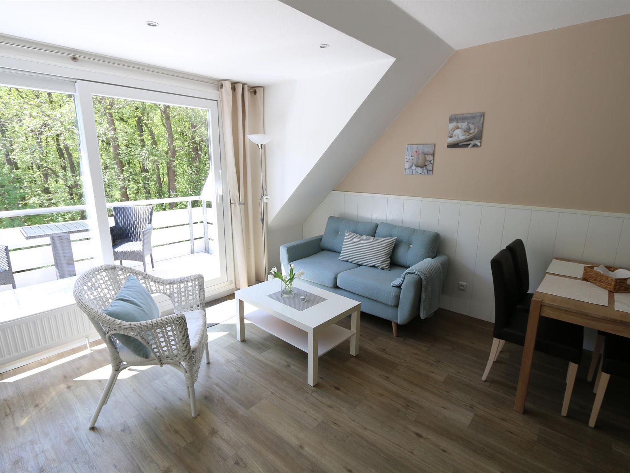 Die moderne und helle Ferienwohnung für 2 - 4 Personen befinden sich im ersten Stock und bieten Ihnen einen separaten Schlafraum mit einem Etagenbett, Flur, Duschbad, sowie einen kombinierten Wohn- Schlafraum (Doppelbett als Schrankbett) mit Küchenzeile. Von dem Südwest-Balkon blickt man in den angrenzenden Wald.