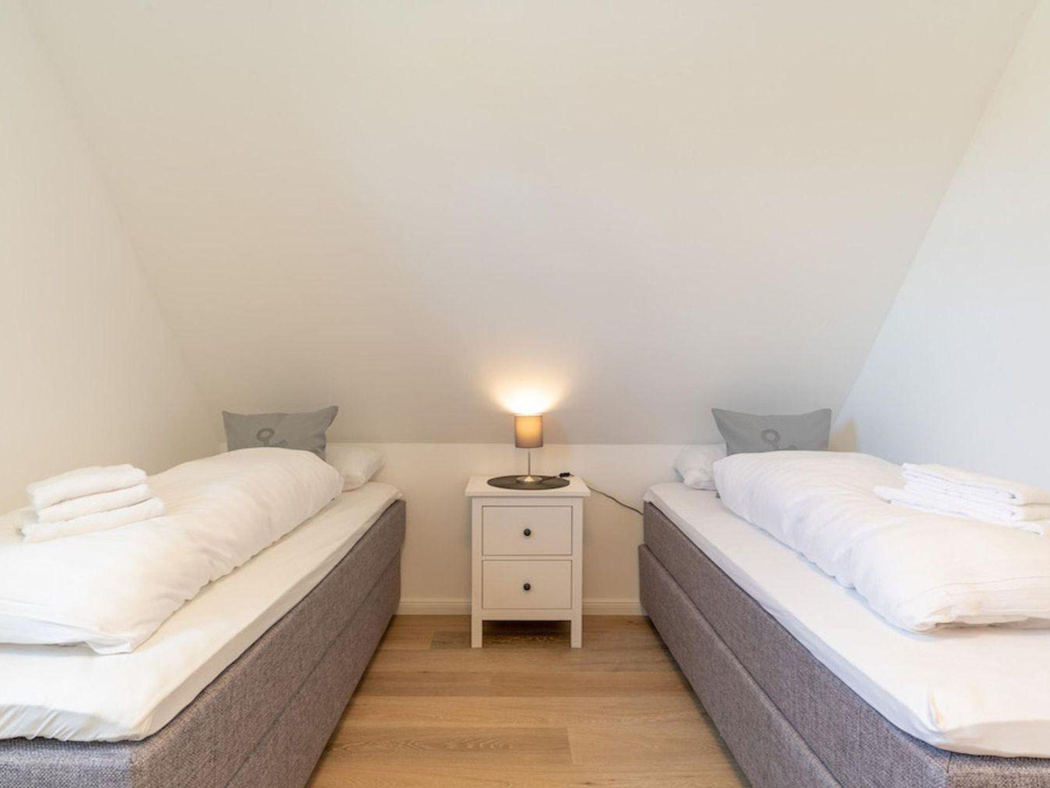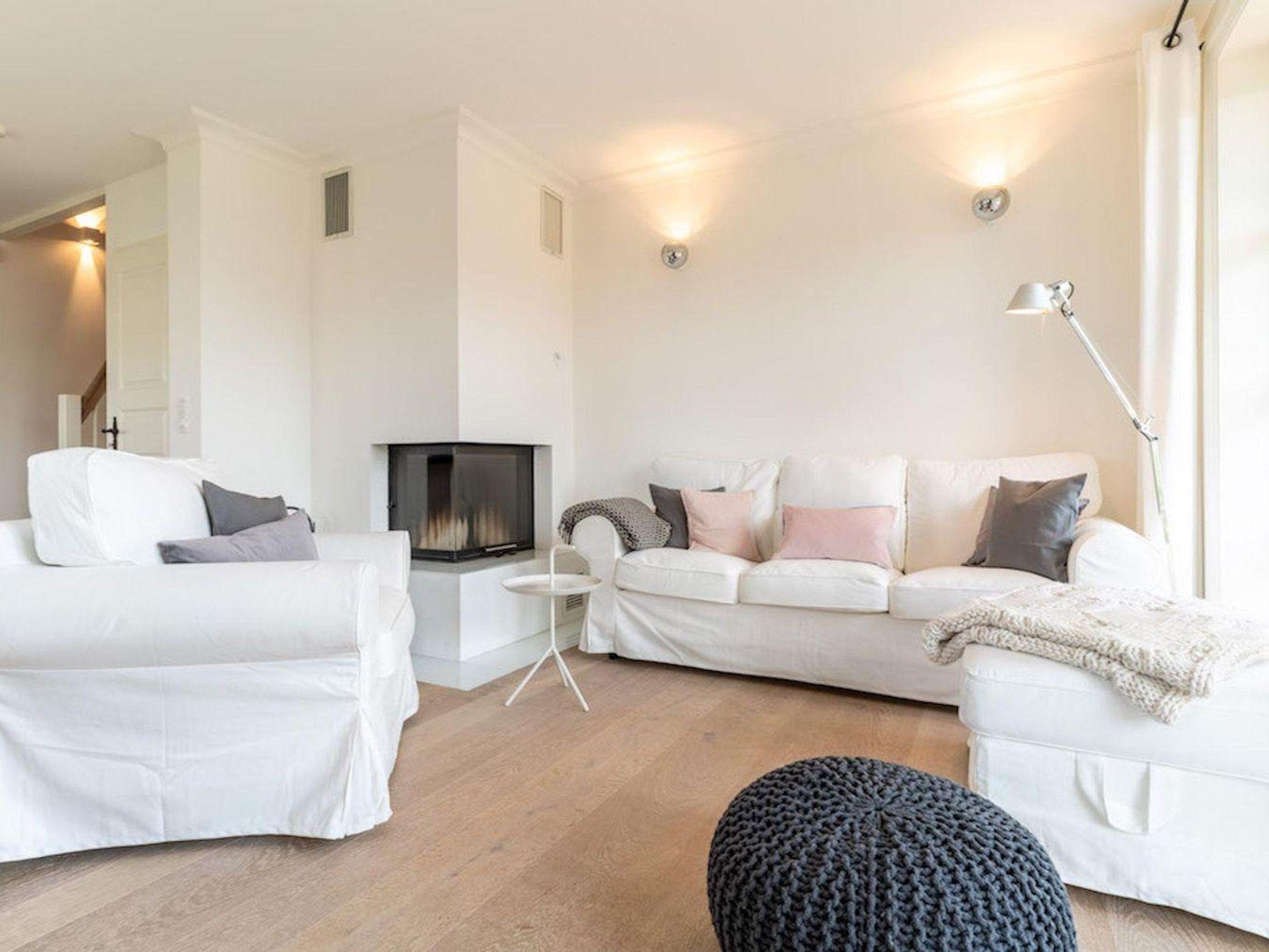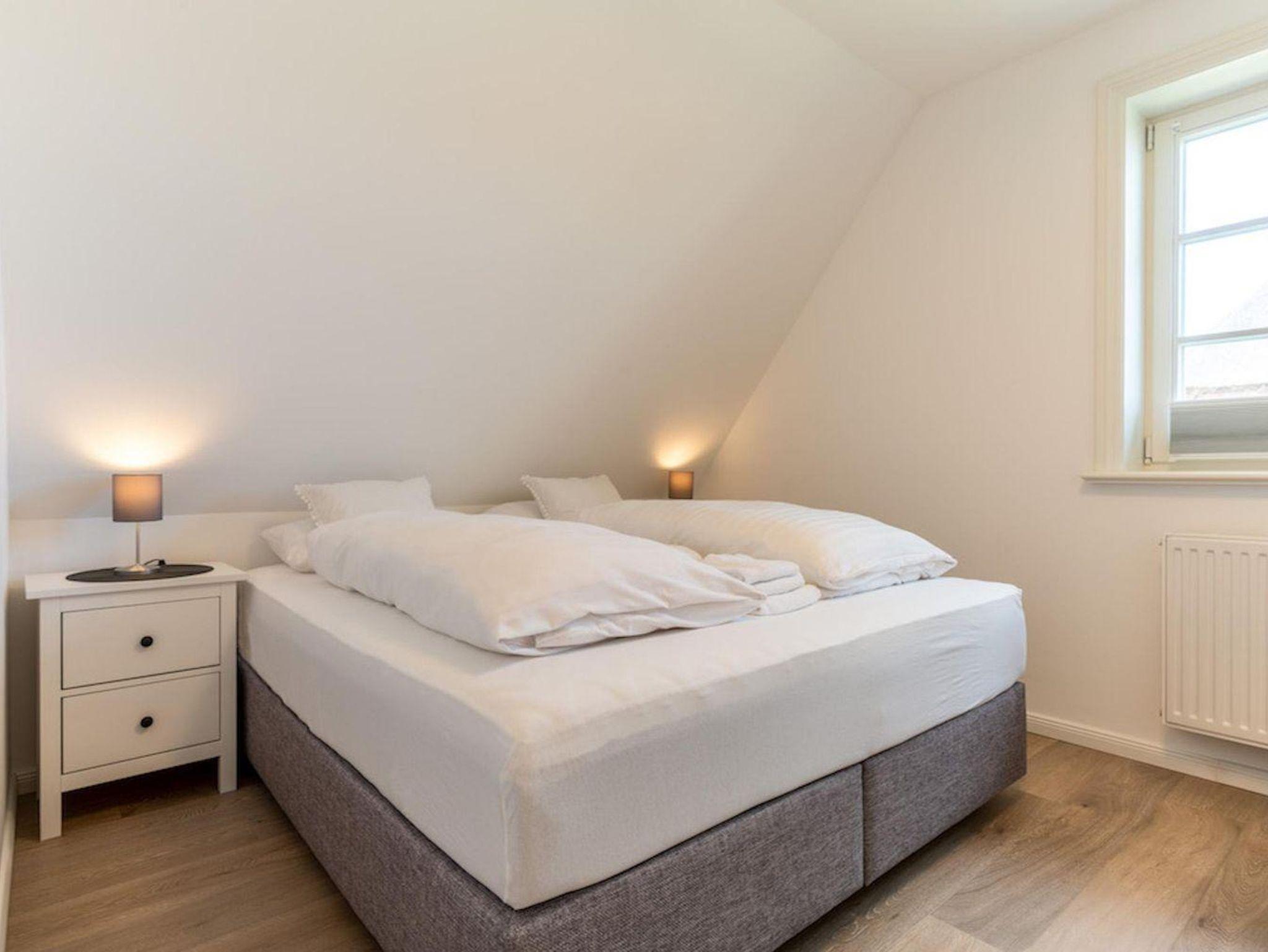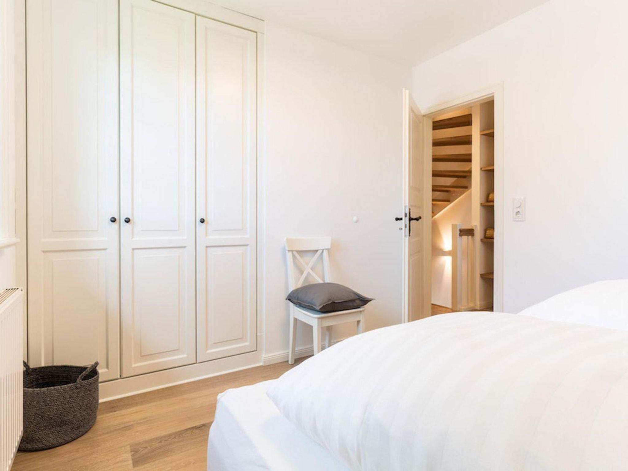 Im Erdgeschoss befindet sich der lichtdurchflutete Wohnraum mit TV, einer offenen Küche sowie einem stilvollen Essbereich. Der Wohnraum ist mit stylischen Möbeln, Kamin und hochwertigem Parkett ausgestattet. Die voll ausgestattete Küche verfügt über hochwertige Elektrogeräte, allerlei nützliches und schönes Equipment lässt bei Hobbyköchen keine Wünsche offen. An den Wohnbereich schließen sich Flur, Hauswirtschaftsraum und ein Duschbad an. Über eine Holztreppe gelangt man in das ebenso mit Parkett ausgelegte Obergeschoss. Die beiden Schlafzimmer, eines mit einem Doppelboxspringbett und ein weiteres mit 2 Einzelboxspringbetten sorgen für ruhevolle Erholung. Einbauschränke gewähren Ihnen hinreichend Ablageflächen. Darüber hinaus befindet sich im Obergeschoss ein weiteres, geräumiges Bad mit Dusche und großer Eckbadewanne.