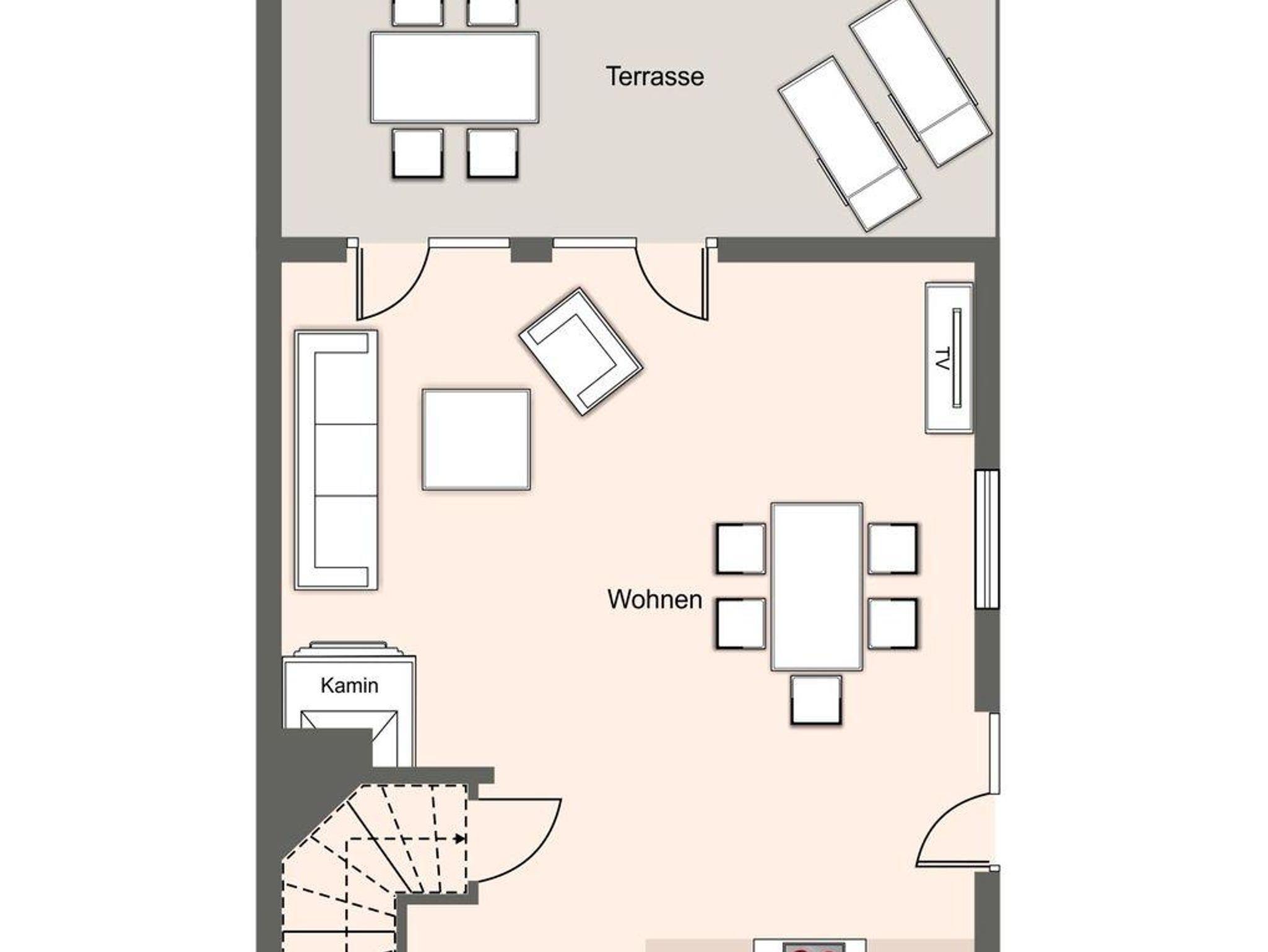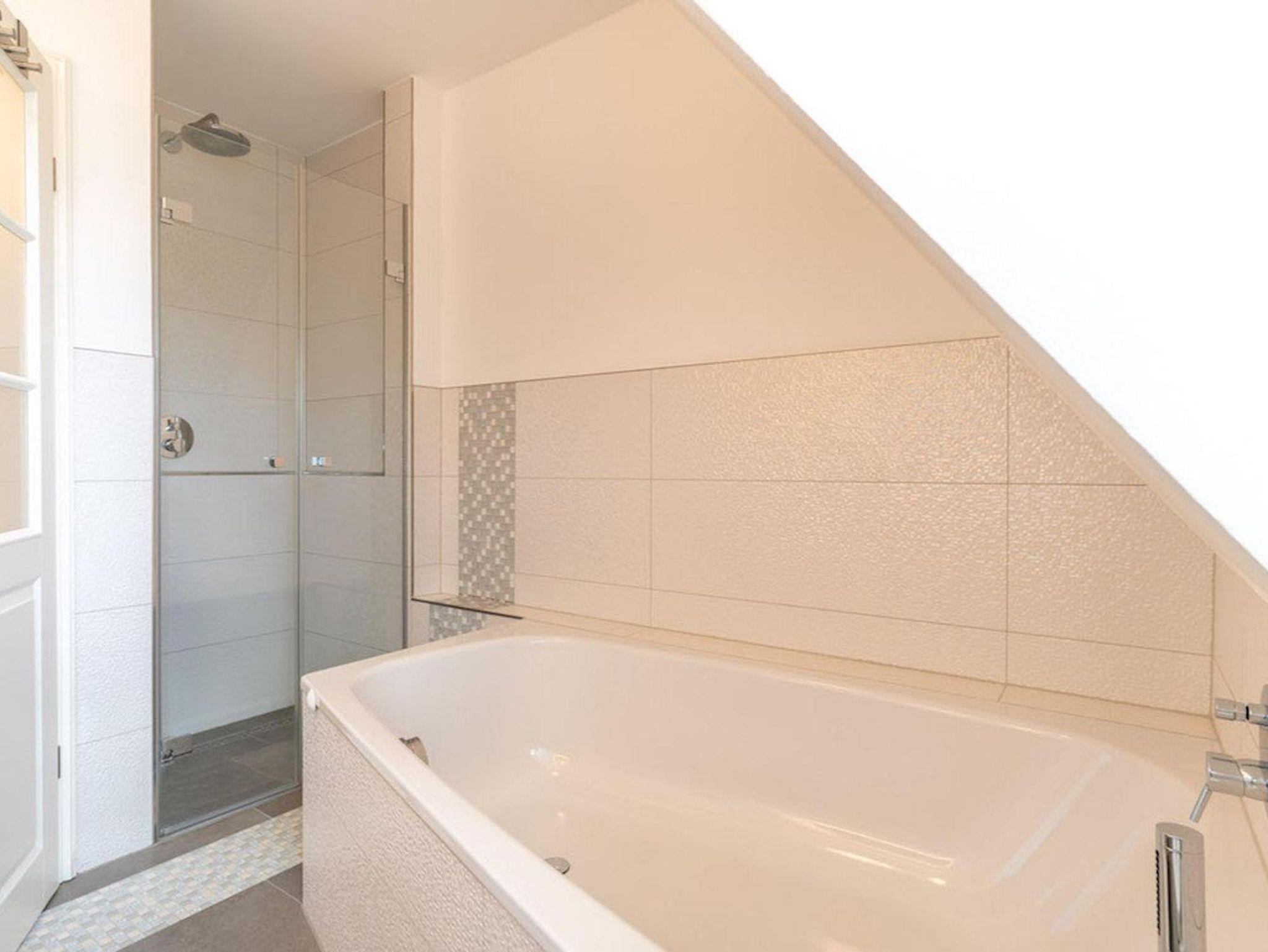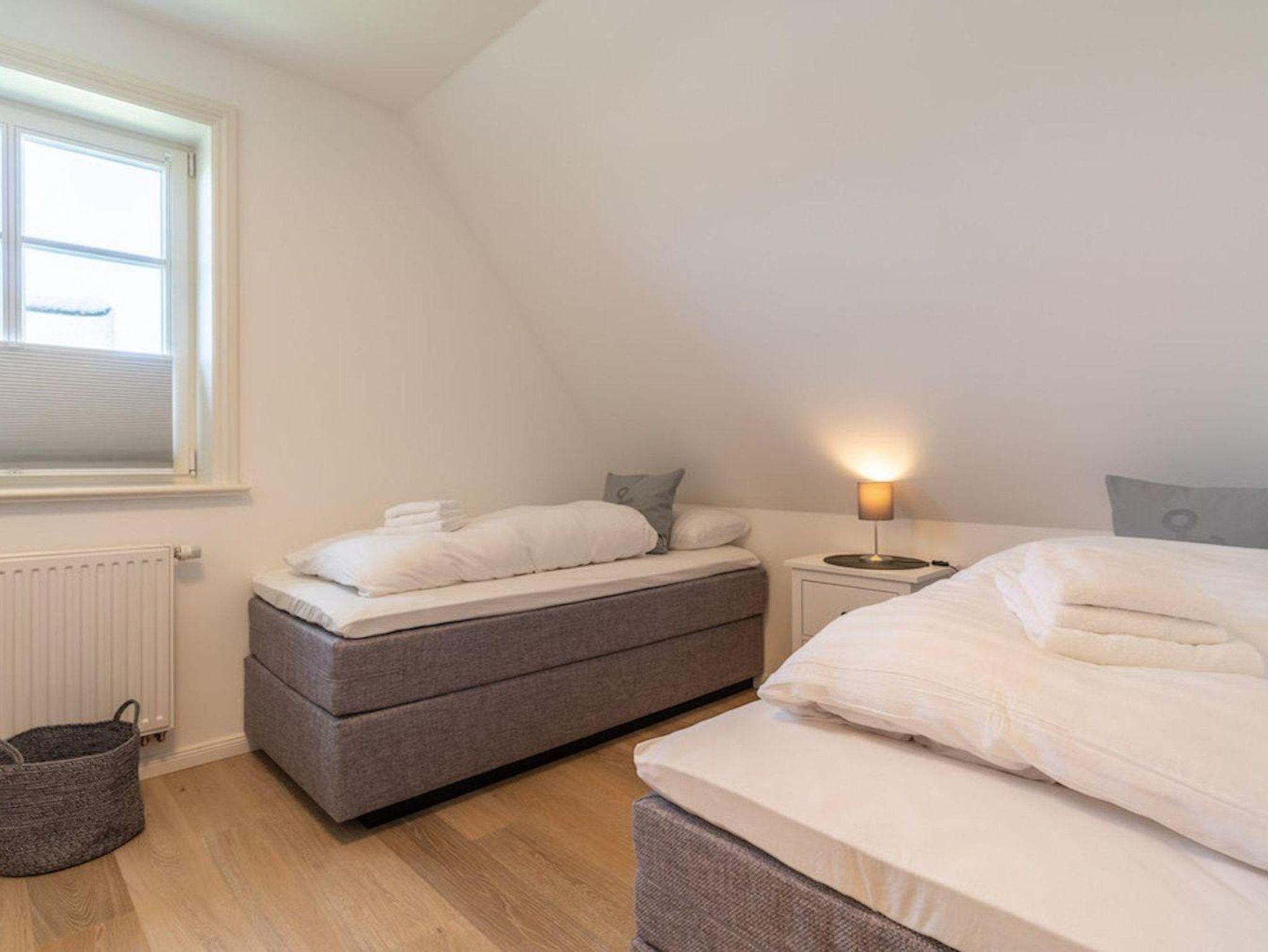 Im Erdgeschoss befindet sich der lichtdurchflutete Wohnraum mit TV, einer offenen Küche sowie einem stilvollen Essbereich. Der Wohnraum ist mit stylischen Möbeln, Kamin und hochwertigem Parkett ausgestattet. Die voll ausgestattete Küche verfügt über hochwertige Elektrogeräte, allerlei nützliches und schönes Equipment lässt bei Hobbyköchen keine Wünsche offen. An den Wohnbereich schließen sich Flur, Hauswirtschaftsraum und ein Duschbad an. Über eine Holztreppe gelangt man in das ebenso mit Parkett ausgelegte Obergeschoss. Die beiden Schlafzimmer, eines mit einem Doppelboxspringbett und ein weiteres mit 2 Einzelboxspringbetten sorgen für ruhevolle Erholung. Einbauschränke gewähren Ihnen hinreichend Ablageflächen. Darüber hinaus befindet sich im Obergeschoss ein weiteres, geräumiges Bad mit Dusche und großer Eckbadewanne.