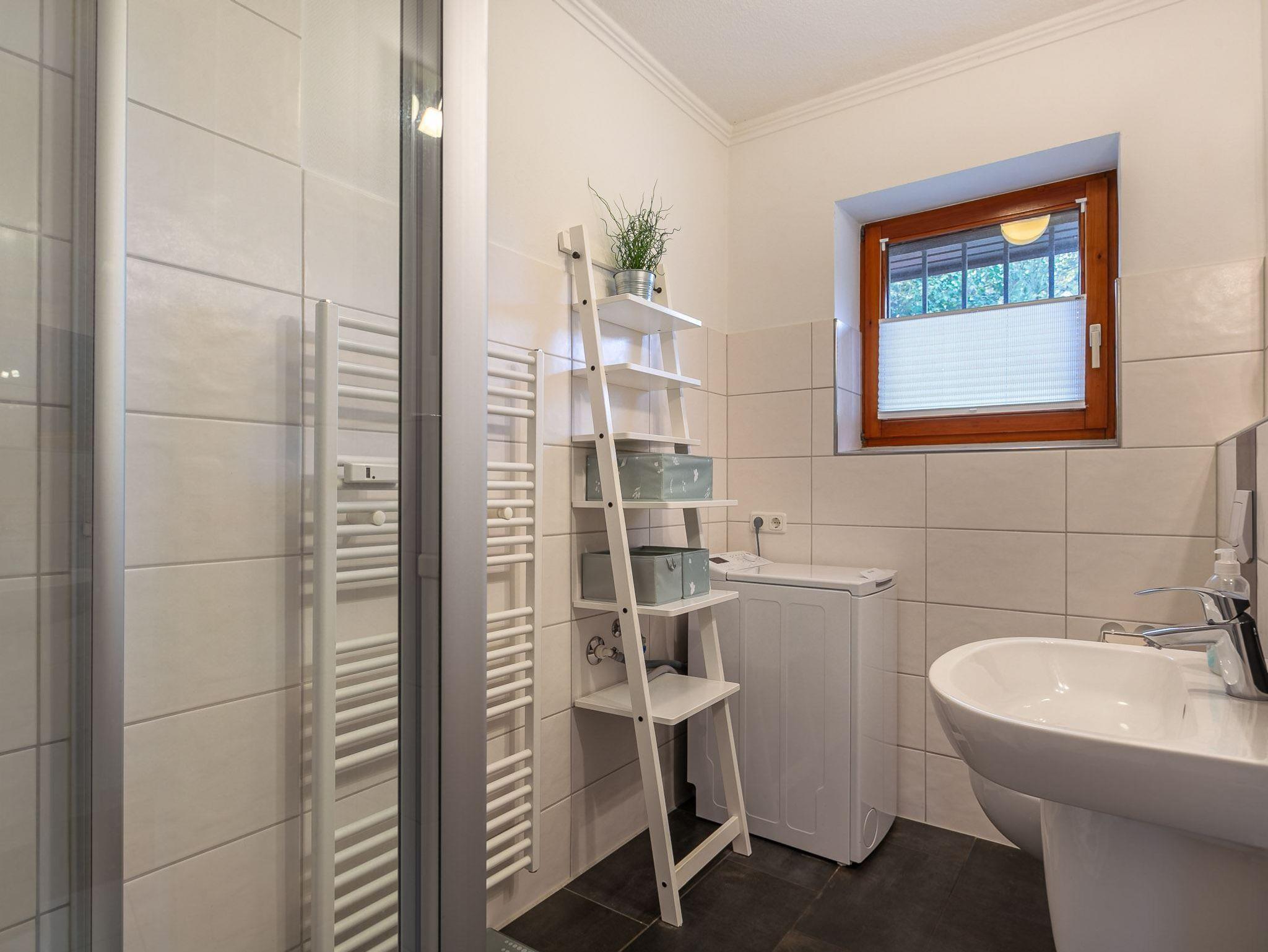 Modernes Badezimmer (Duschbad) mit Dusche, WC, Handtuchwärmer, Föhn, Toploader-Waschmaschine und Tageslicht.