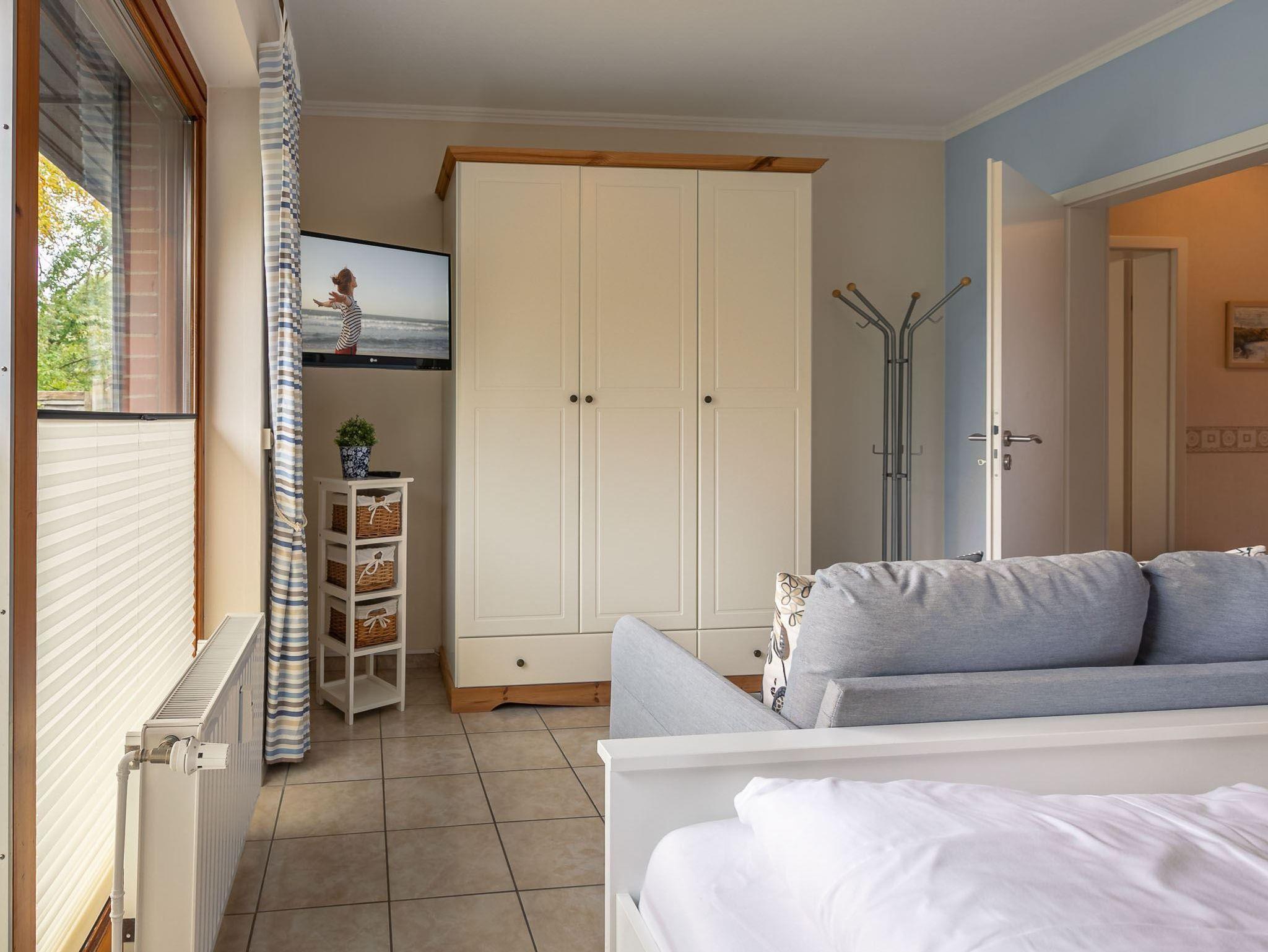 Maritim-romantisches Schlafzimmer mit Doppelbett (2x 90x200cm), Sofa (2er), Kleiderschank und TV. Ebenfalls direkter Zugang zur Gartenterrasse.