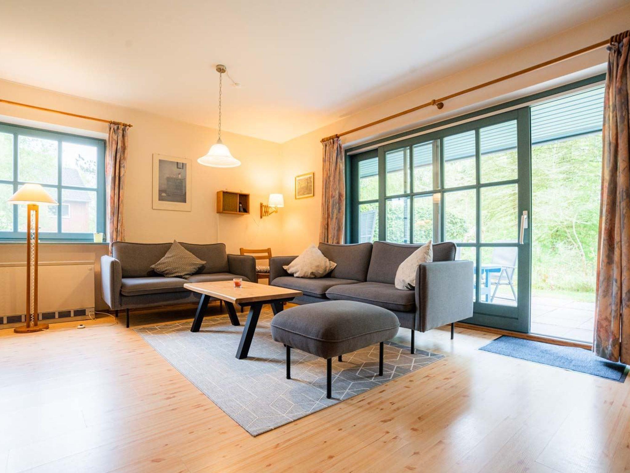 Wohnzimmer mit zwei Sofas (3er und 2er) und einem Sessel, TV (Kabel), Radio mit CD-Player, behaglichem Kaminofen und Esstisch mit 4 Stühlen. Direkter Zugang zur möblierten und windgeschützten Gartenterrasse nach Süden mit Strandkorb.