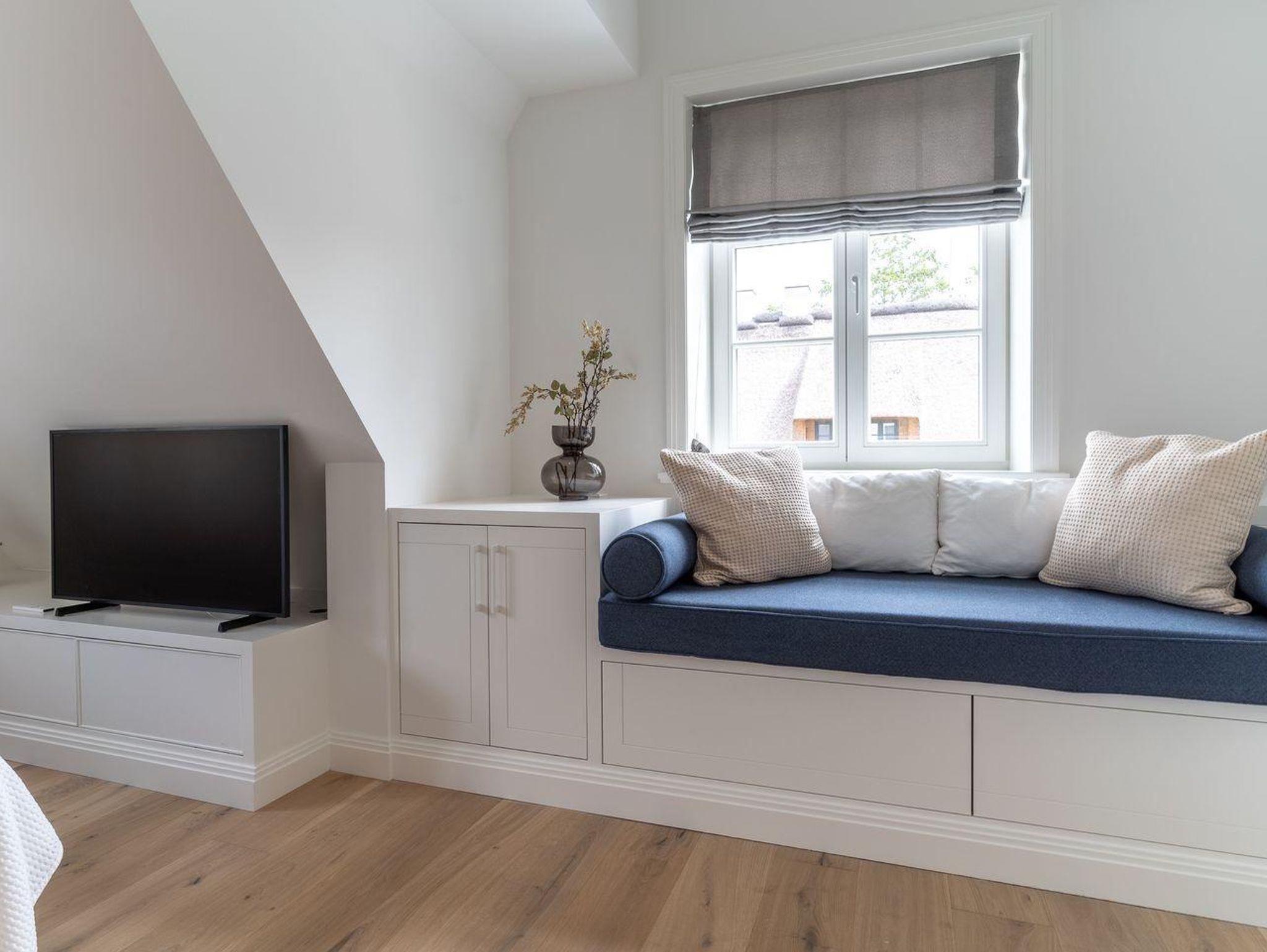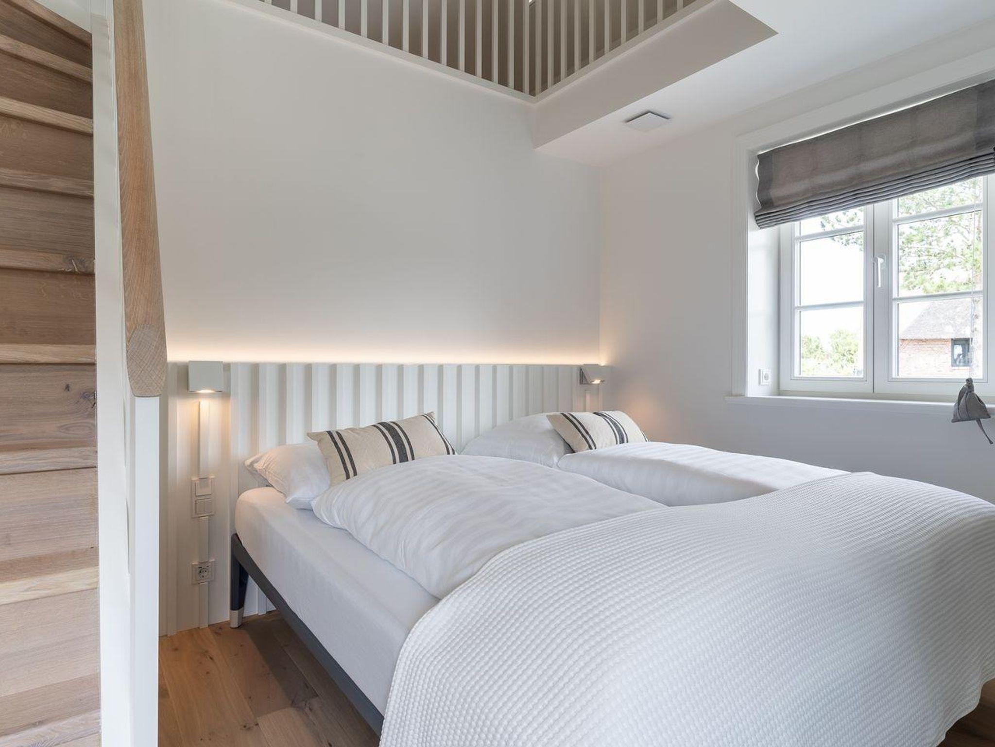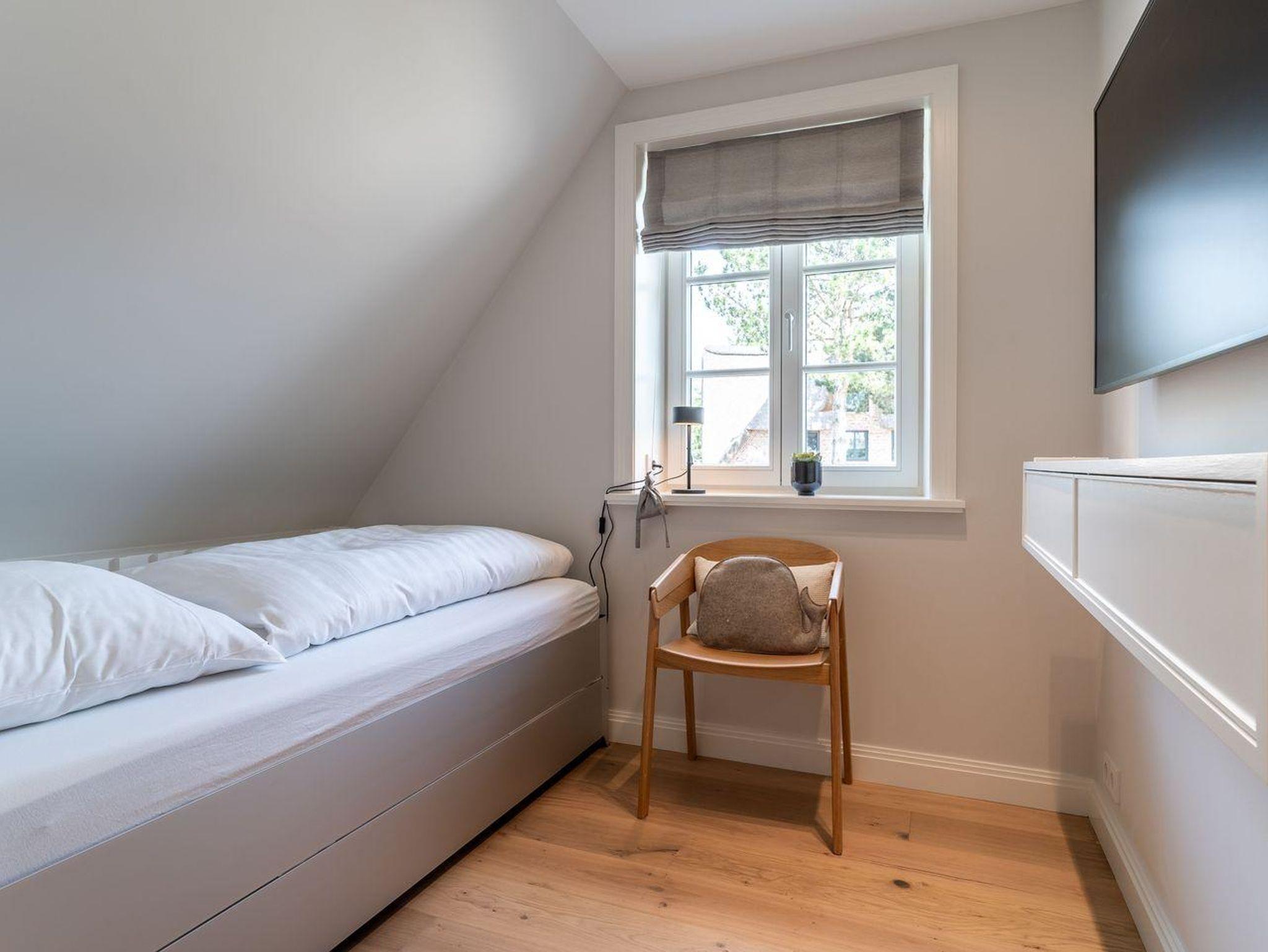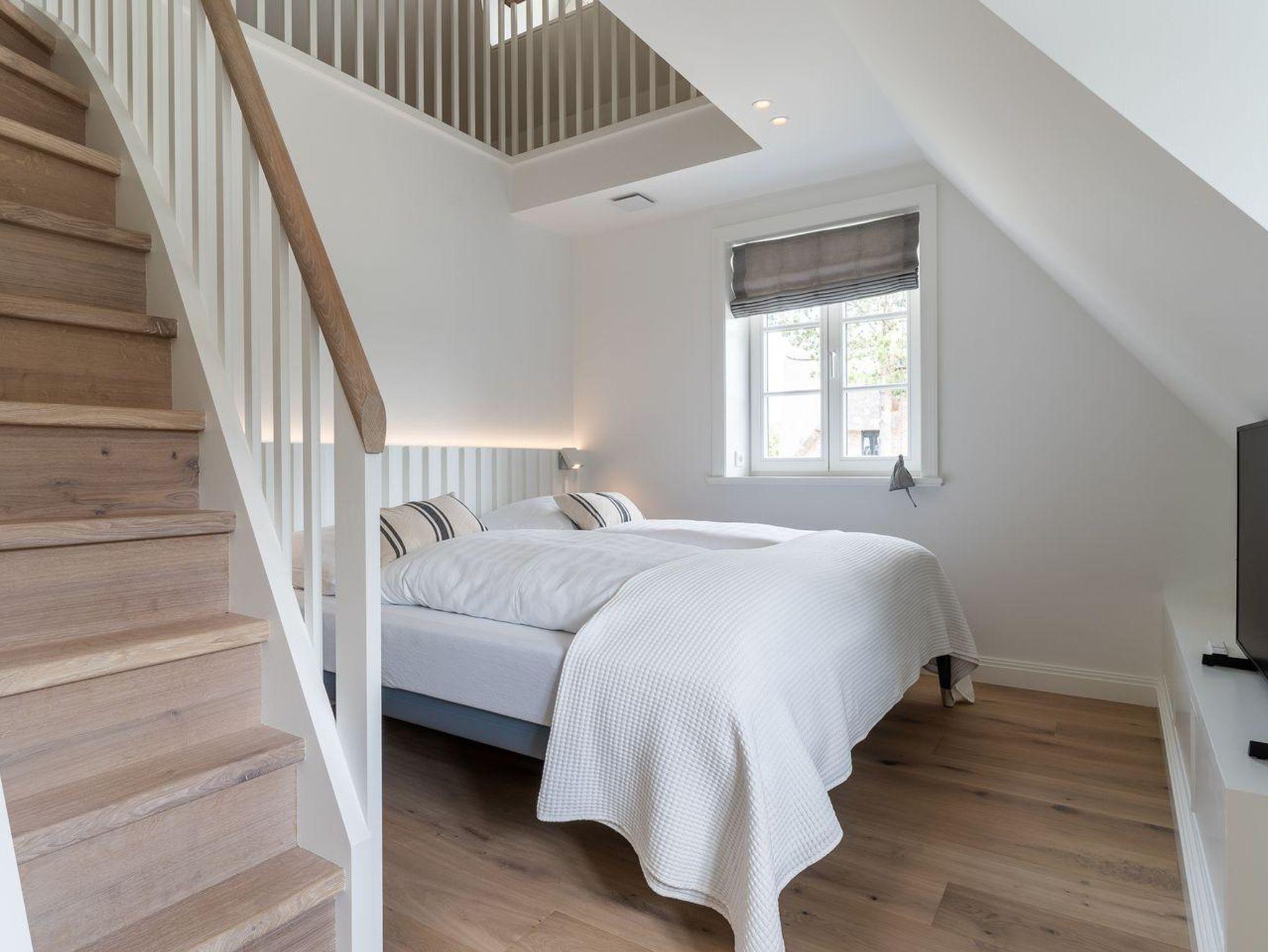 Über eine Holztreppe gelangt man in das Obergeschoss. Die zwei Schlafzimmer, eines mit einem Doppelbett und eines mit einem Einzelbett sind mit einem TV ausgestattet. Kleiderschränke gewähren Ihnen viel Stauraum.