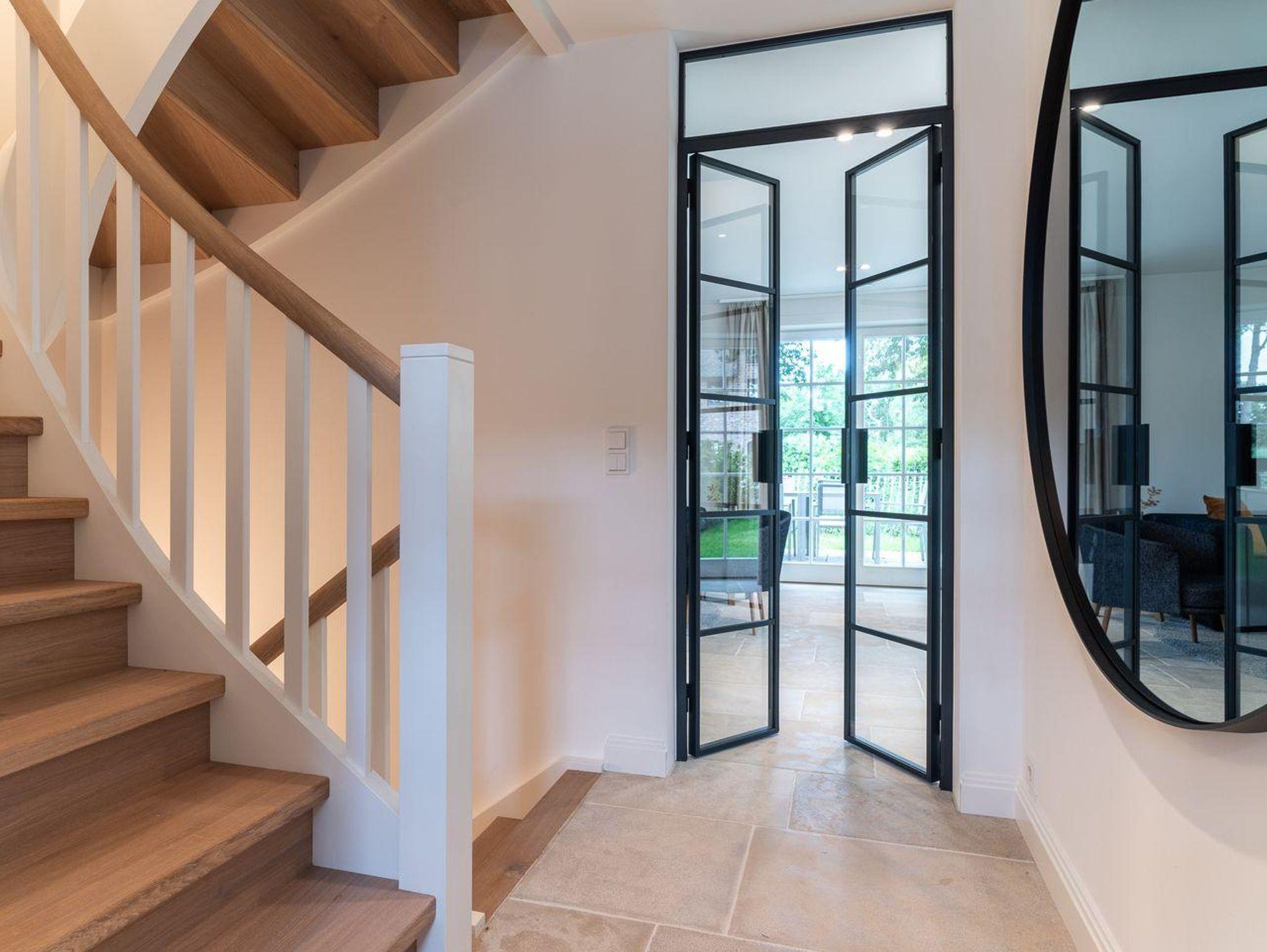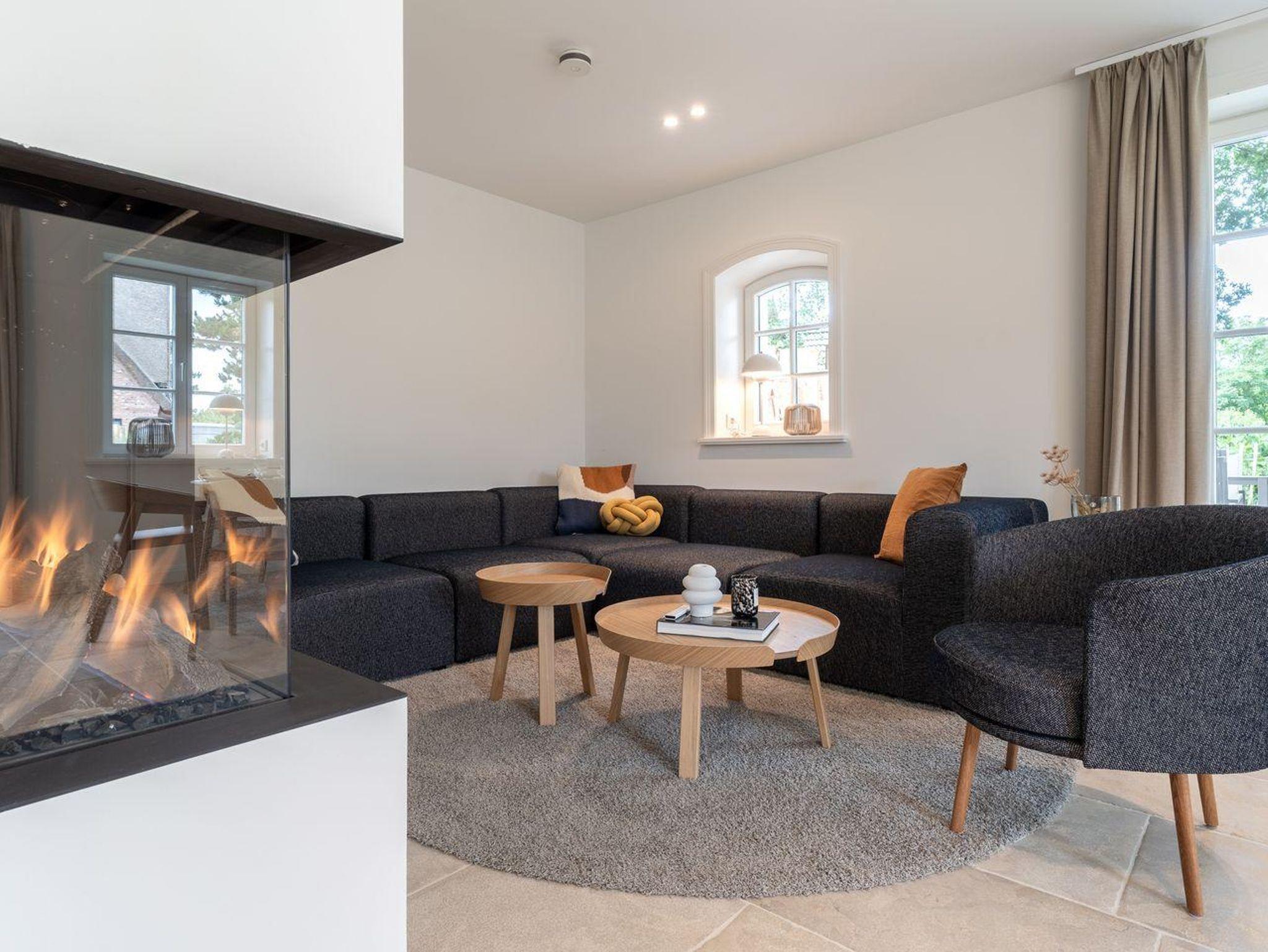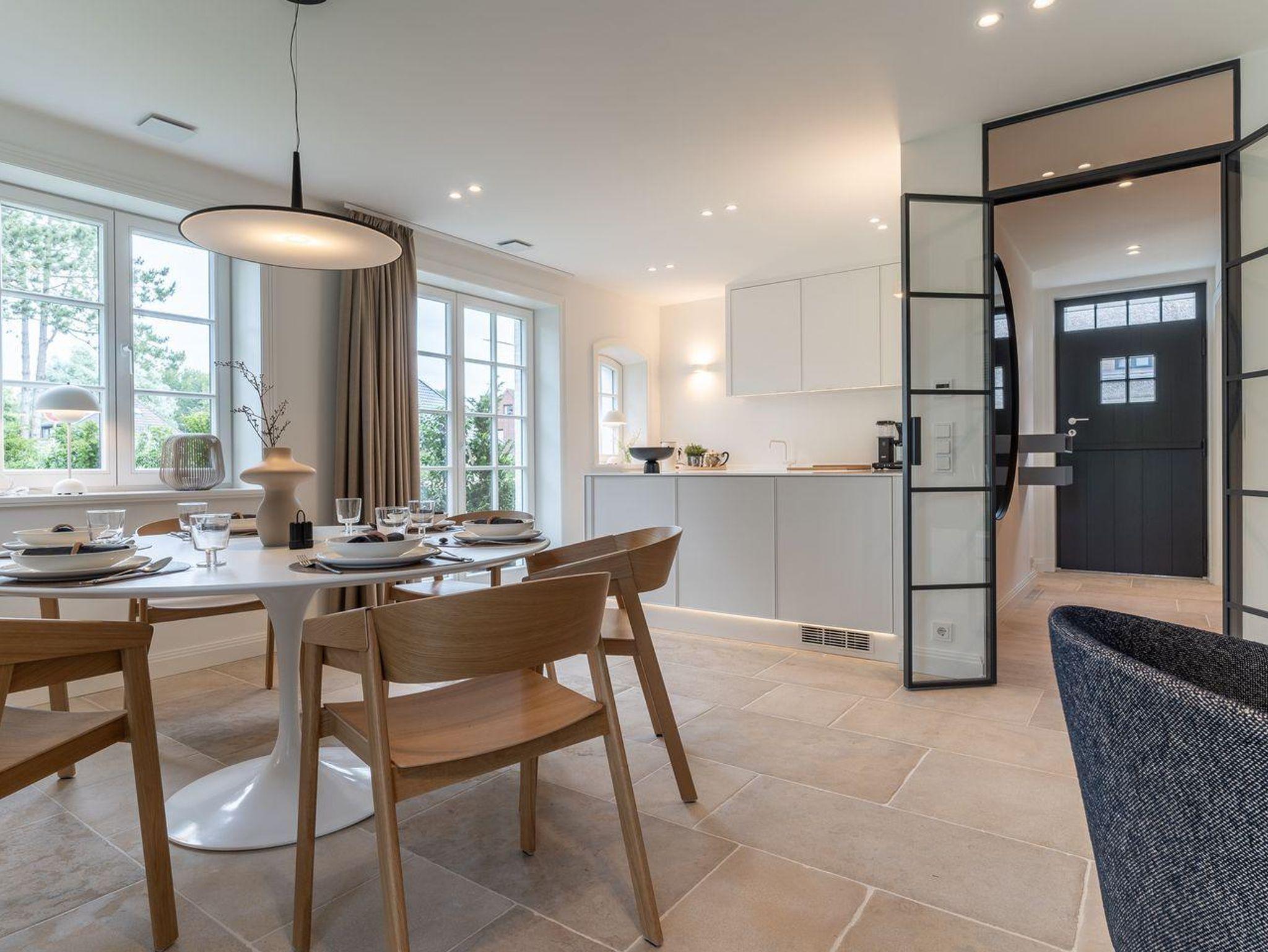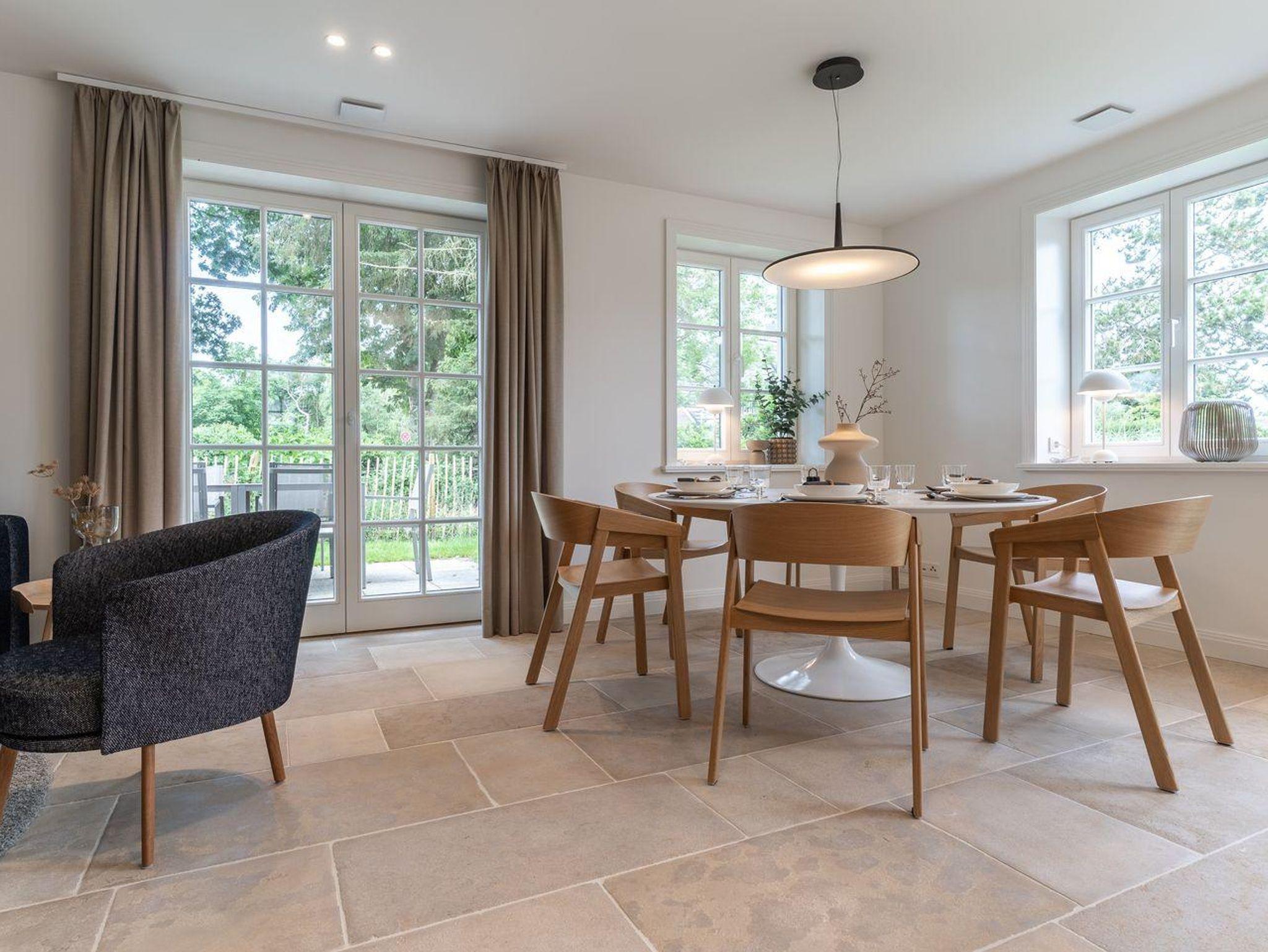 Im Erdgeschoss erwartet Sie ein lichtdurchflutetes Wohnzimmer mit Gaskamin und TV, eine offene Küche sowie ein gemütliches Esszimmer. Die Küche verfügt über hochwertige Elektrogeräte und genügend Platz zum gemeinsamen Kochen. An den Wohnbereich schließt sich ein Flur sowie ein Gäste-WC an.
