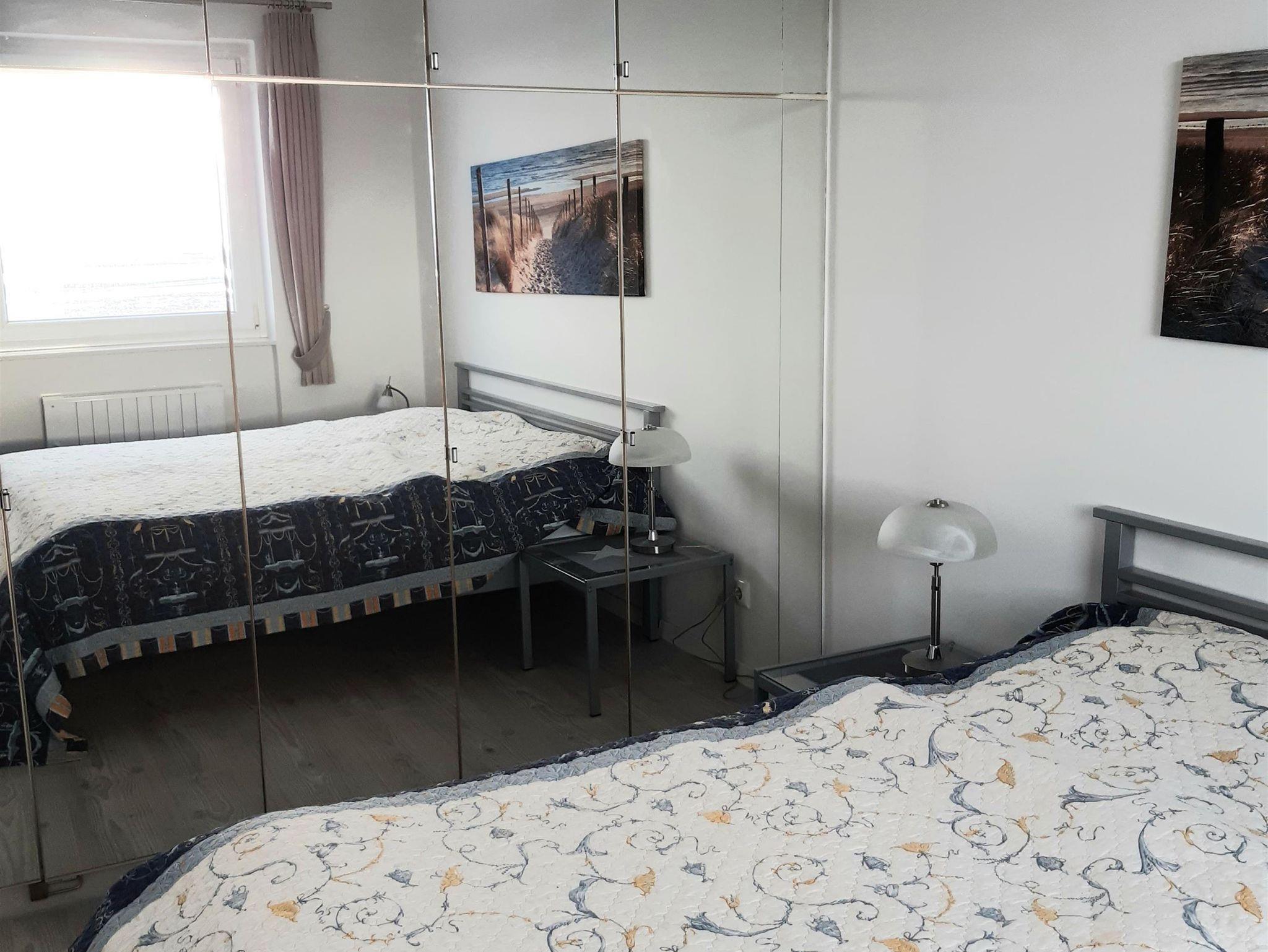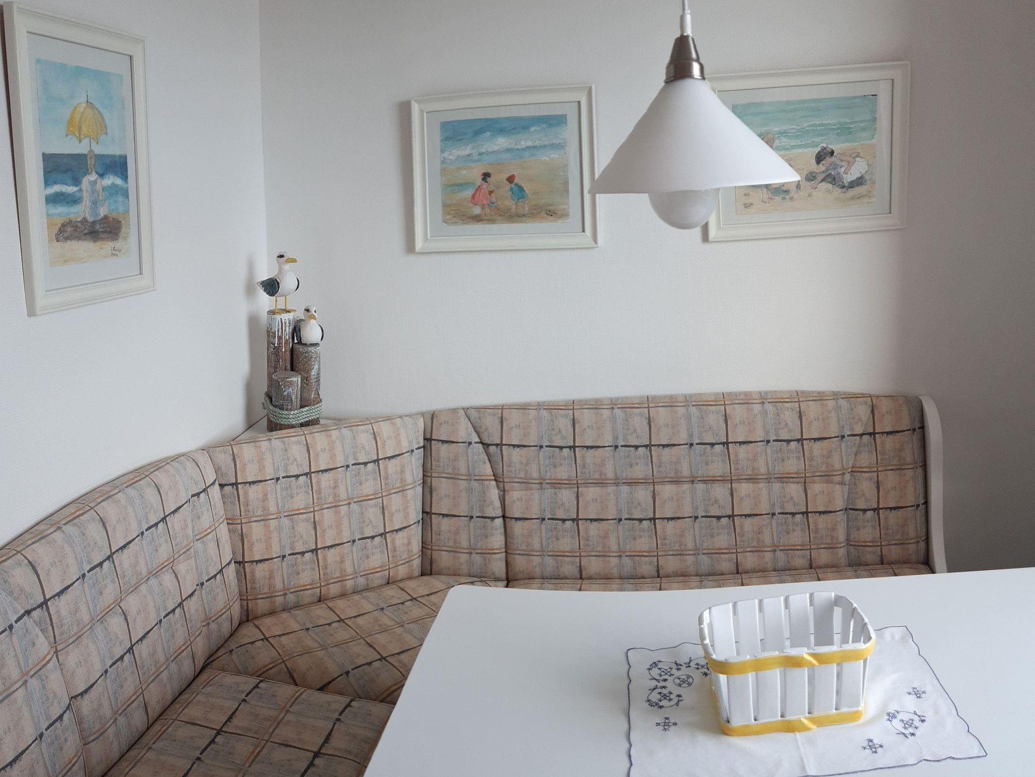 Nichtraucherwohnung, kleiner Eingangsbereich mit Garderobe u. Spiegel. Wohn-Schlafzimmer mit 2 getrennten Einzelschrankbetten (je 80x1.90), bequemen Sitzbereich mit Sofa, Sessel mit Hocker, SAT-TV, Flachbildschirm, Radio, DVD-Player, kein WLAN. Separate Küche mit gemütlicher Ecksitzbank mit Blick auf die Nordsee, 2-Platten-Ceranfeld, Mikrowelle mit Grillfunktion, Kühlschrank mit kleinem Gefrierfach, Wasserkocher, Kaffeemaschine. Separates Schlafzimmer mit Doppelbett (je 90x1.90) und Kleiderschrank, Verdunklungsvorhänge (auch im Wohnzimmer). Bad mit Dusche (Haltegriff), Waschbecken, großem Spiegel, Kosmetikspiegel u. WC. Kinderreisebett und Kinderhochstuhl sind zu buchbar. Kleiner Abstellraum mit Wäscheständer, Föhn, Bügeleisen und Bügelbrett.