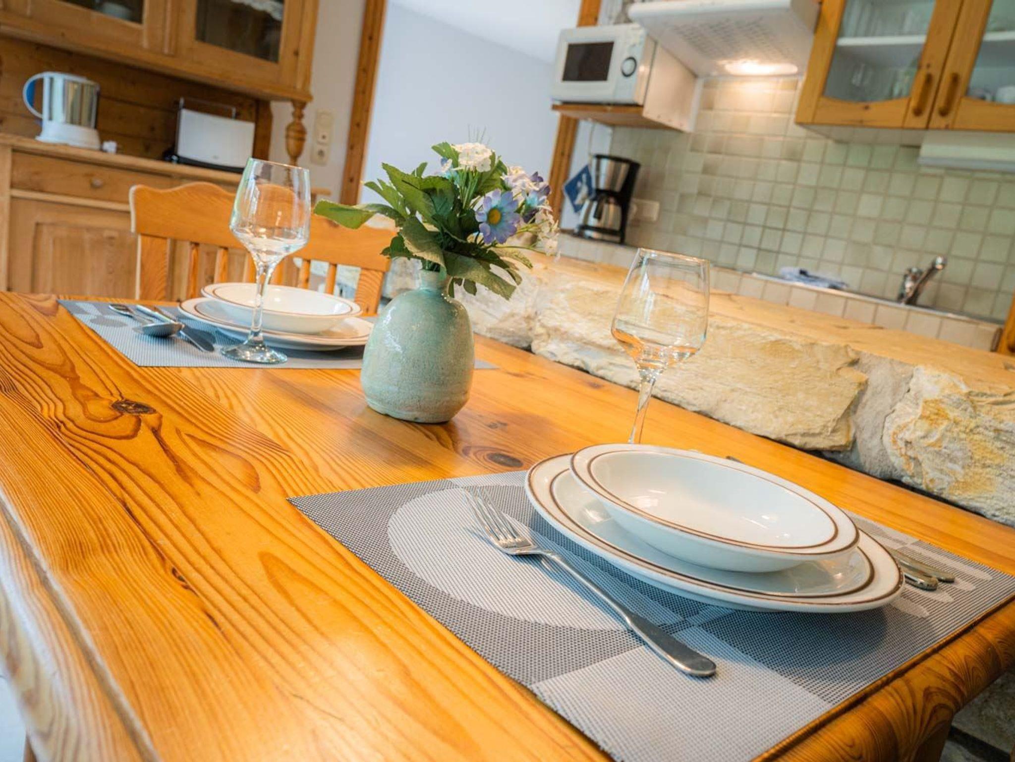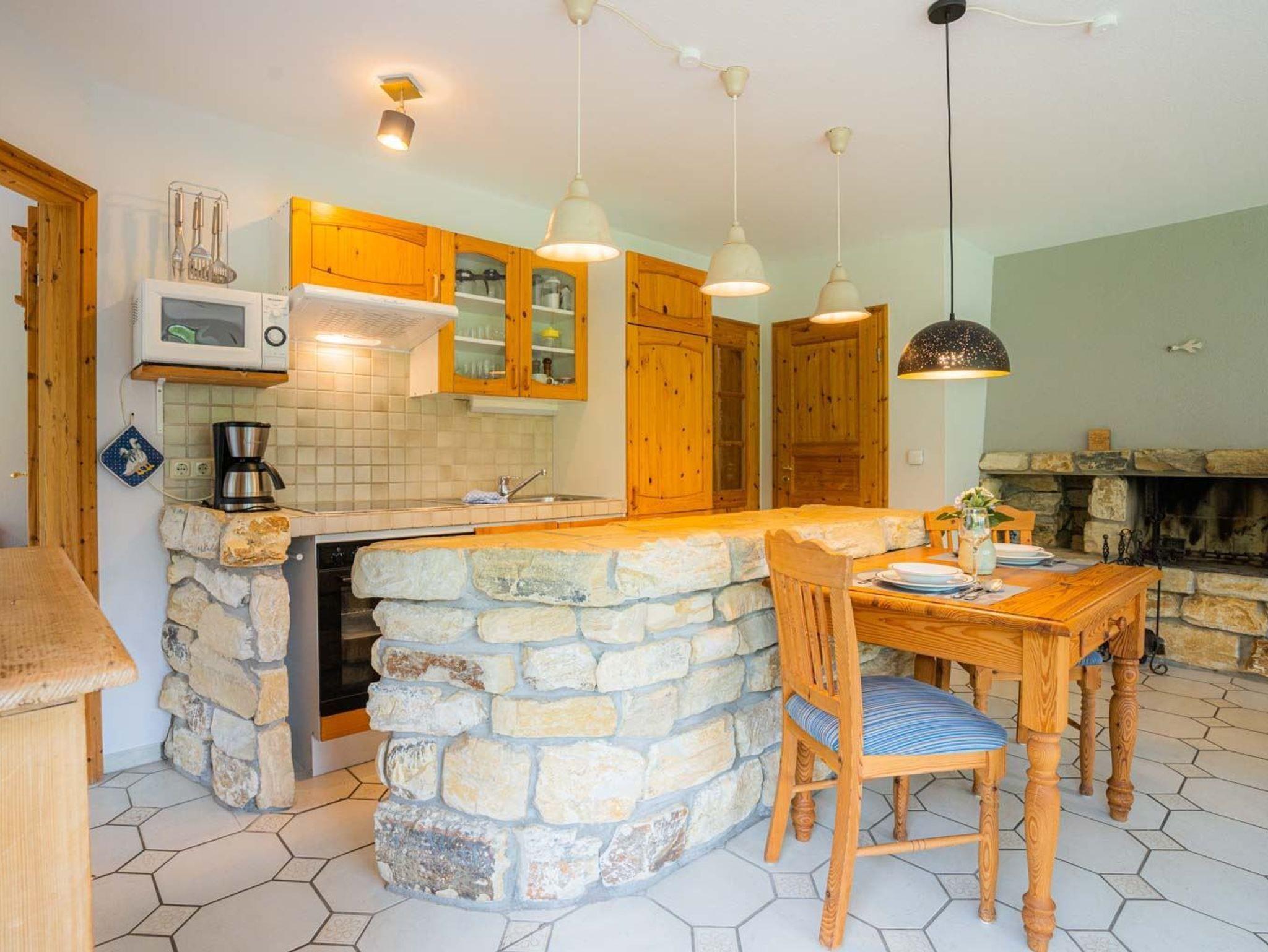 Wohnzimmer mit Sofa (3er), Sessel, gemütlichem Naturstein-Kamin, TV (Kabel), Stereo-Kompaktanlage und Esstisch mit 3 Stühlen. Offene Küche mit Backofen, Mikrowelle und Kühlschrank mit Gefrierfach. Abstellraum mit Staubsauger. Direkter Zugang zur möblierten Gartenterrasse nach Süden.