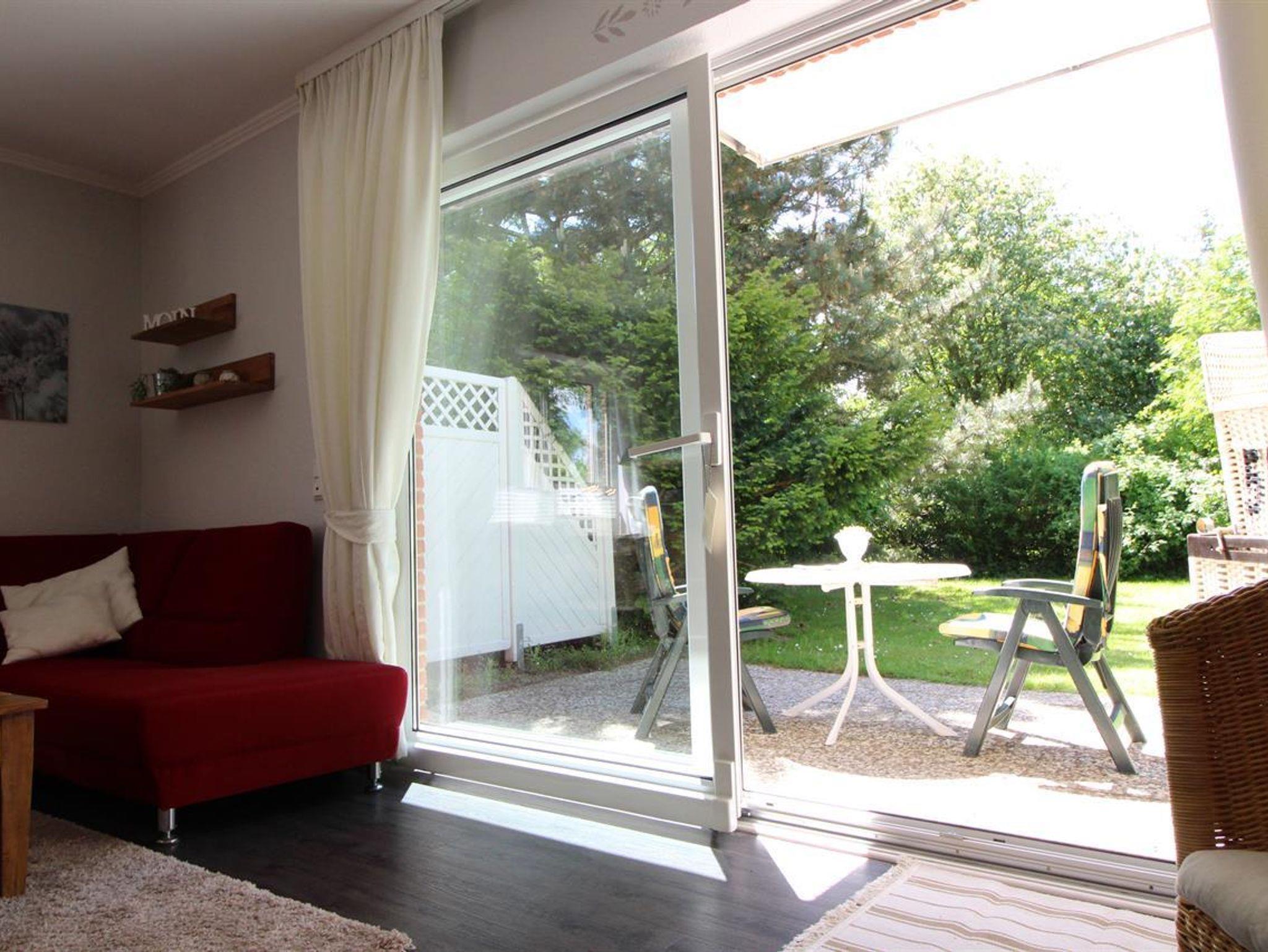 Vom Wohnzimmer gelangen Sie auf die schöne Südterrasse mit Strandkorb und dem 1200 m² uneinsehbaren Gartengrundstück.
