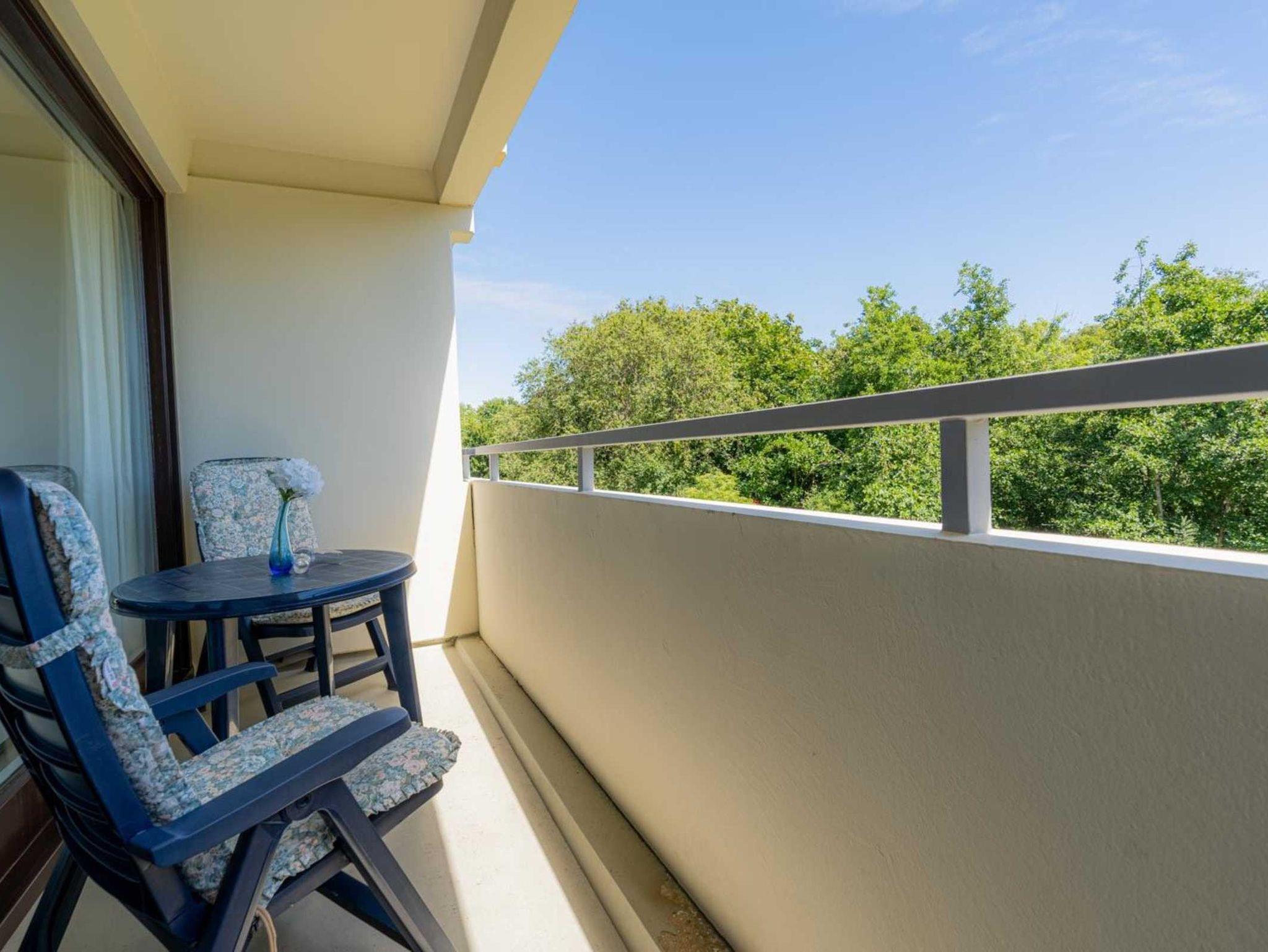 Wohn-/Schlafzimmer mit ausziehbarem Schlafsofa (160x200cm), Einbauschrank, einem Sessel, großem TV (Sat), Stereo-Kompaktanlage und Esstisch mit 4 Stühlen. Direkter Zugang zum überdachten und möblierten Balkon nach Südosten mit Blick auf den Garten und das Wäldchen. Offene Küche mit Backofen und Kühlschrank mit Gefrierfach. Die Küche ist durch einen Tresen vom Wohnzimmer abgeteilt.