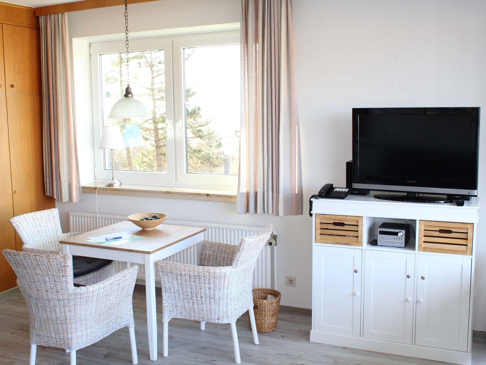 Schlafraum mit 2 Einzelbetten (je Bett 190 x 90), Wohn-Schlafraum mit Schlafcouch (200 x 80) für 1 Person, Essecke, Küchenzeile mit Mikrowelle, Backofen und Geschirrspüler, PVC-Boden, Dusche/WC, Kabel-TV, Durchwahltelefon, Balkon, PKW-Platz-Nr. 38, Aufzug und Fahrradkeller vorhanden. Rezeption, Brötchenservice, Schwimmbad, Sauna kostenpflichtig, kostenfreier Internetzugang (LAN1-Germania).