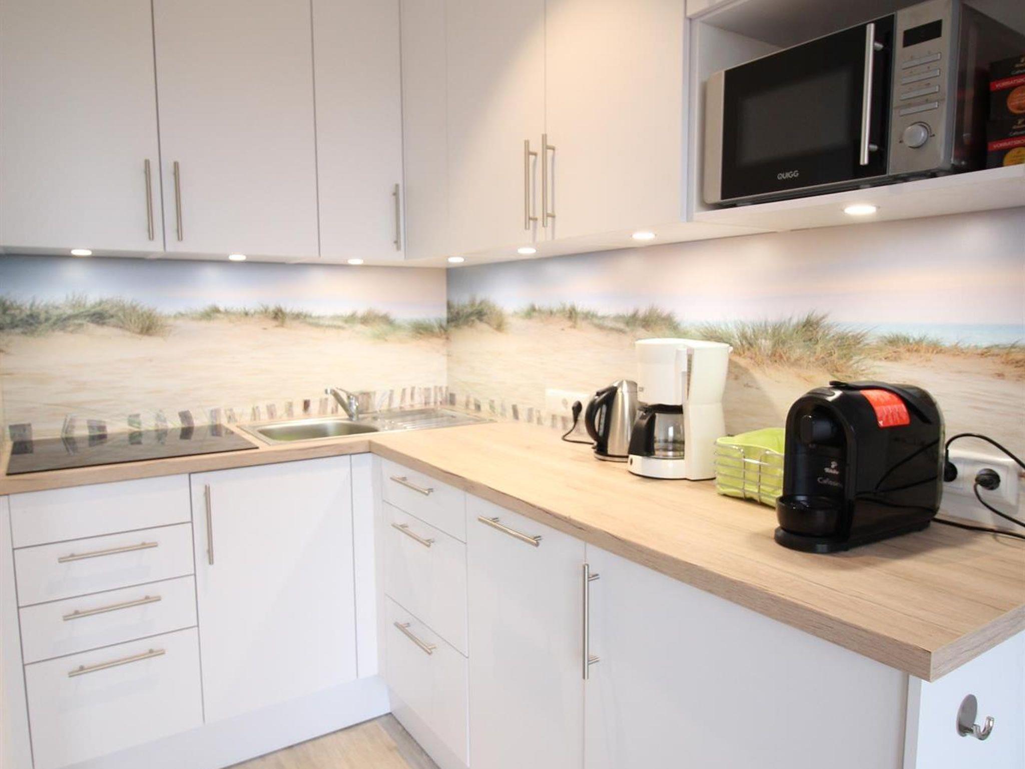 Die hochwertige Küchenzeile in praktischer L-Form lässt keine Wünsche offen: Sie ist ausgestattet mit einem Ceranfeld (vier Kochstellen), Kühlschrank, Geschirrspüler, Mikrowelle und weiteren nützlichen Elektrogeräten – perfekt für die Zubereitung kleiner und großer Mahlzeiten.