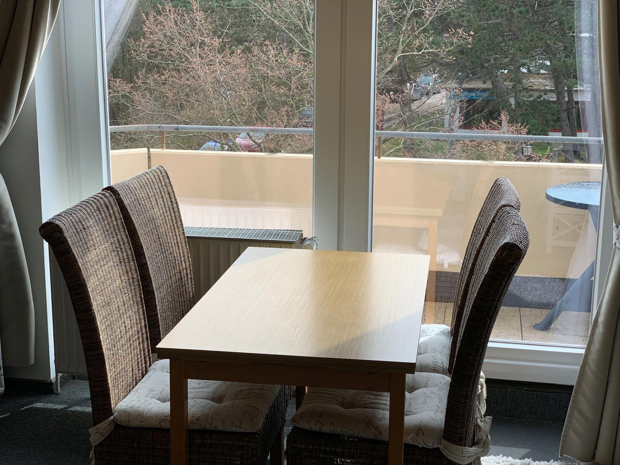 Wohnzimmer: Couch, Couchtisch, 2 Sessel, 2 Hocker, Schrank, 2 Einzelschrankbetten, TV-Tisch, Kabel-TV, Kofferradio, Esstisch, 4 Stühle, Küchenzeile, 4 Plattenherd mit Backofen, Dunstabzugshaube, Kühlschrank, Kaffeemaschine, Wasserkocher, Toaster, Geschirr, Kochtöpfe