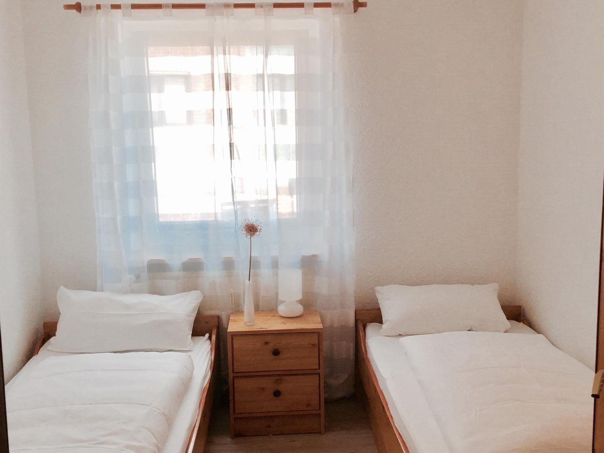 Schlafzimmer: 2 Einzelbetten, Nachttisch, Ablage, Stuhl, Schrank
