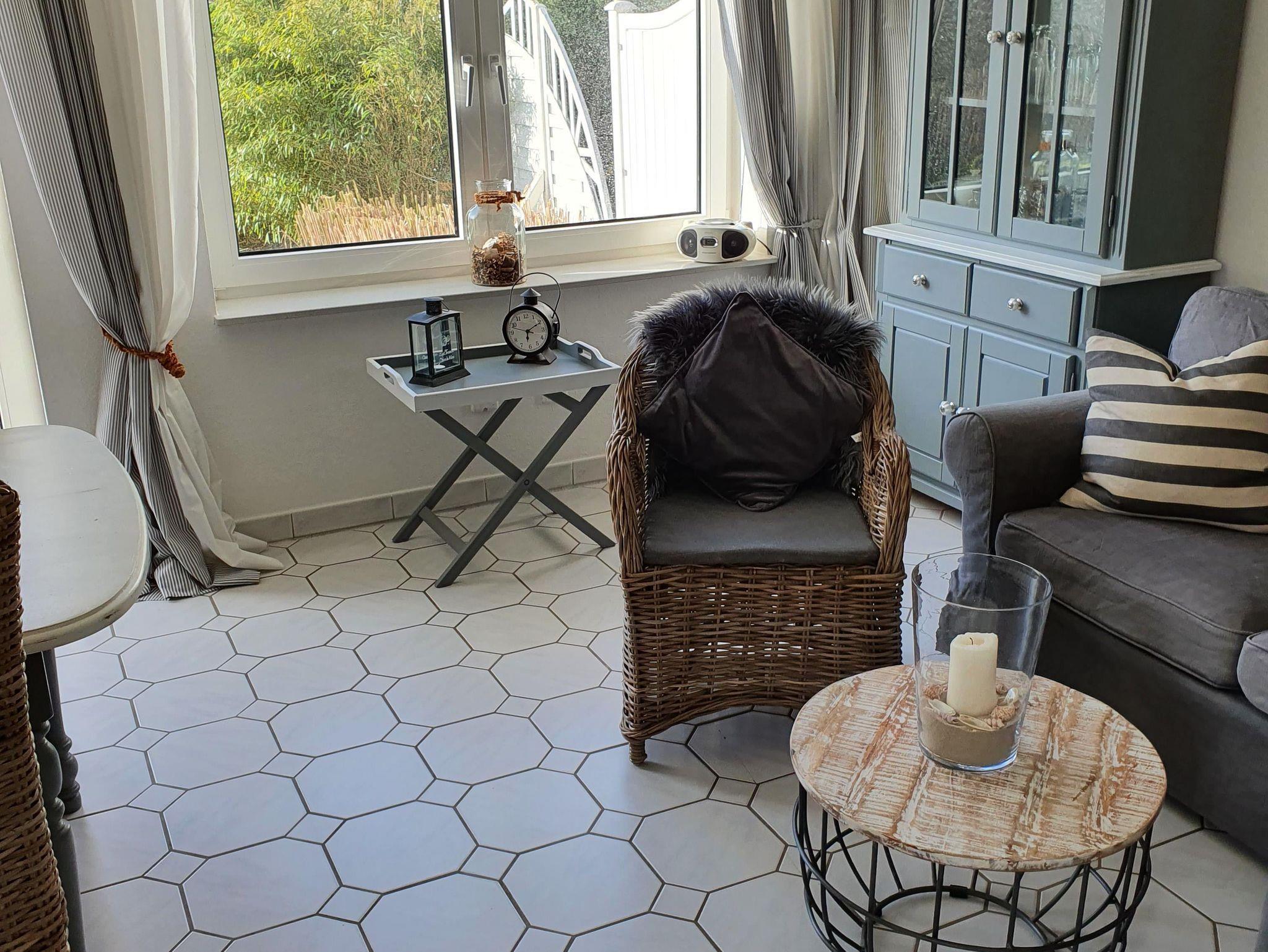 Im Erdgeschoss befinden sich der liebevoll und gemütliche ausgestattete Wohn- und Essbereich im Beach-Stil.
