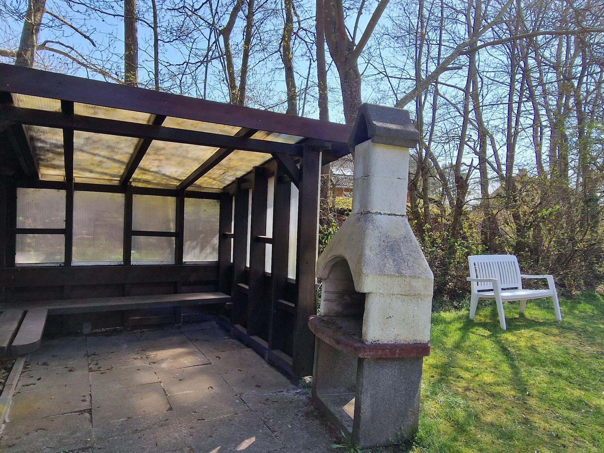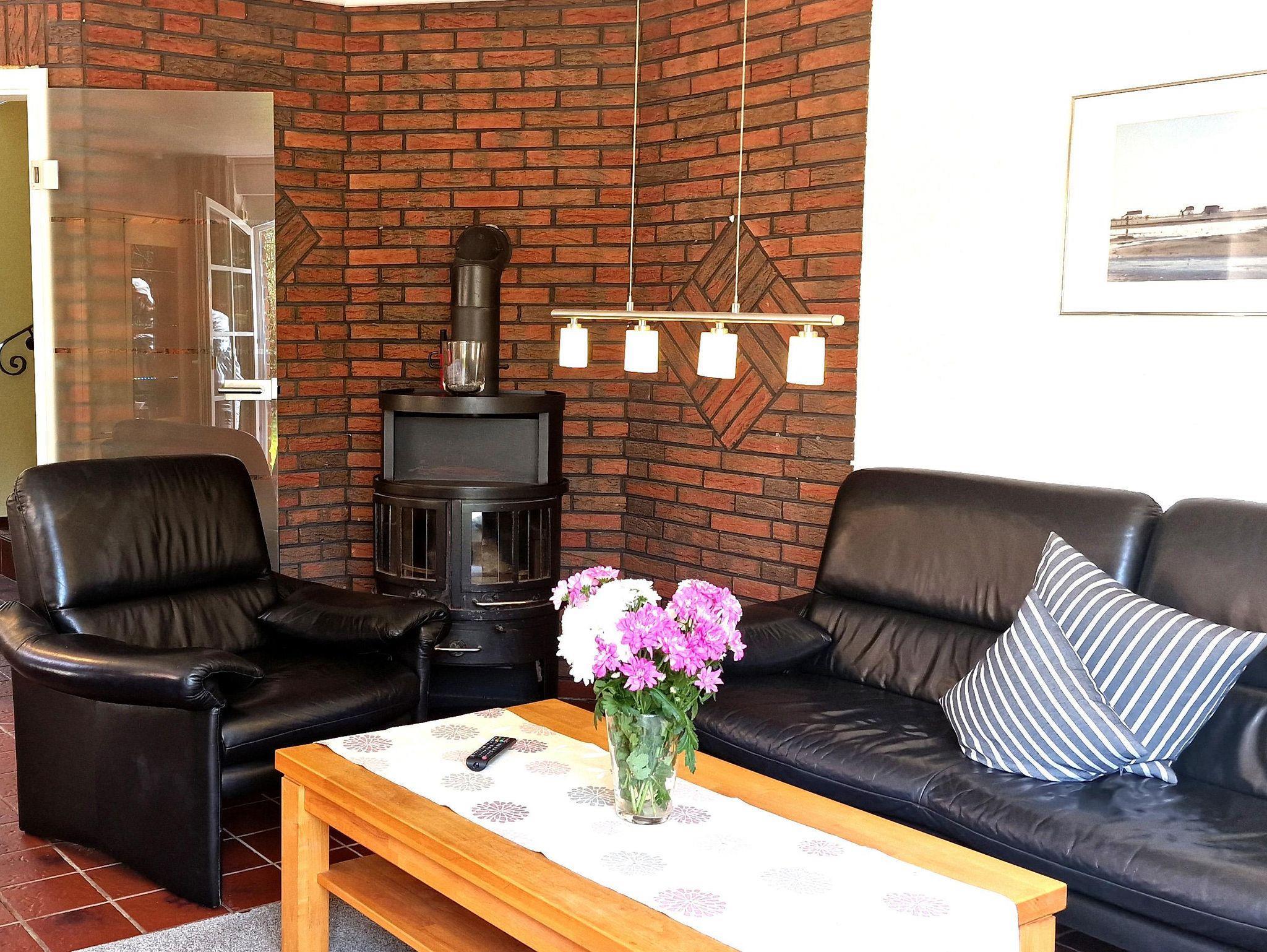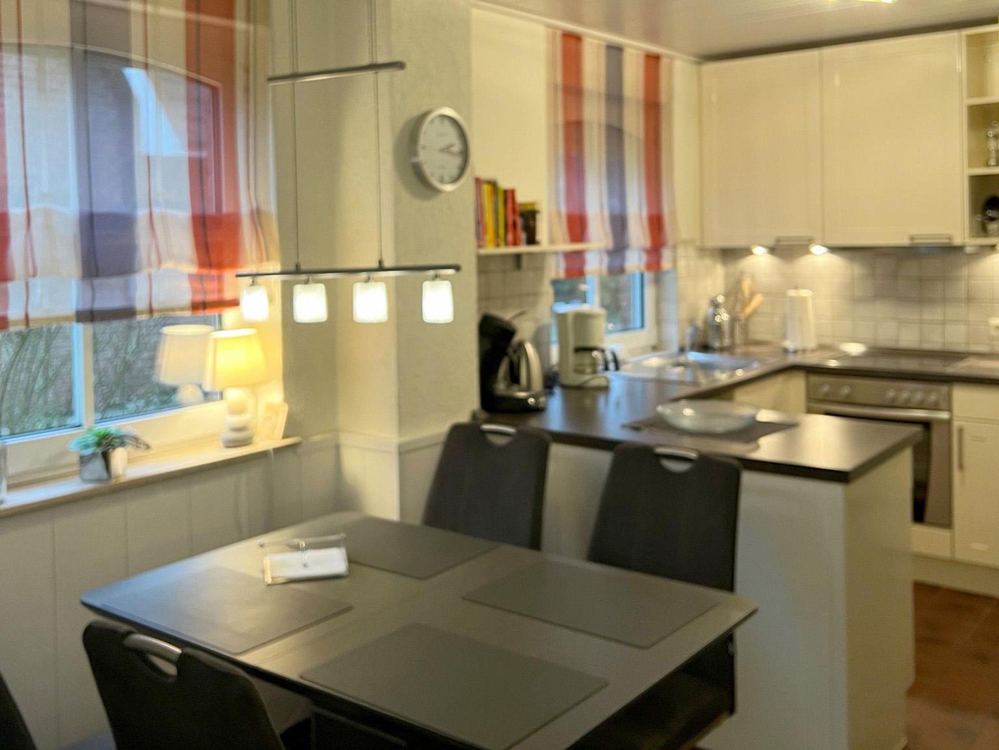 Wohnzimmer: Ledercouch, Couchtisch, Ledersessel, Stehlampe, Nachtspeicherofen, Vitrinenschrank, Kamin nutzbar, Telefon, TV-Untertisch, Sat-TV, Stereoanlage mit DVD-Player, Esstisch, Bank, 2 Stühle, Tischlampe, Einbauküche, 4 Plattenherd mit Ceranfeld und Backofen, Dunstabzugshaube, Kühlschrank, Spülmaschine, Mikrowelle, Kaffeemaschine, Wasserkocher, Toaster, Handmixer, Geschirr, Kochtöpfe