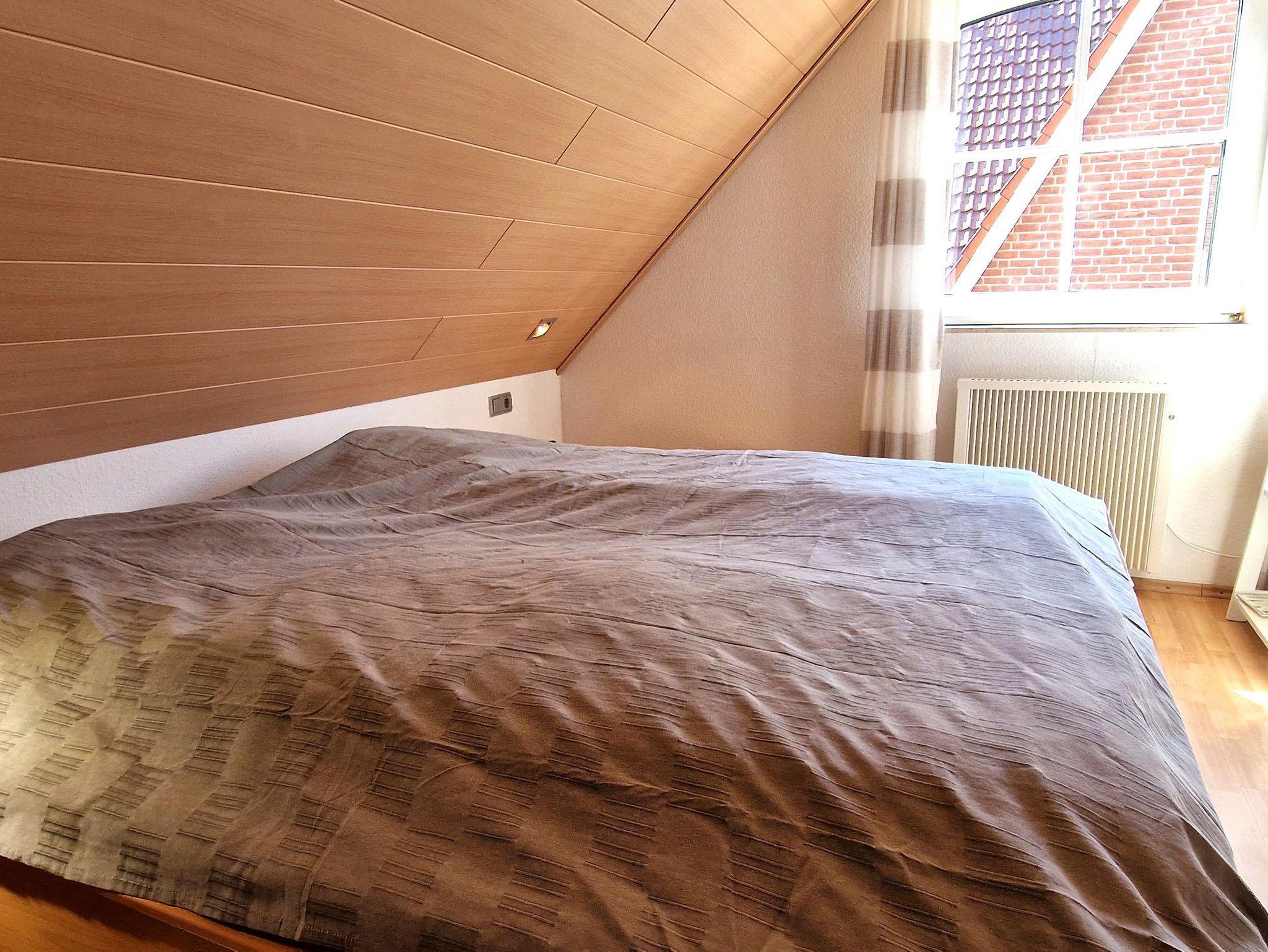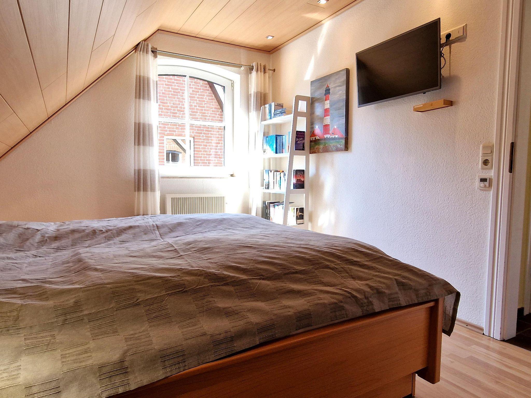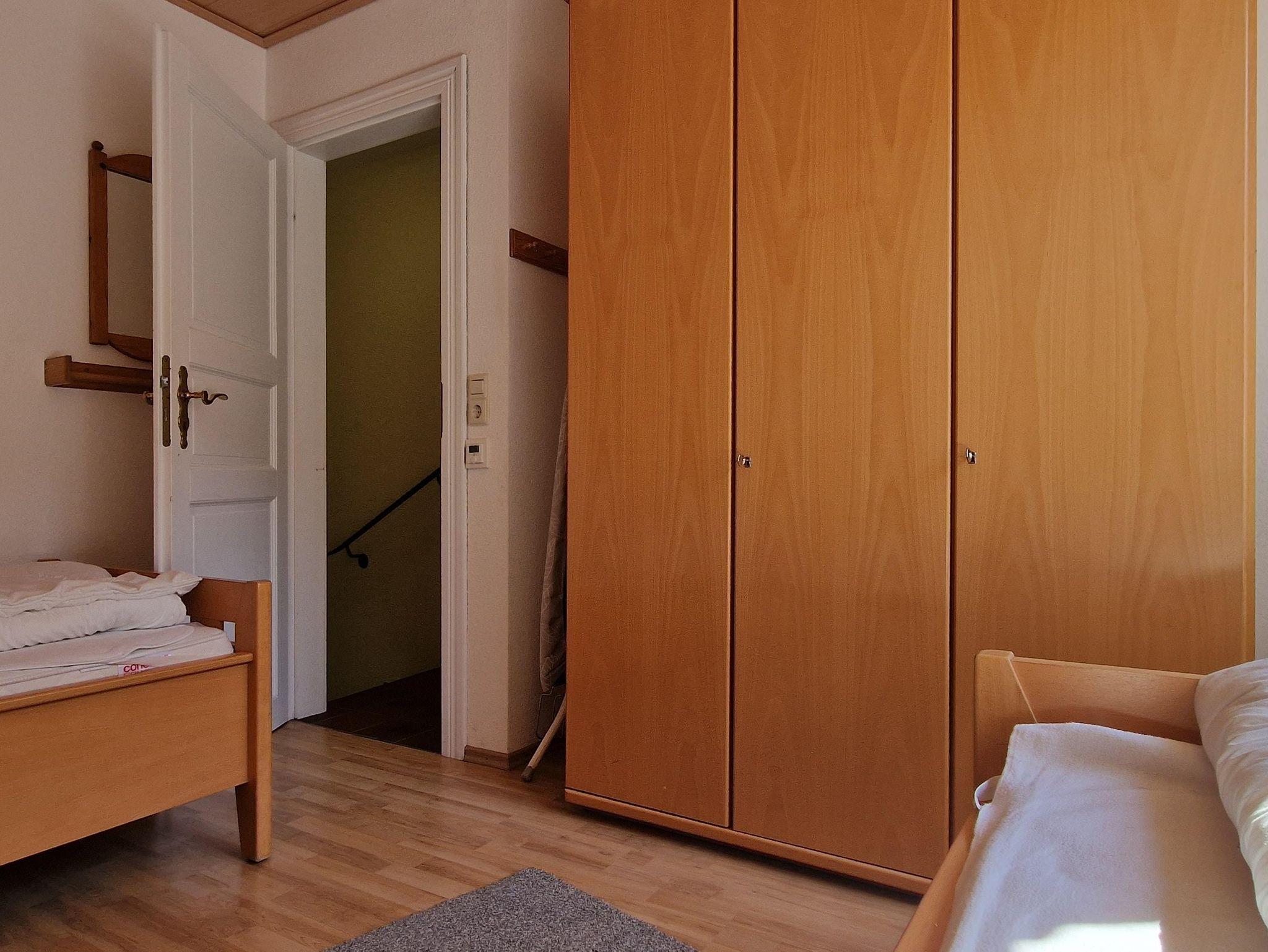 Schlafzimmer: 2 Einzelbetten, 2 Nachttische, 2 Hocker, Buchkiste, Kleiderschrank, Spiegel, Nachtspeicherofen, Radiowecker, Sat-TV, Flachbildschirm