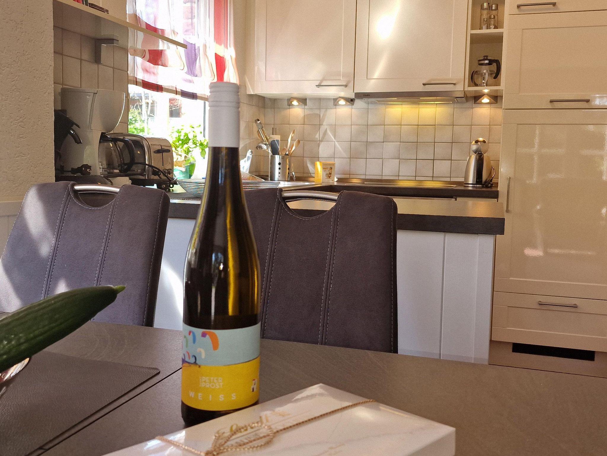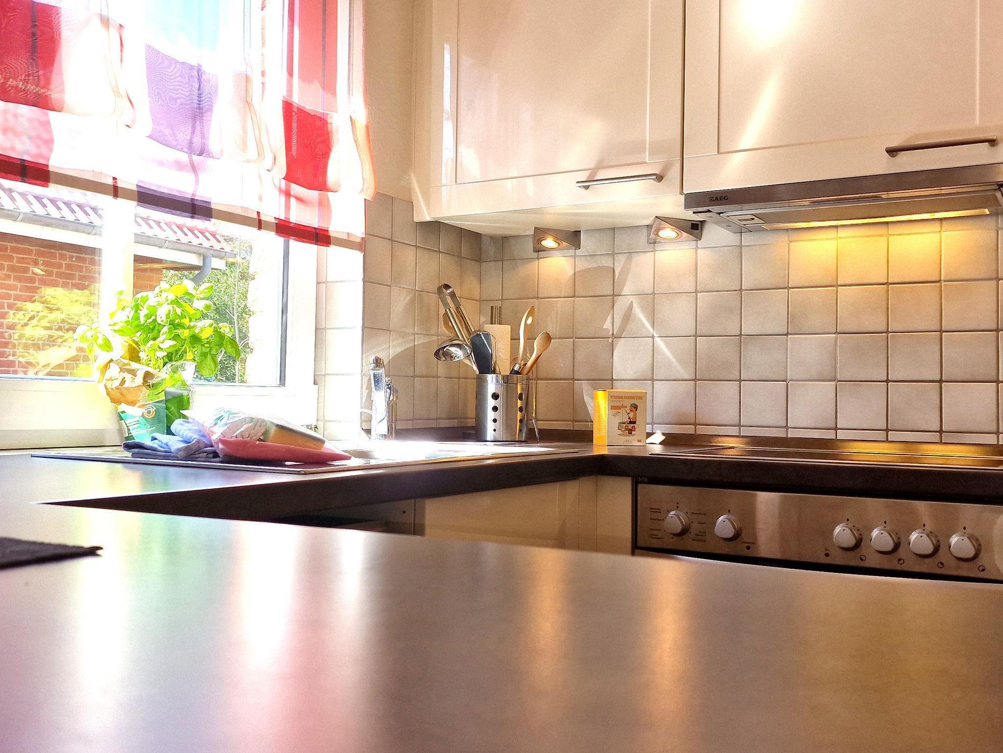 Küche: Einbauküche, 4 Plattenherd, Dunstabzugshaube, Kühlschrank, der Kühlschrank hat im oberen Teil ein kleines Gefrierfach, Kaffeemaschine, Wasserkocher, Toaster, Eierkocher, Mikrowelle, Geschirr, Kochtöpfe
