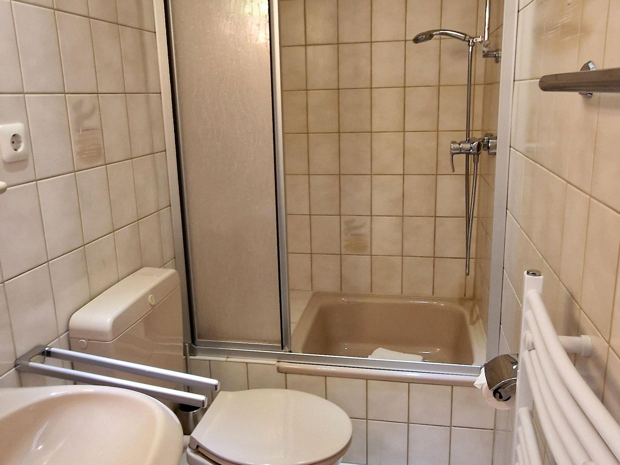 Bad: Dusche, Waschbecken, WC, Waschmaschine, Nachtspeicherofen, Hocker, Schrank, Kosmetikspiegel, Duschkabine, Staubsauge