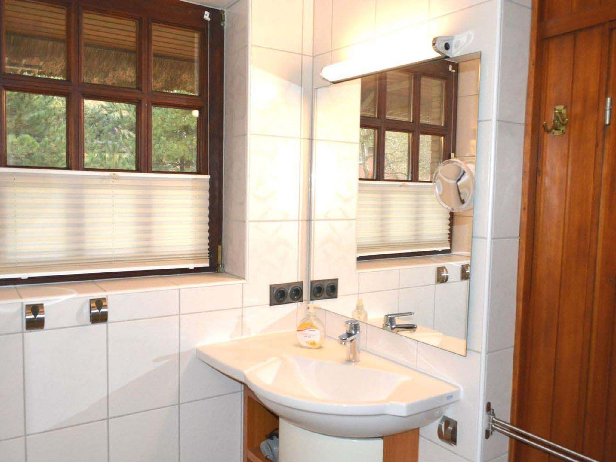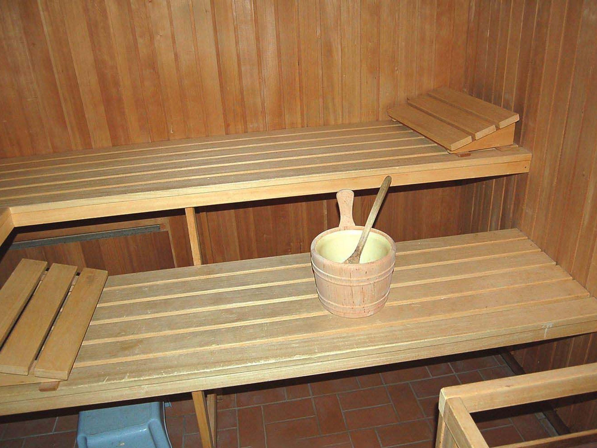 Bad 1: Dusche, kleines Regal, Sauna, Spiegel, Waschbecken, WC