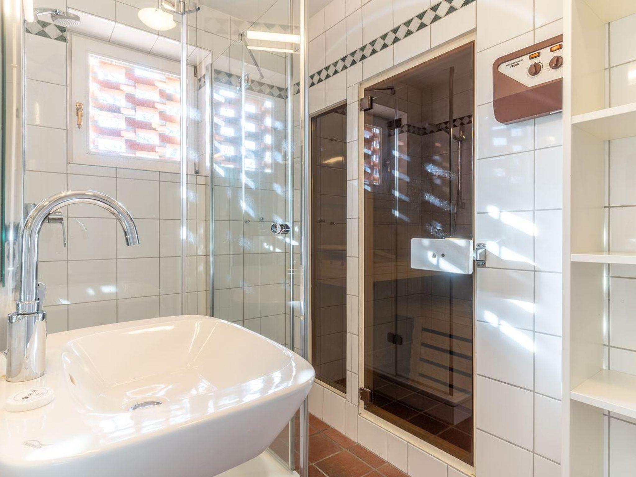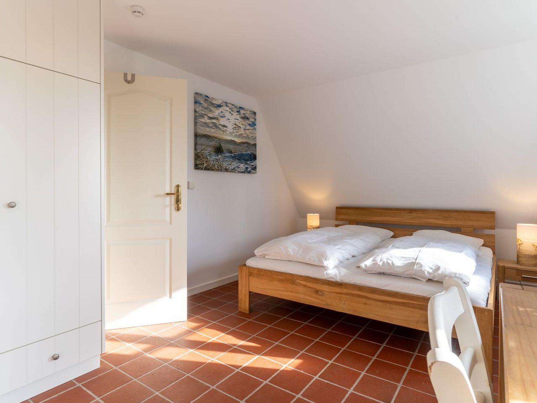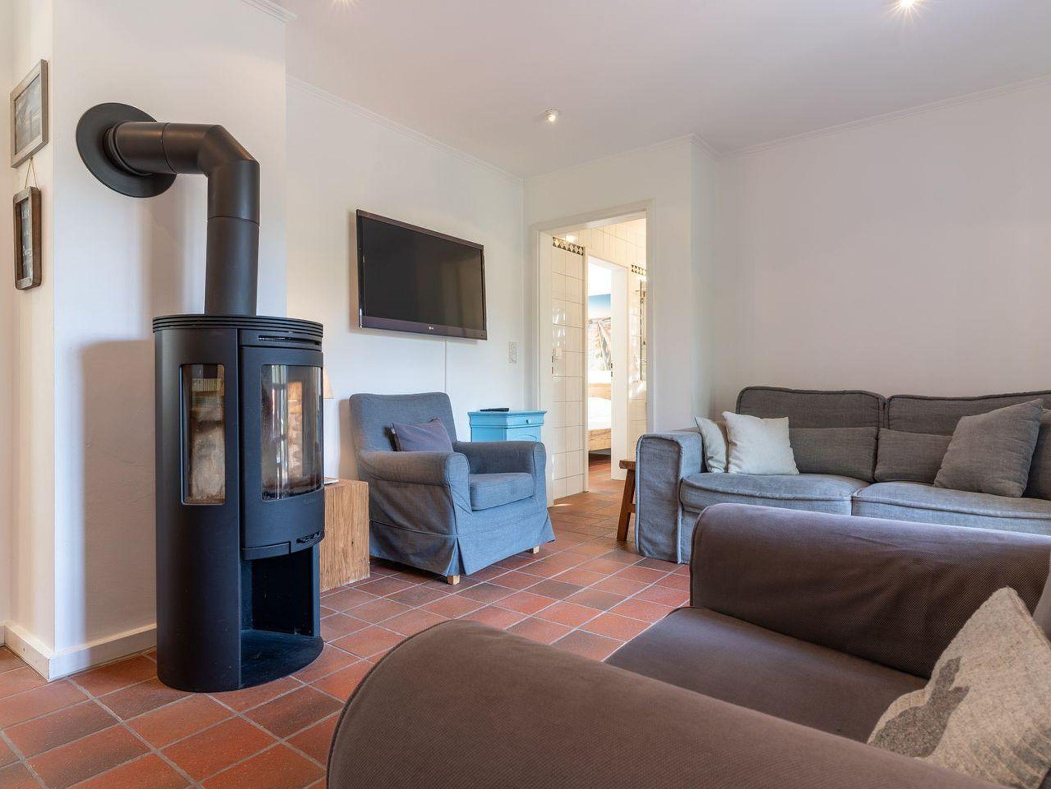 Ein Kamin im Wohnraum bietet ebenso einen warmen Charakter. Die Wohnküche ist mit allen wichtigen Geräten voll ausgestattet und lädt zum gemeinsamen Kochen ein. Im Erdgeschoss ist ebenso ein Doppelschlafzimmer mit großem Einbauschrank, sowie ein Duschbad mit Gäste-WC und einer großzügigen Sauna. Im Empfangsbereicht ist ein Flur mit Garderobe, von hier aus gelangt man in das Obergeschoss. Hier befinden sich 2 Doppelschlafzimmer, eines mit Doppelbett und das Andere mit 2 Einzelbetten. Große Fenster sorgen für viel Licht, in diesem Haus kann der Sonnenauf- bzw. -untergang genossen werden. Außerdem ist im Obergeschoss ein Duschbad und ein Chill-out-room mit einem Schreibtisch.