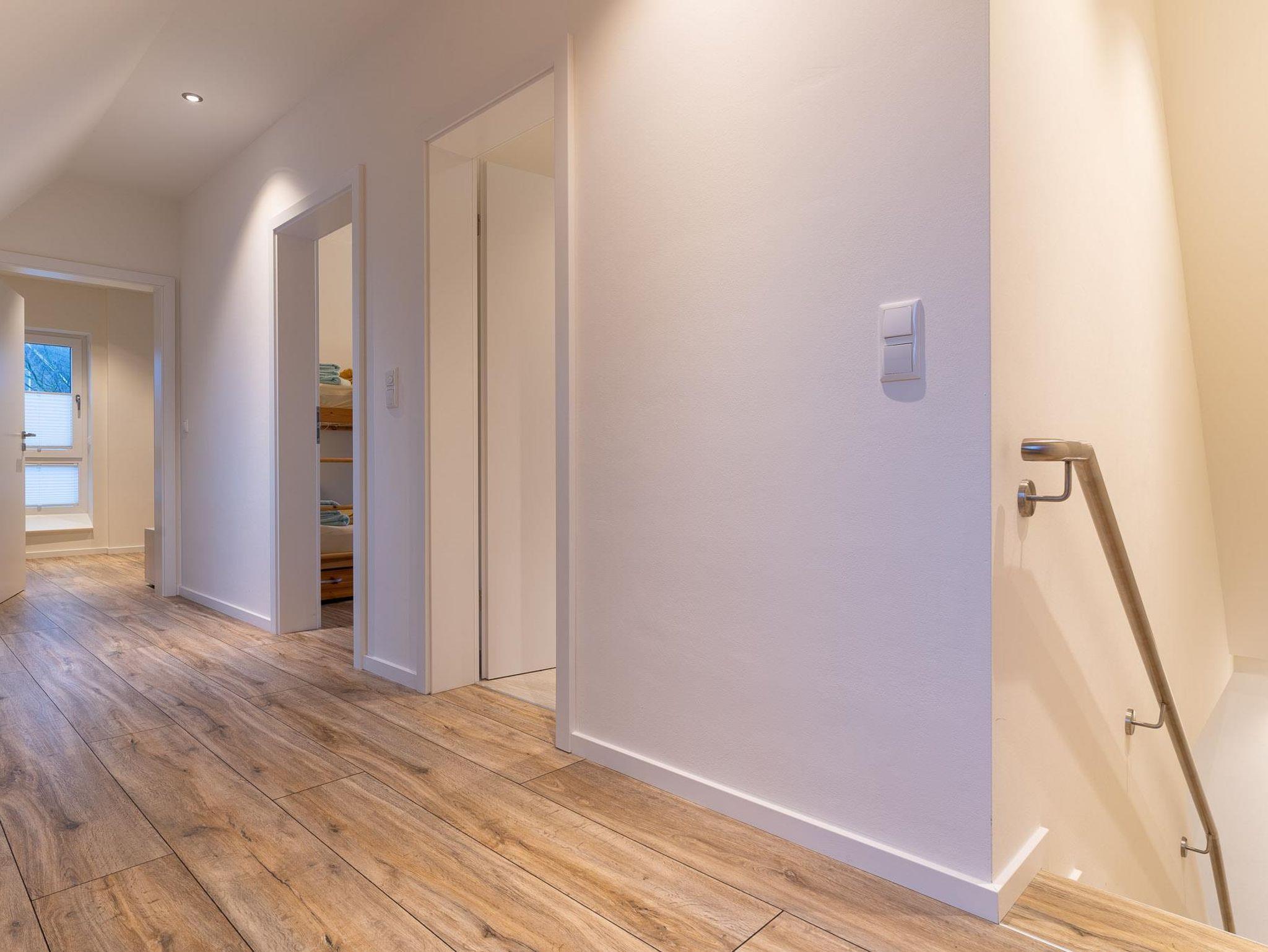 Cerankochfeld, Kaffeemaschine, Mikrowelle, Geschirrspülmaschine, Wasserkocher, Mixer, Toaster, Pürierstab ausreichend Besteck und Geschirr für jeweils 6 Personen finden Sie in der Küche vor. Jede Wohnung verfügt im Elternschlafzimmer (DG) über ein Doppelbett 180 x 200 cm, im Kinderzimmer (DG) über ein Etagenbett 90 x 200 cm, in einem weiteren Kinderzimmer im Erdgeschoss über ein Einzelbett mit Ausziehbett („Freundschaftsbett“) 90 x 190 cm. Das Bad im OG verfügt über ein Doppelwaschbecken, WC, bodentiefe Dusche, einen Handtuchtrockner und einen Fön.